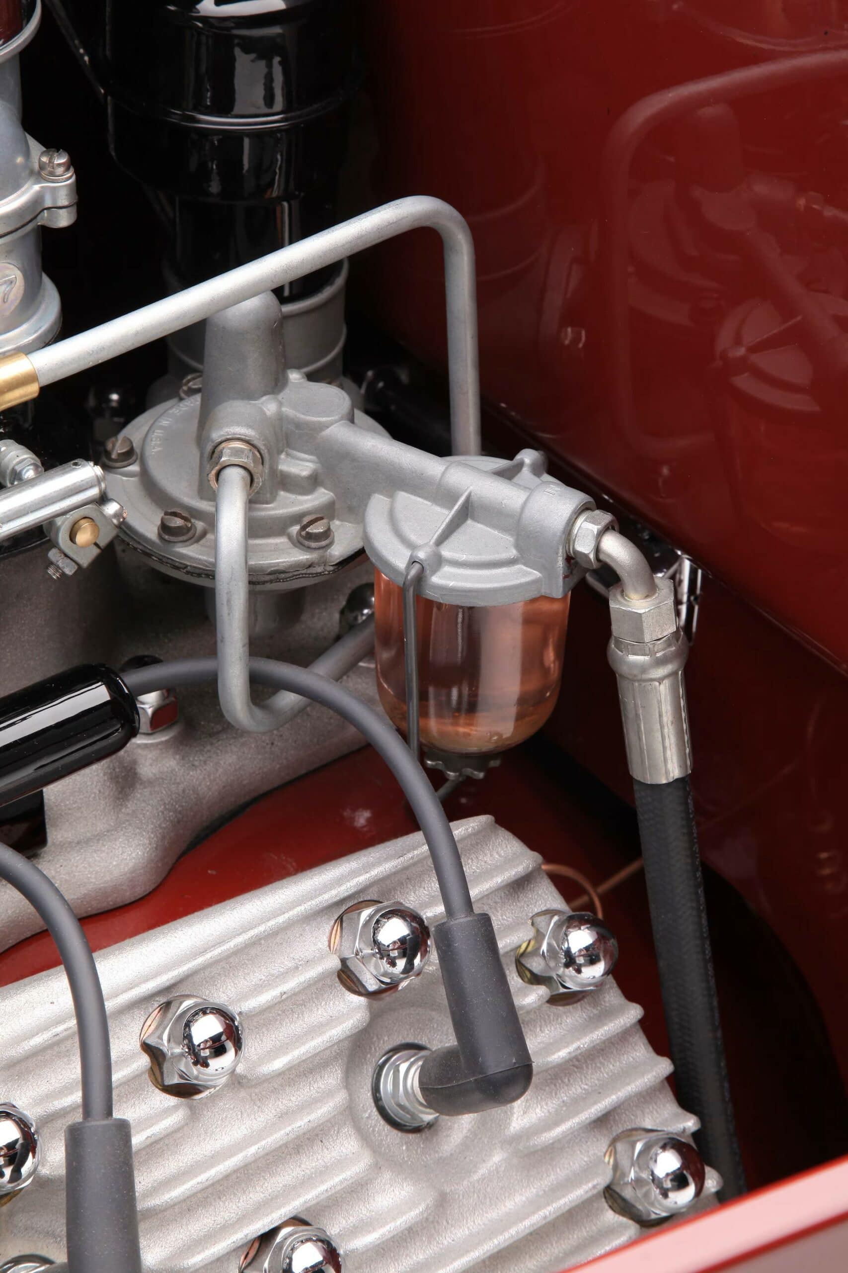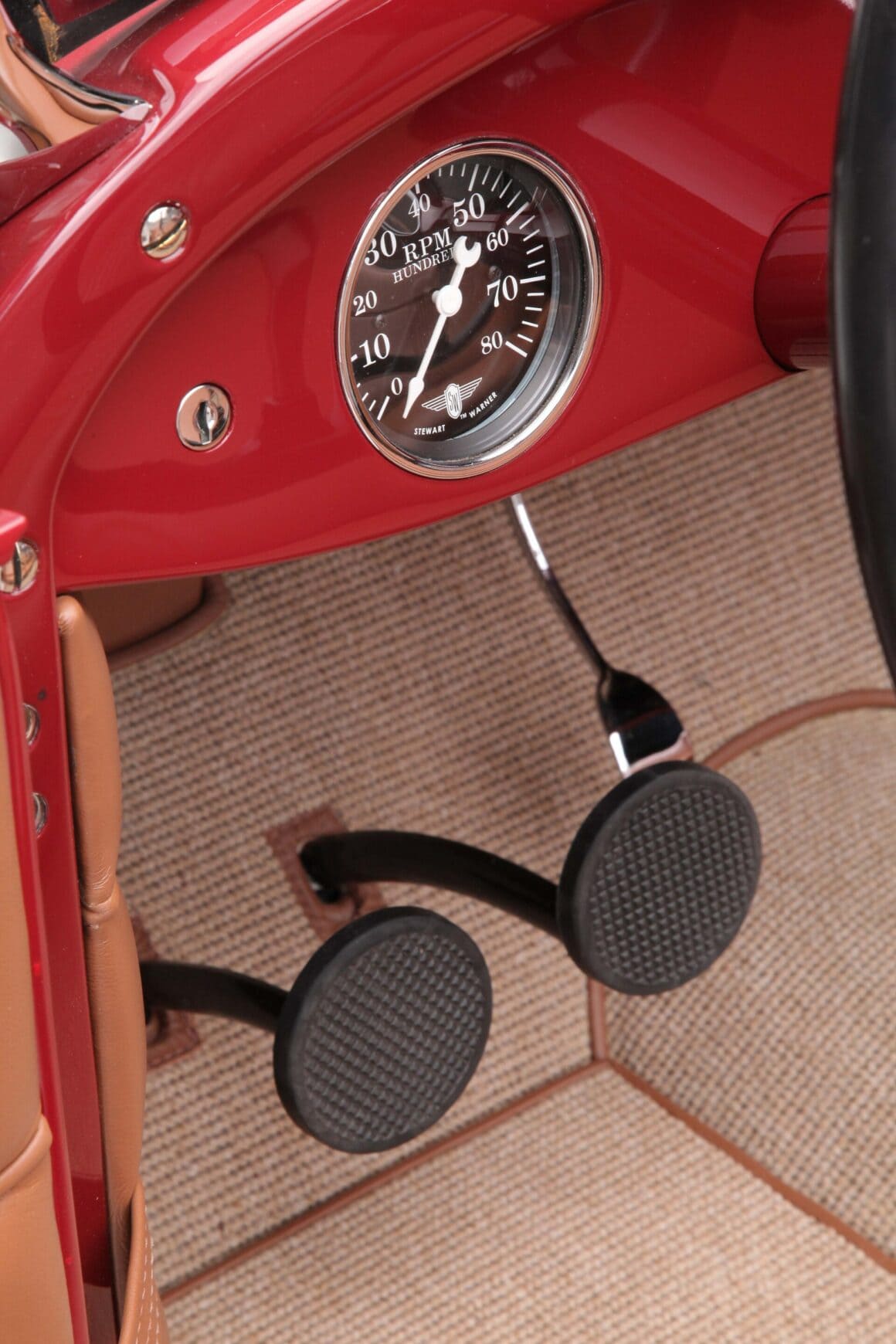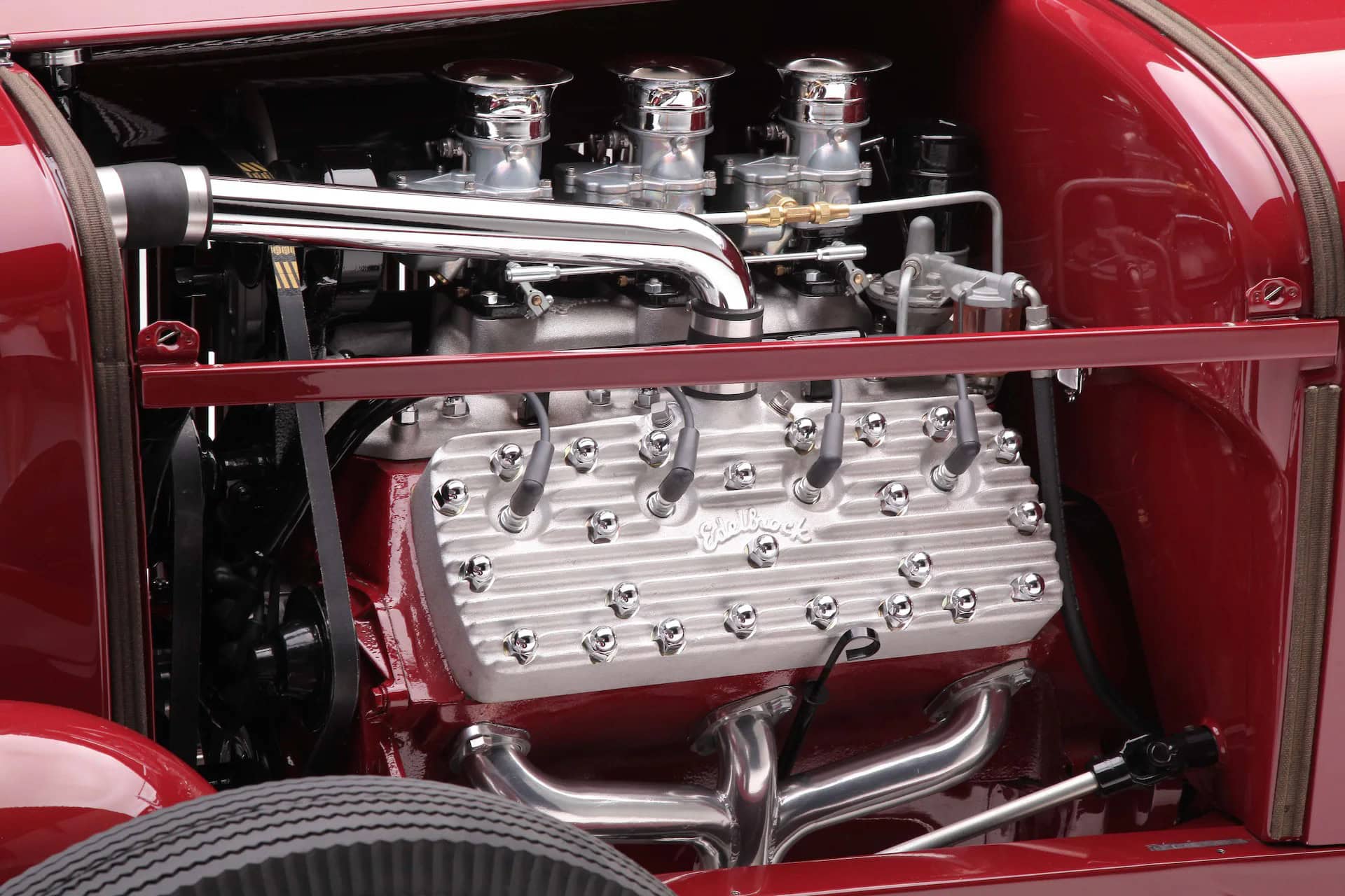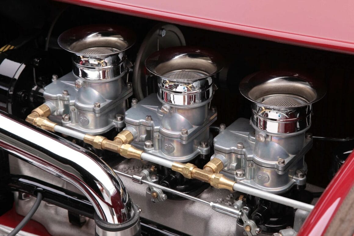 Ils sont dissimulés par un couvercle de type ventre. La banquette arrière est articulée pour s’incliner vers l’avant afin d’accéder au goulot de remplissage. Un tuyau en Y dirige l’essence vers les réservoirs et une seule pompe et un égaliseur déplacent le carburant vers le moteur Flathead. Al Edwards à Albuquerque a utilisé des composants classiques pour assembler le V8 Flathead, construit à l’origine en 1946. Les cylindres ont été réalésés à 0,040 et chargés avec des pistons Offenhauser faisant tourner un vilebrequin Merc de 1952. Les cames et ressorts de soupape proviennent d’Ed Iskenderian, et les culasses et le collecteur d’admission de chez Edelbrock. Les Triple carbus sont des Stromberg 97. Les collecteurs à décharge centrale revêtus de HPC canalisent les gaz vers ses silencieux personnalisés. Un radiateur haut débit, un ventilateur mécanique et une pompe à eau Drake maintiennent la température sous contrôle.