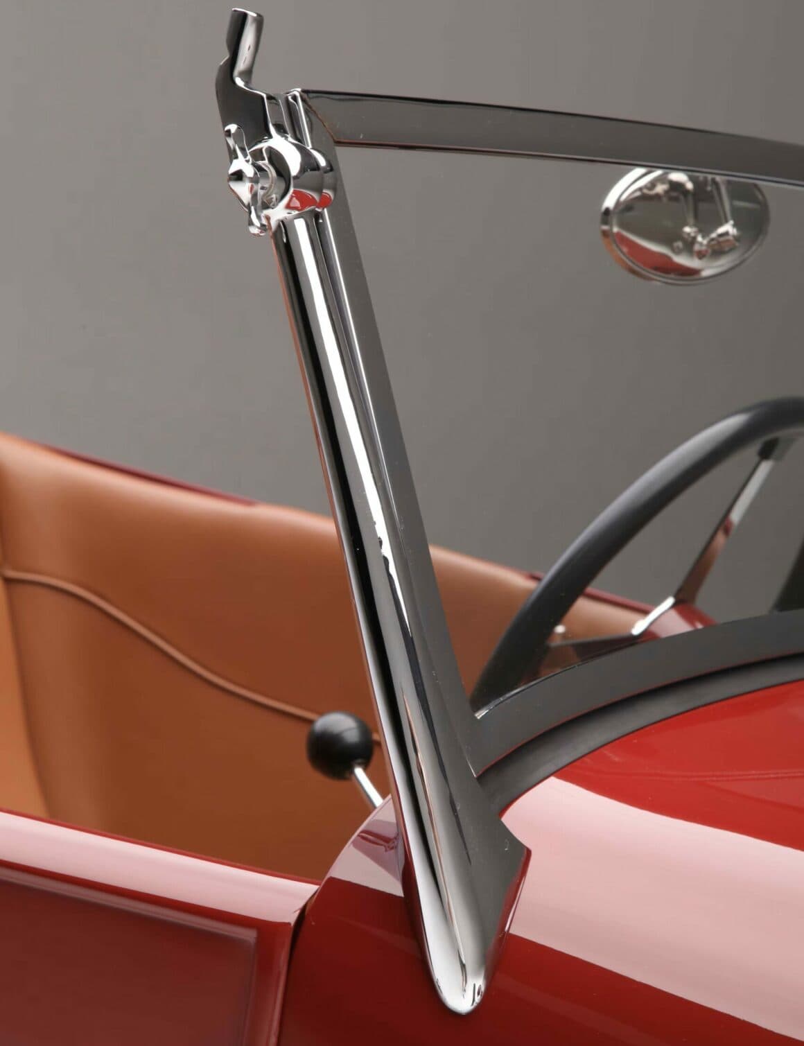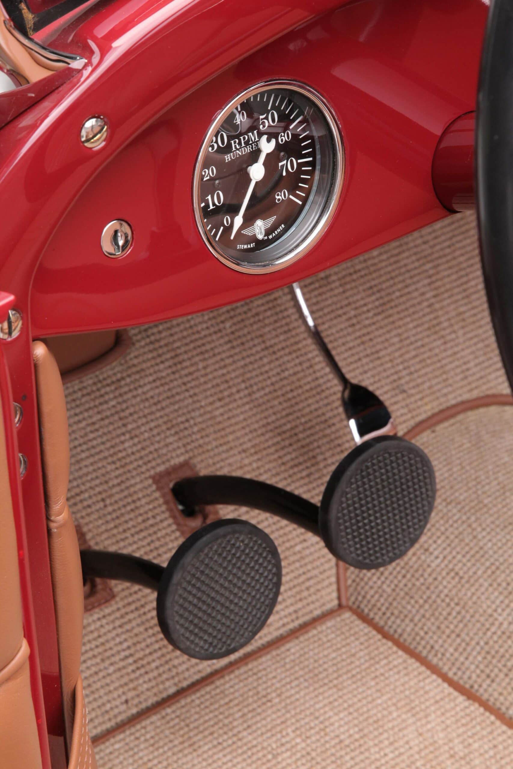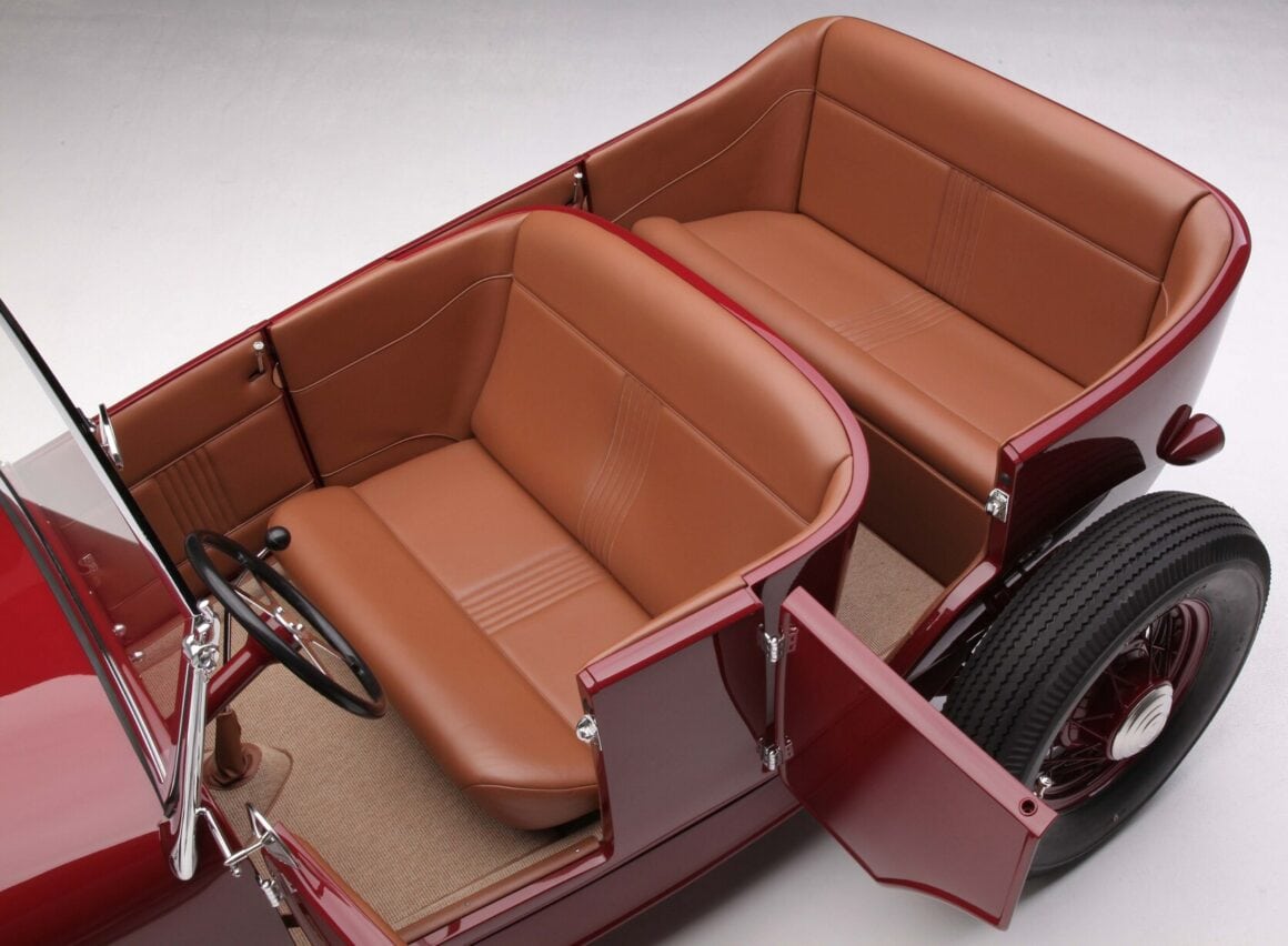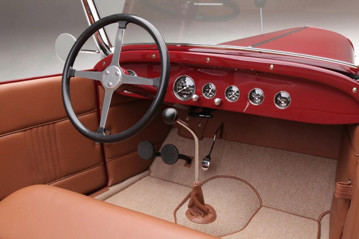 L’adaptation d’un V8 Chevy S-10 T5 Flathead, comme l’a fait Jamie, est une modification populaire dans le Hot Rodding. À l’intérieur de la voiture, le tableau de bord d’origine a été modifié pour un ensemble de compteurs Stewart Warner Wings à face noire. Le style traditionnel se poursuit avec le volant Bell à quatre branches, la pédale d’accélérateur est une “cuillère” de 1932, les pédales de frein et d’embrayage sont d’authentiques Ford de 1939 de même que le rétroviseur intérieur Ford de 1936 et la poignée de levier de vitesses de 1939 (adaptée au levier de vitesses T5). “Hot Rod Haven” et “Ron Mangus Hot Rod Interiors” collaborent à la construction de Hot-Rods depuis près de 20 ans. Pour le Phaéton de Jamie, Ron a recouvert les banquettes et les panneaux personnalisés de cuir beige, cousant un design simple et élégant qui convient à tout le style de la voiture.