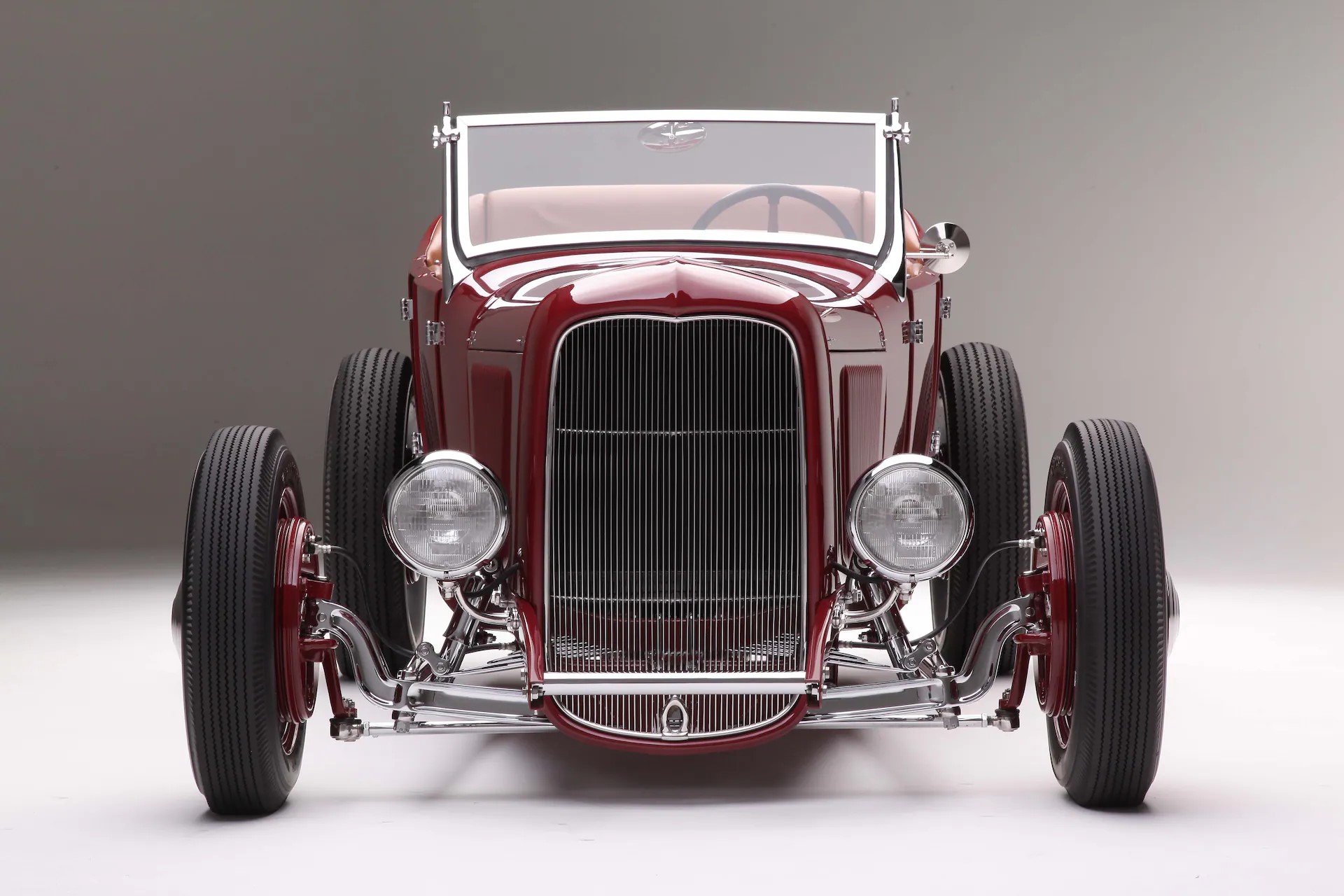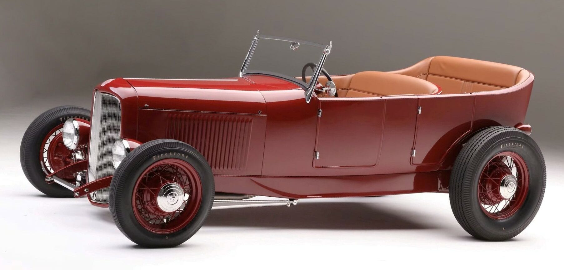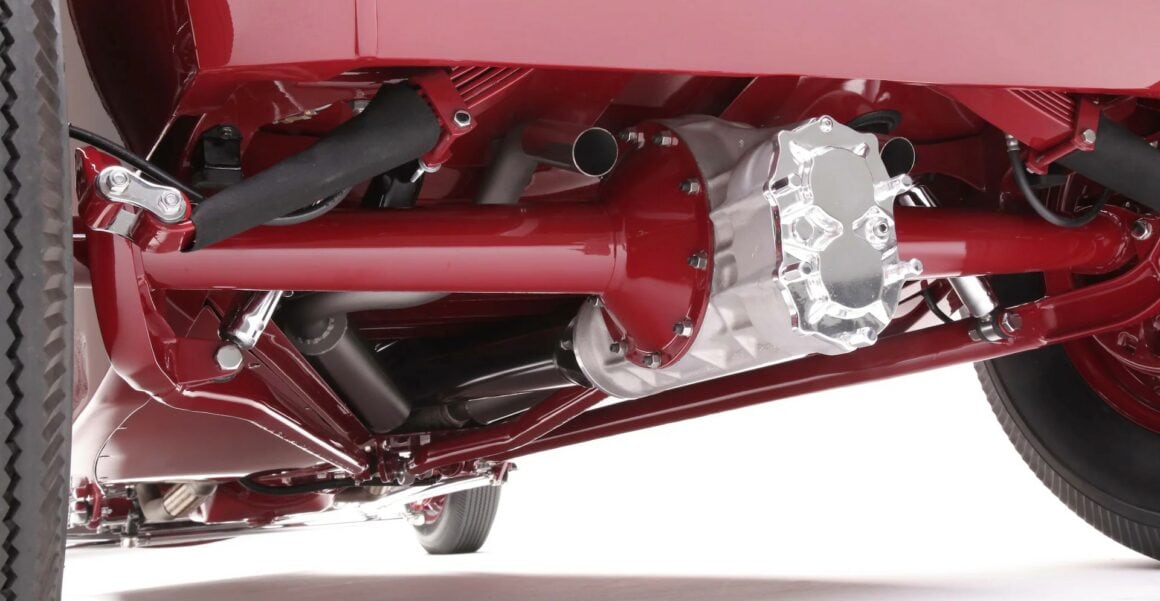 Jamie et Jim ont travaillé ensemble sur la carrosserie avant de confier la voiture au peintre Sean Sena. Jamie a choisi une couleur rouge mandarine inspirée des années 40 qui n’est ni claire ni foncée et Sena a pulvérisé la peinture R-M. La fabrication du châssis a présenté quelques défis. Jamie a utilisé un ensemble de longerons de 1932 au lieu du châssis du modèle T fourni avec la voiture. Il a modifié l’empattement et rétréci le châssis pour s’adapter à la longue carrosserie du Phaéton. Le châssis est renforcé par des traverses avant et arrière modèle A et un X central, situé pour positionner correctement les pneus arrière avec les passages de roue. Les cornes du châssis avant ont été allongées de 5 pouces et ont été sévèrement pincées. Les cornes arrière ont été balancées derrière l’essieu. Conformément au style traditionnel, la suspension est dotée d’un essieu avant en I abaissé de 1932.
