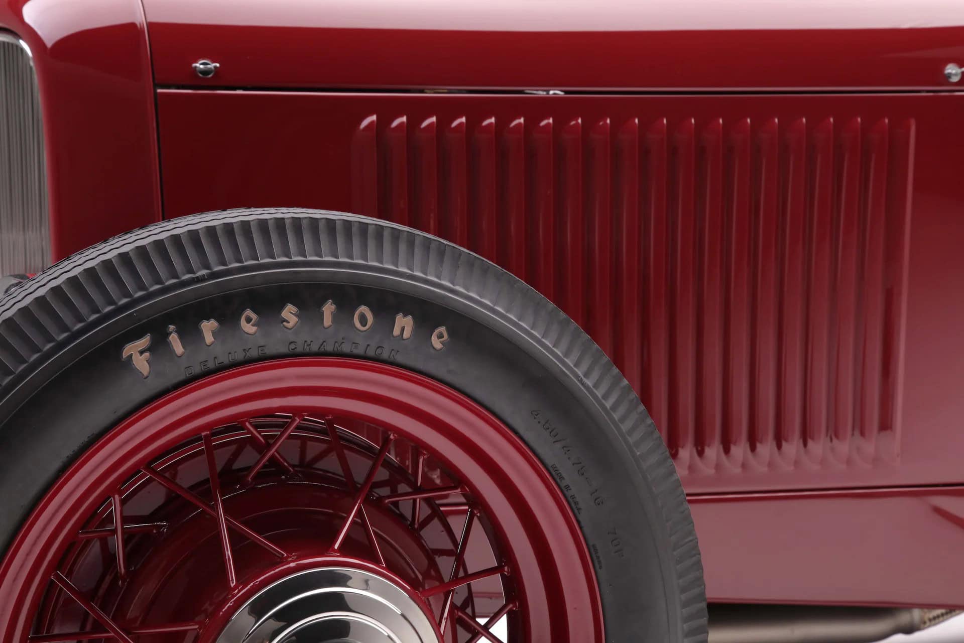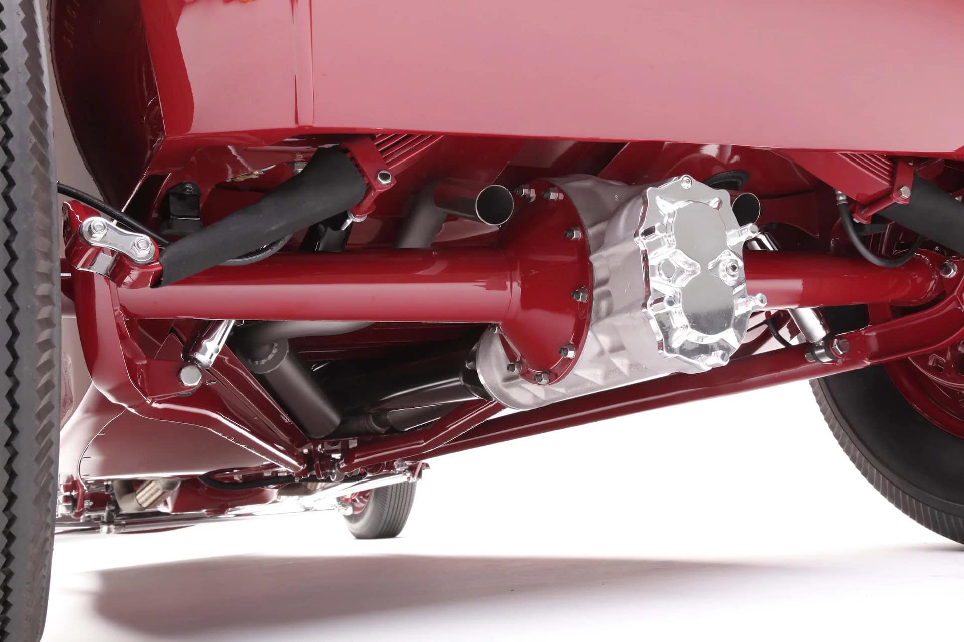 Il a a aussi des triangles fendus en acier inoxydable poli et de broches Ford de 1940. À l’arrière, un pont Rodsville contient des engrenages à coupe droite en 4,11:1. Des ressorts à lames transversaux et des amortisseurs SO-CAL (montés derrière les essieux) adoucissent la conduite. Les freins avant et arrière de la Ford de 1940 sont alimentés par un maître-cylindre Mustang de 1967. Le Phaeton roulait sur des Ford chromées de 1940 pour ses débuts dans la GNRS, mais pour les Street Rod Nats, celles-ci ont été remplacéees par des jantes à rayons Ford 1935 de 16 pouces à l’avant et 18 pouces à l’arrière pour ajouter quelque chose d’autre sur lequel les cerveaux peuvent travailler. Les pneus à carcasse diagonale Firestone 4.50-16 et 700-18 de Coker, sont parfaitement assortis aux jantes fils. Des réservoirs de carburant doubles d’une capacité de 26 gallons sont montés entre le membre en X (c’est porno tout ça ?)…