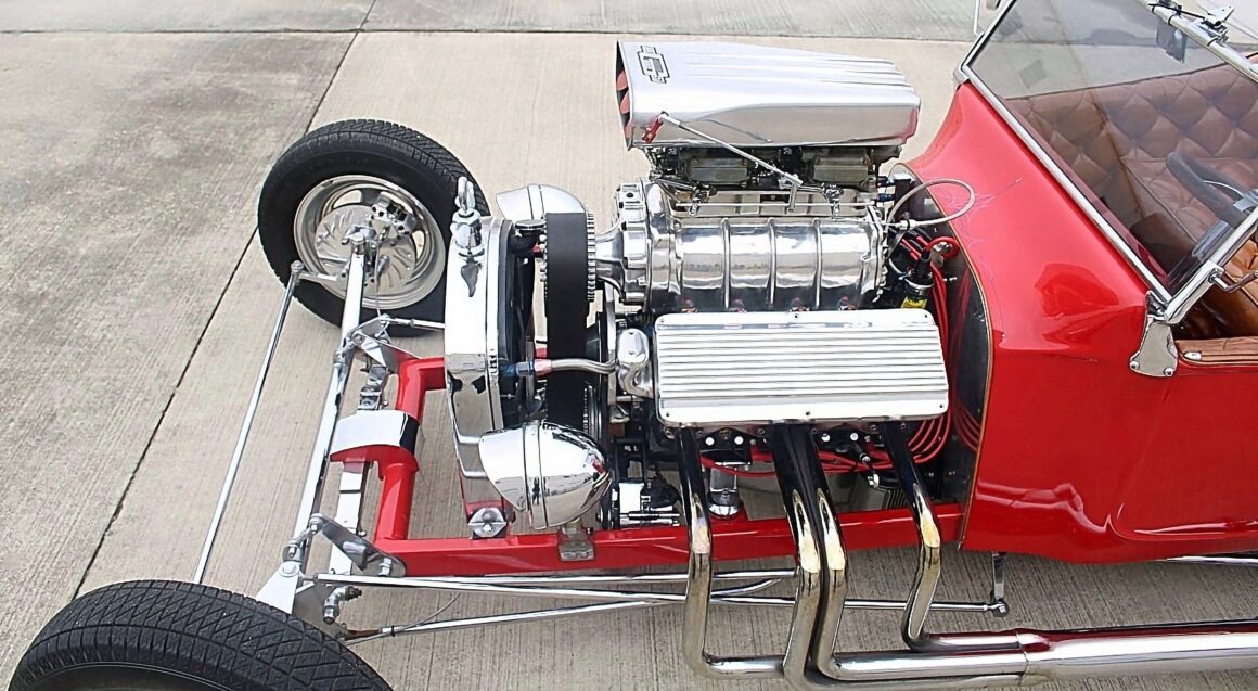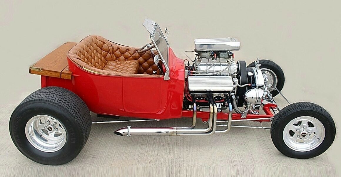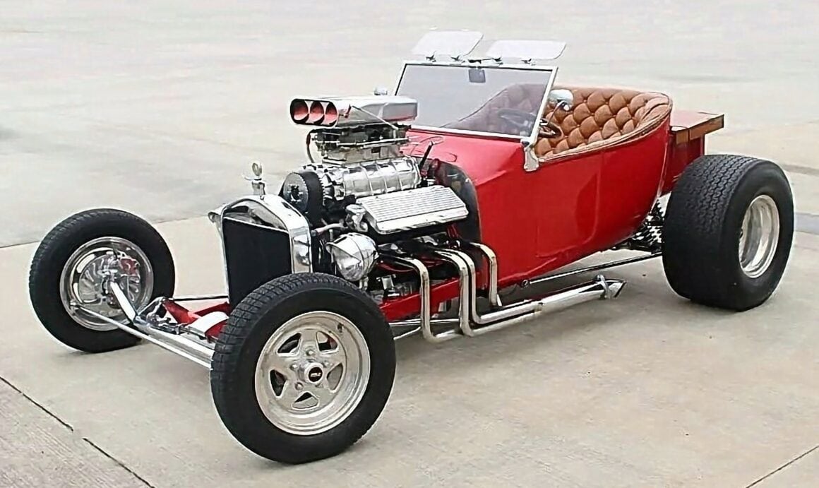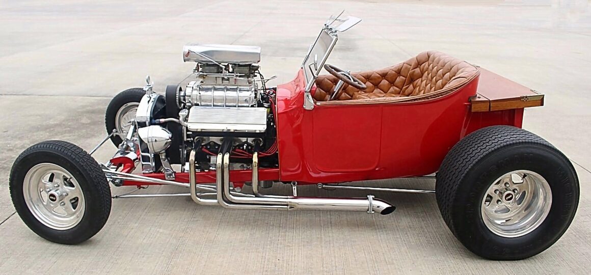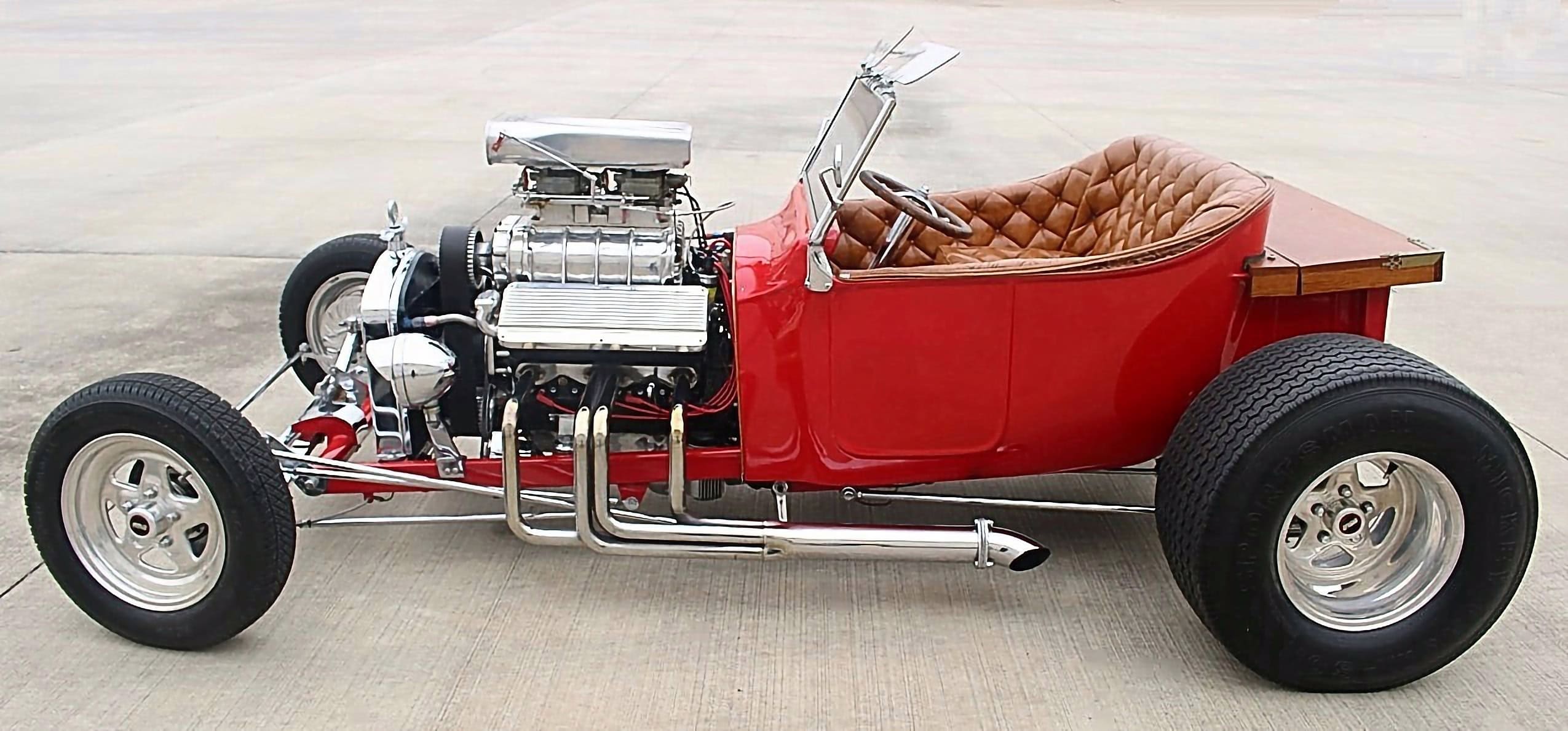 Pour illustrer ce texte et rendre le tout totalement incompréhensible mais malgré-tout de haute volée littéraire, sachez qu’analyser le Hot Rodding n’est pas beaucoup plus simple que de décrire scientifiquement un authentique Hot Rod reconstruit… Ce T-Bucket sert donc de base, mais celui-ci a quelques extras qui le rendent unique. Ce Hot Rod’23 est propulsé par un V8 350ci suralimenté par un compresseur. La puissance ainsi obtenue passe aux roues arrière par l’intermédiaire d’une transmission automatique à 3 vitesses GM TH350. L’énorme compresseur Weiand étant alimenté par deux carburateurs Holley 4BBL.