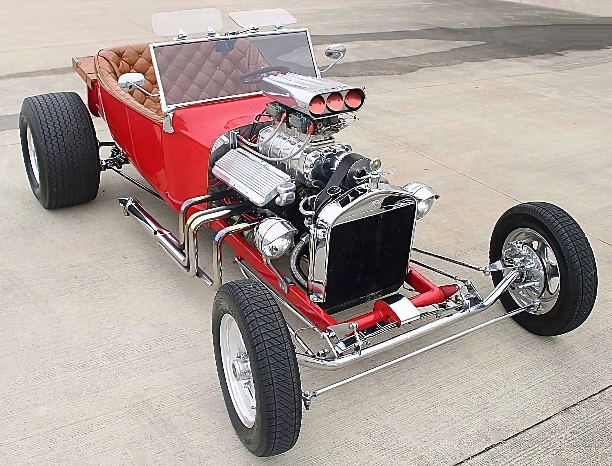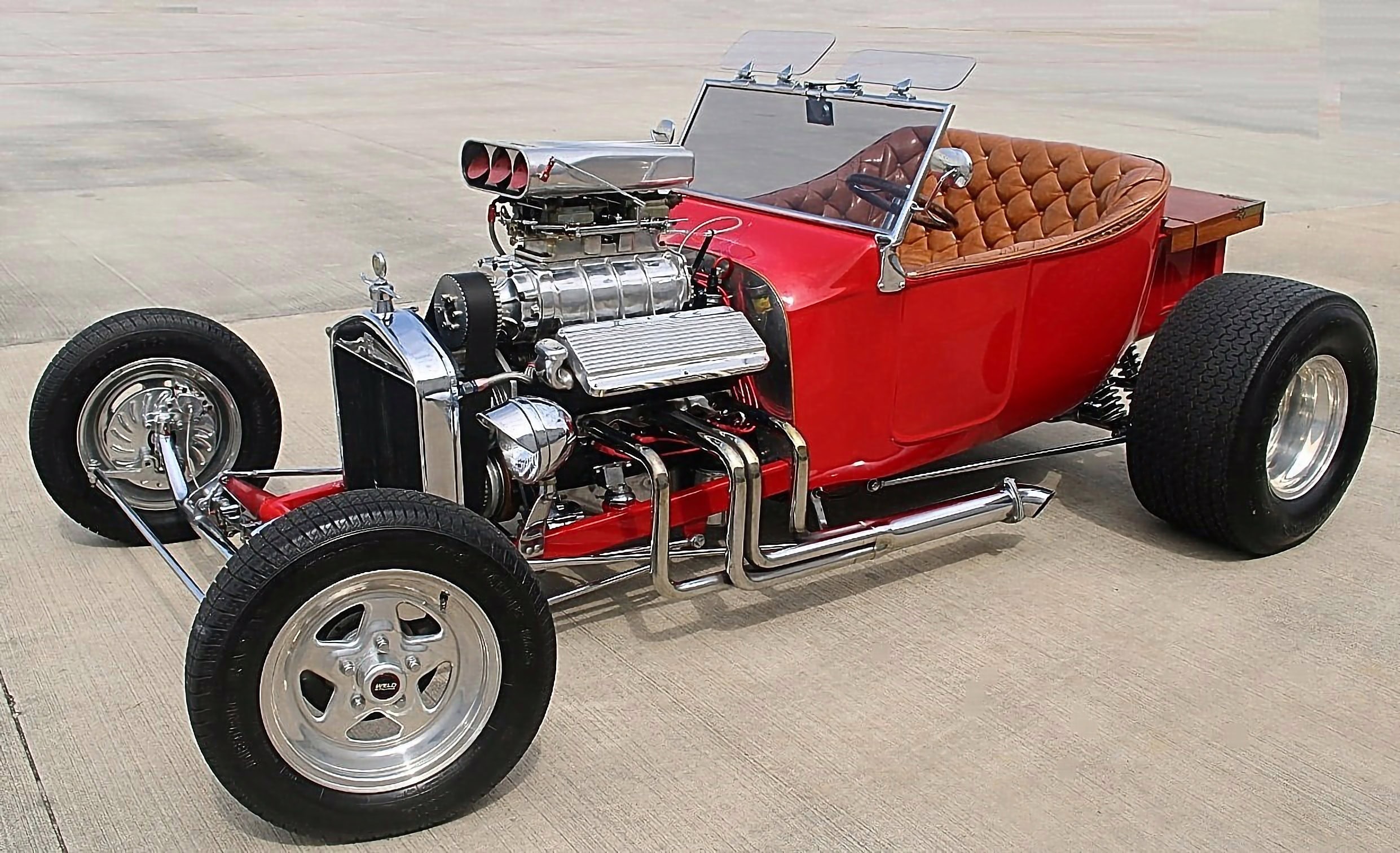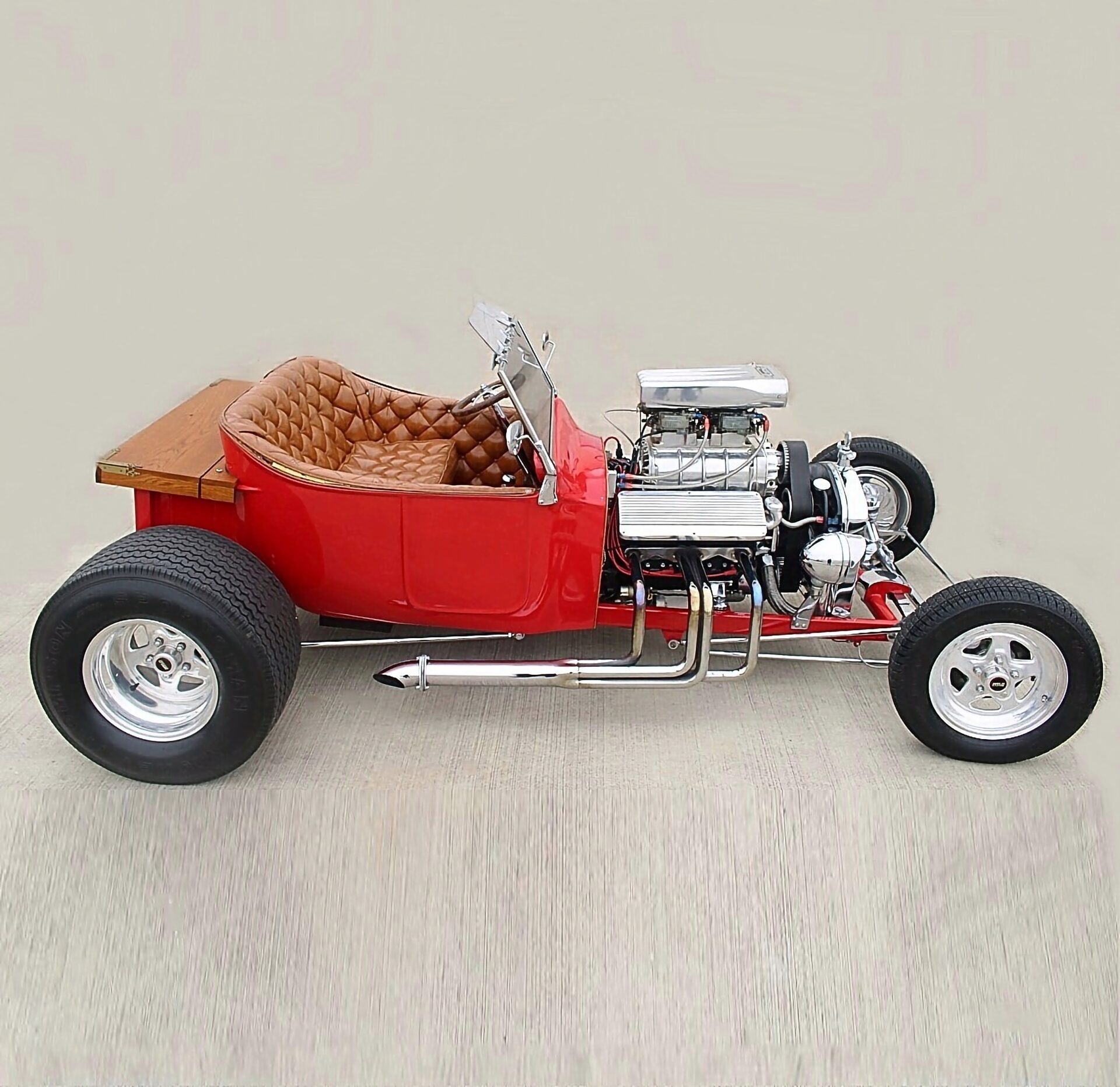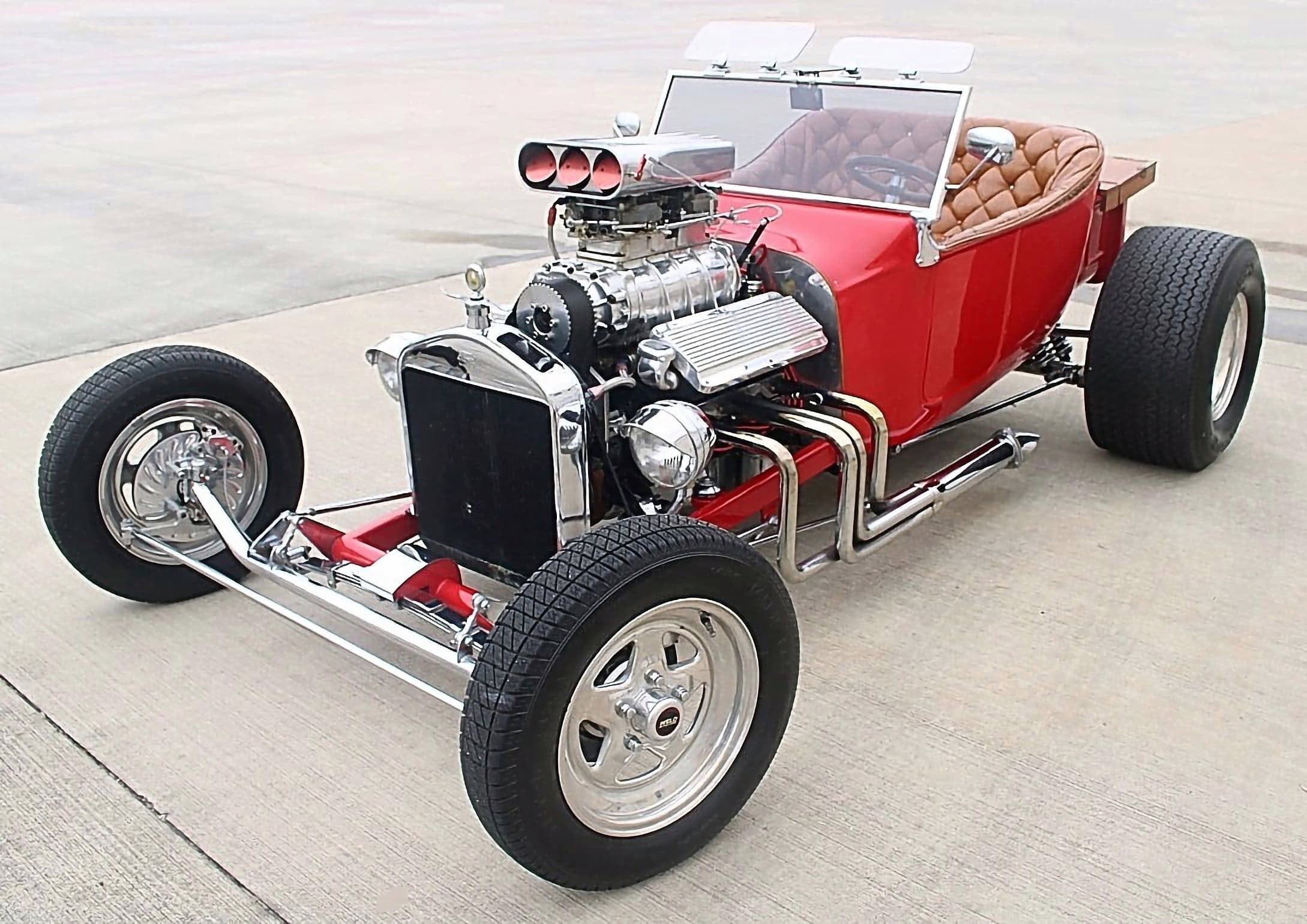Pour illustrer ce texte et rendre le tout totalement incompréhensible mais malgré-tout de haute volée littéraire, sachez qu’analyser le Hot Rodding n’est pas beaucoup plus simple que de décrire scientifiquement un authentique Hot Rod reconstruit… Ce T-Bucket sert donc de base, mais celui-ci a quelques extras qui le rendent unique. Ce Hot Rod’23 est propulsé par un V8 350ci suralimenté par un compresseur. La puissance ainsi obtenue passe aux roues arrière par l’intermédiaire d’une transmission automatique à 3 vitesses GM TH350. L’énorme compresseur Weiand étant alimenté par deux carburateurs Holley 4BBL.