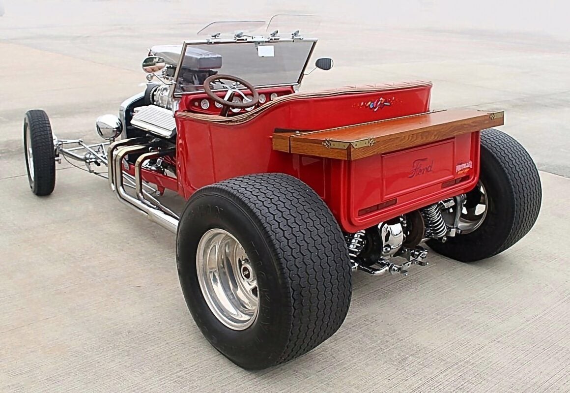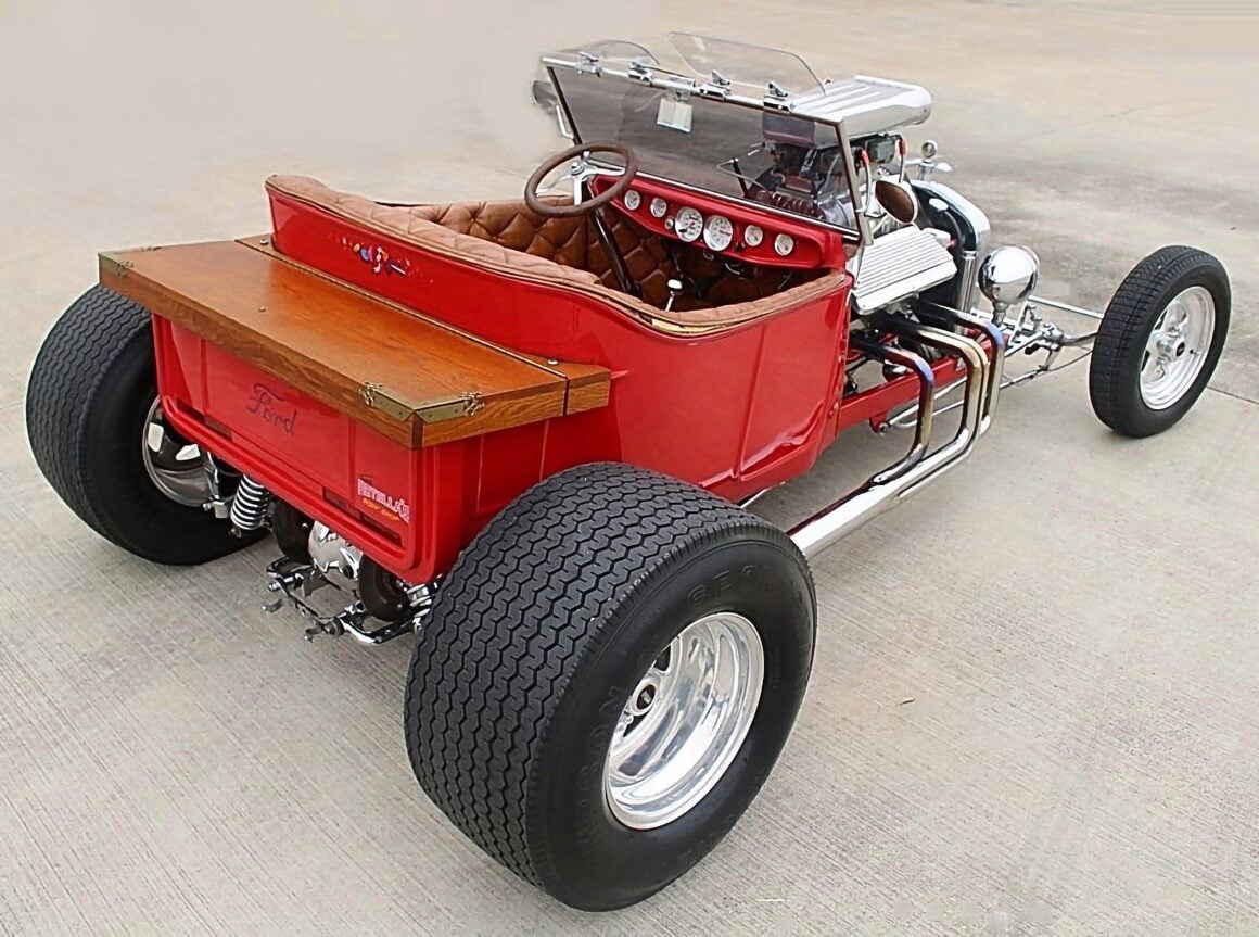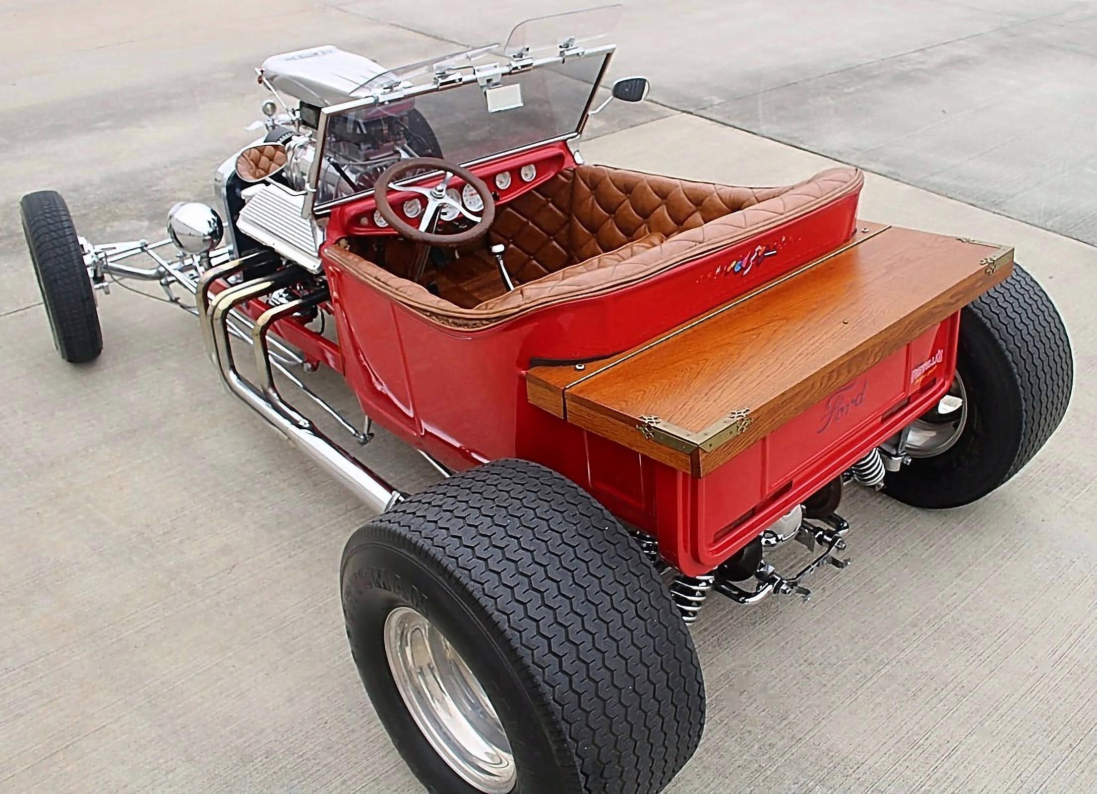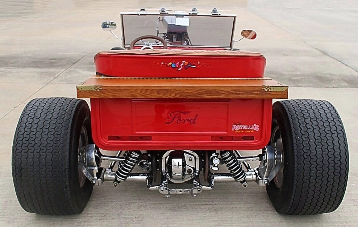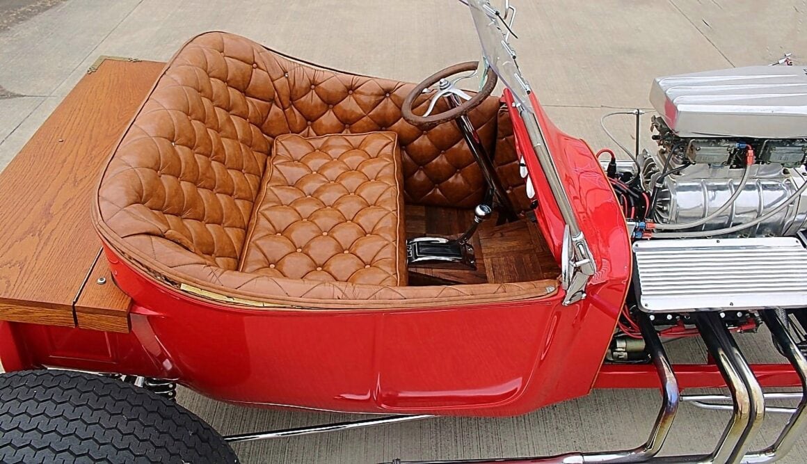 Cela donne à ce T-Bucket le look classique d’un “T”. Un pont/différentiel (forcément arrière) est un IRS provenant d’une Jaguar XJ12 volée et démantibulée… Cela aide à transférer la puissance sur la chaussée par l’intermédiaire de pneus Mickey Thompson Sportsman, très charnus à l’arrière. Ce High Boy “T” est réservé aux mauvais garçons disposant d’une sérieuse motivation à l’entre-jambe ! À l’intérieur, vous trouverez l’omniprésent levier de vitesses à cliquet B&M QuickSilver, ainsi qu’un ensemble complet de jauges Equus rétroéclairées derrière le volant cerclé de bois. Voilà, je fatigue et je stoppe ici… @ pluche..