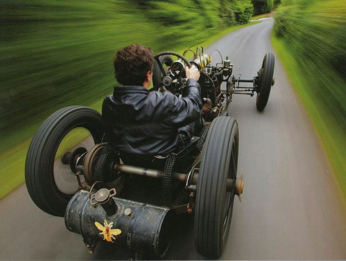 Grimper dans ce type de bitza demande de l’inconscience et de la pratique. S’installer dans un siège “maison” inspiré des premiers Tanks de compétition, se retrouver pire confiné que dans un fauteuil d’asile psychiatrique face à un volant en maillons de chaine et un tableau de bord inondé d’énormes compteurs et interrupteurs récupérés dans une usine à gaz des années 1900 avec des étiquettes compatibles avec la myopie, et, d’un coup on a le sentiment de la précarité de la vie !