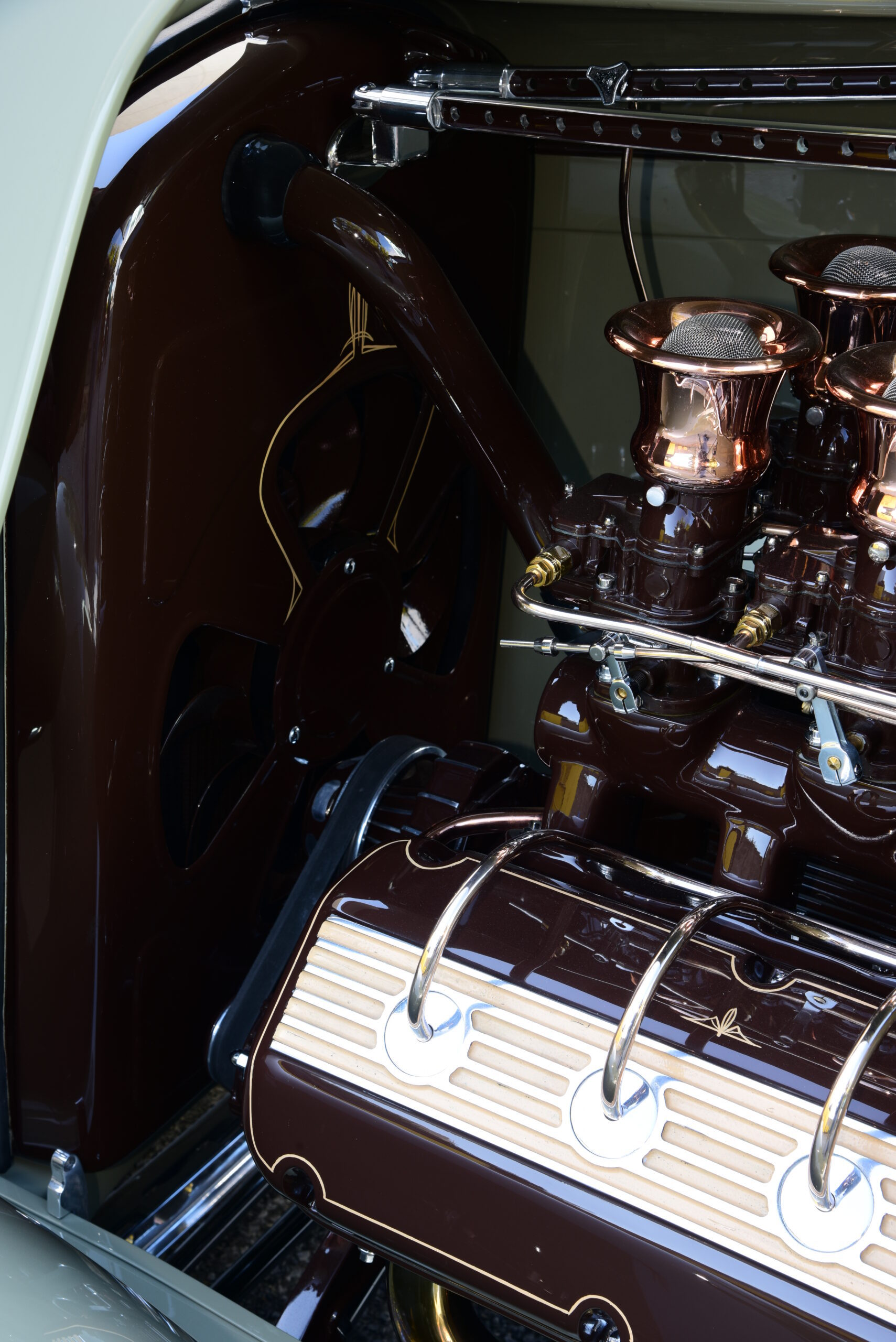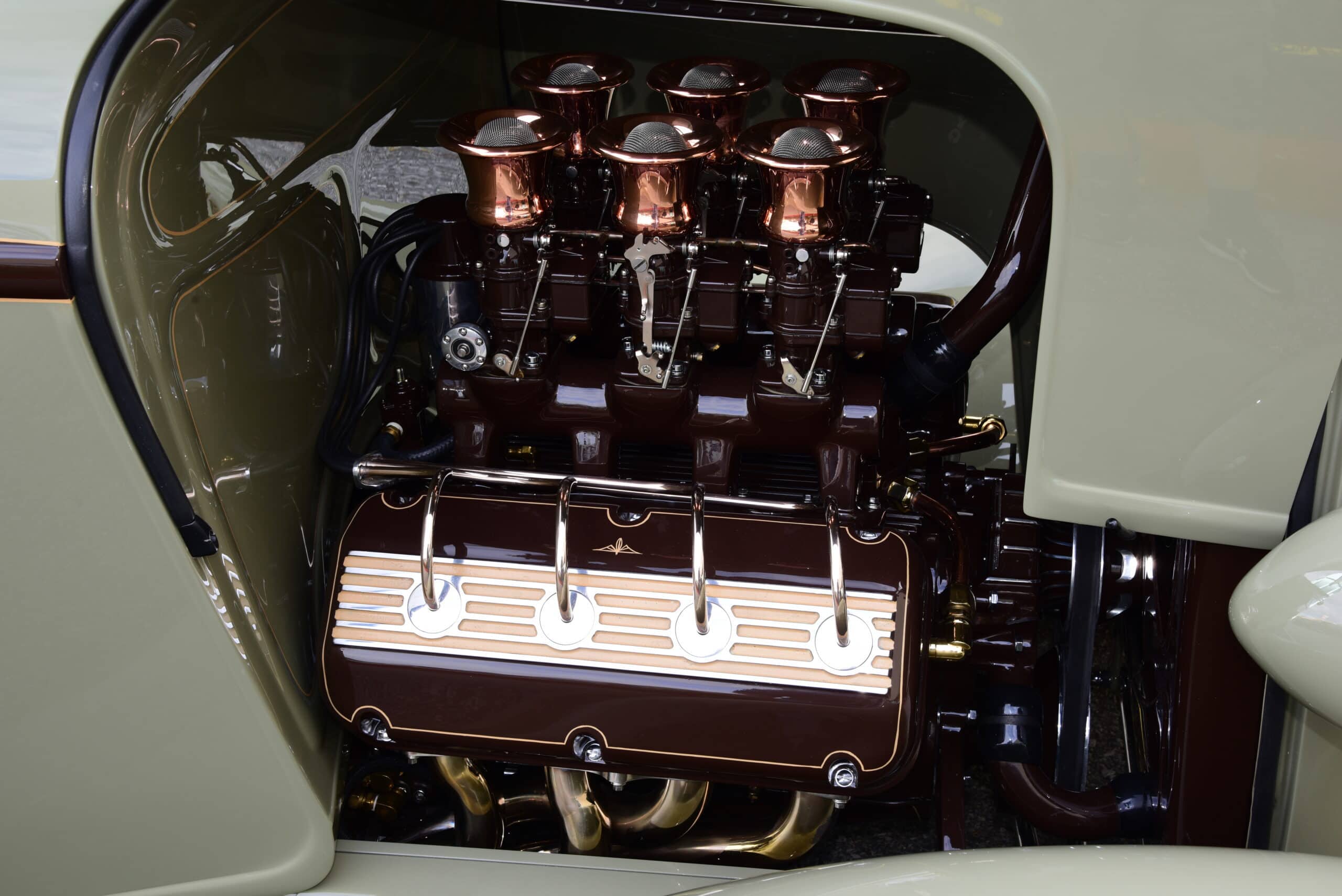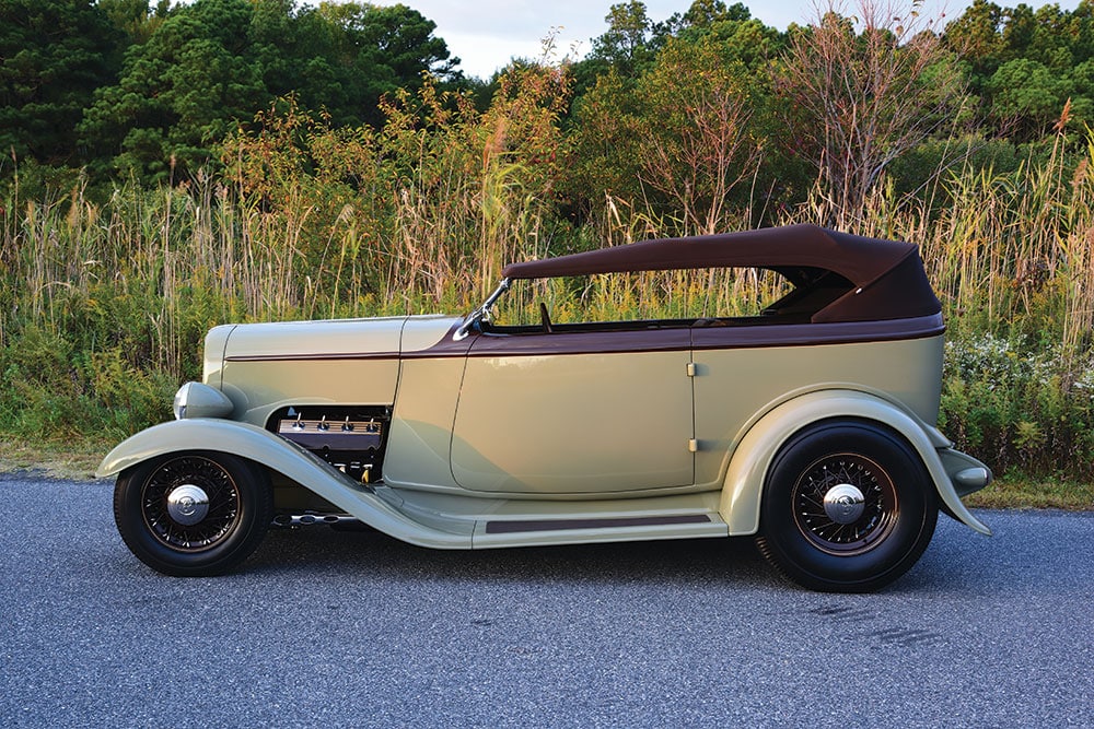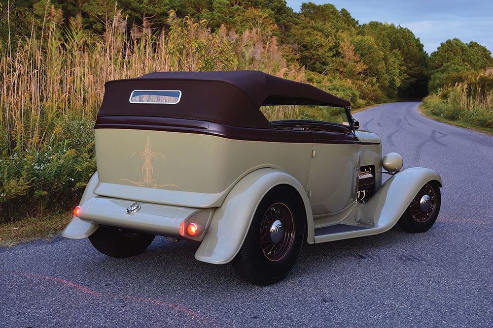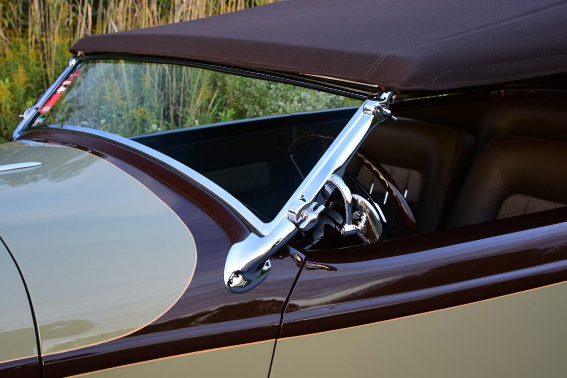 Le cadre supérieur a ensuite été mis à jour en raccourcissant d’abord la longueur totale de 5 pouces pour accueillir le nouveau pare-brise tout en cambrant les arcs en bois. À partir de là, une côtelette graduée de 3-1/2 à 4 pouces a été ajoutée pour finaliser le look. Une fois toute la fabrication terminée, Gary O’Neal, membre de l’équipe, a terminé la carrosserie, a tout espacé à la perfection et l’a préparée pour la peinture. Voulant que la voiture ait une aura d’élégance, Erick Annas de One-Off a mélangé une combinaison subtile de Glasurit Speak Easy Green avec des accents Hot Fudge Sundae.