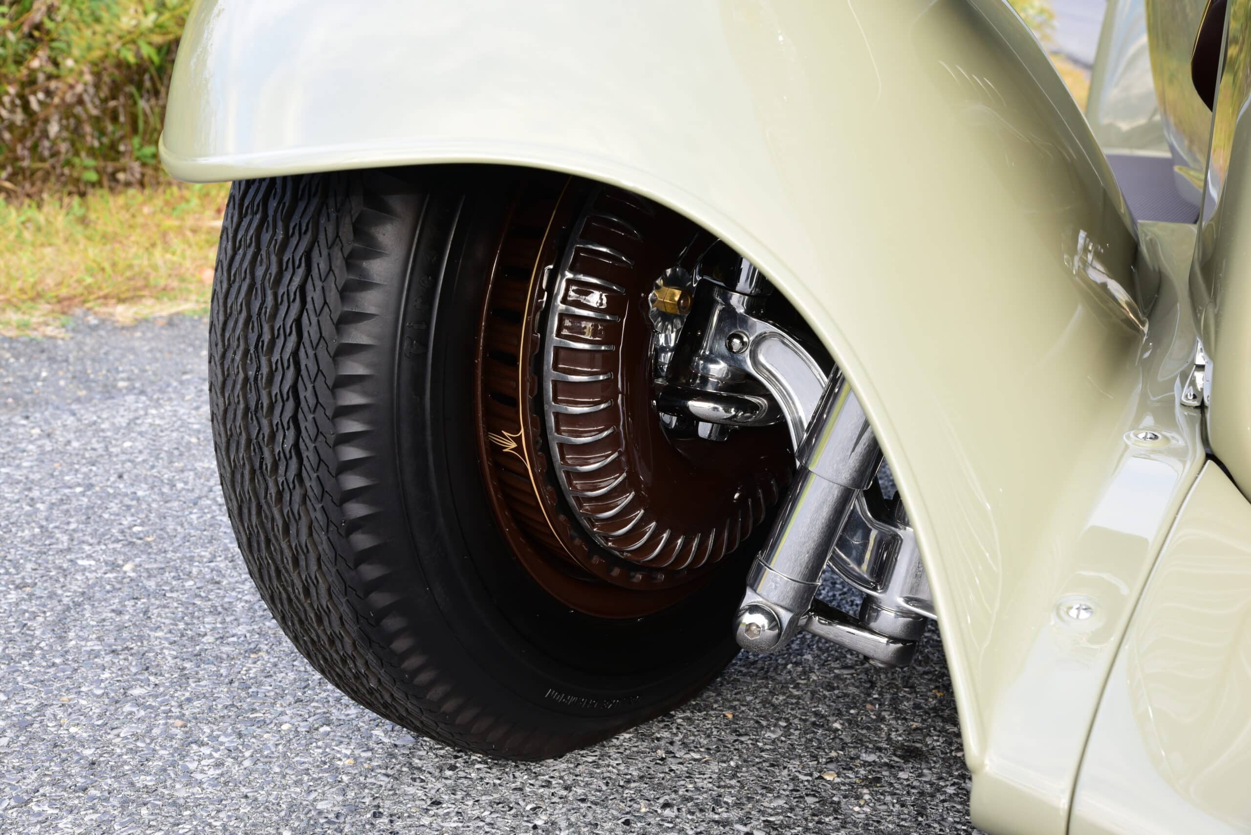 Lorsqu’il est temps de jeter l’ancre, un double maître Tuff Stuff pousse le fluide à travers des conduites en acier inoxydable vers les freins « Safety Stop » Hot Rod Shop Kinmont de Johnson montés à chaque coin, présentant le look unique combiné à la puissance de freinage des freins à disque modernes. Pour relier le tout à la rue, un ensemble de roues à rayons peintes sur mesure de Wheelsmith, de taille 15×6 à l’avant et 16×7,5 à l’arrière, est enveloppé de caoutchouc Firestone/Coker…. Waouwwww !