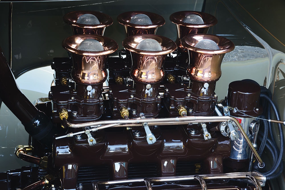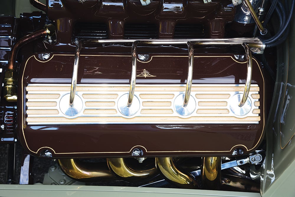 Un ensemble de têtes d’usine modifiées apporte beaucoup de puissance sans faille, en particulier lorsqu’il est associé à une prise d’air vintage des années 50 portant un escadron de carburateurs Speedway Motors 9Super7 coiffés de filtres à air d’OTB Gear. Un distributeur d’apparence magnéto Vertex allume le feu avec des gaz usés se déplaçant à travers des collecteurs en acier inoxydable polis personnalisés jusqu’à un échappement assorti de 3 pouces avec des résonateurs Vibrant Performance, tous de Redder.