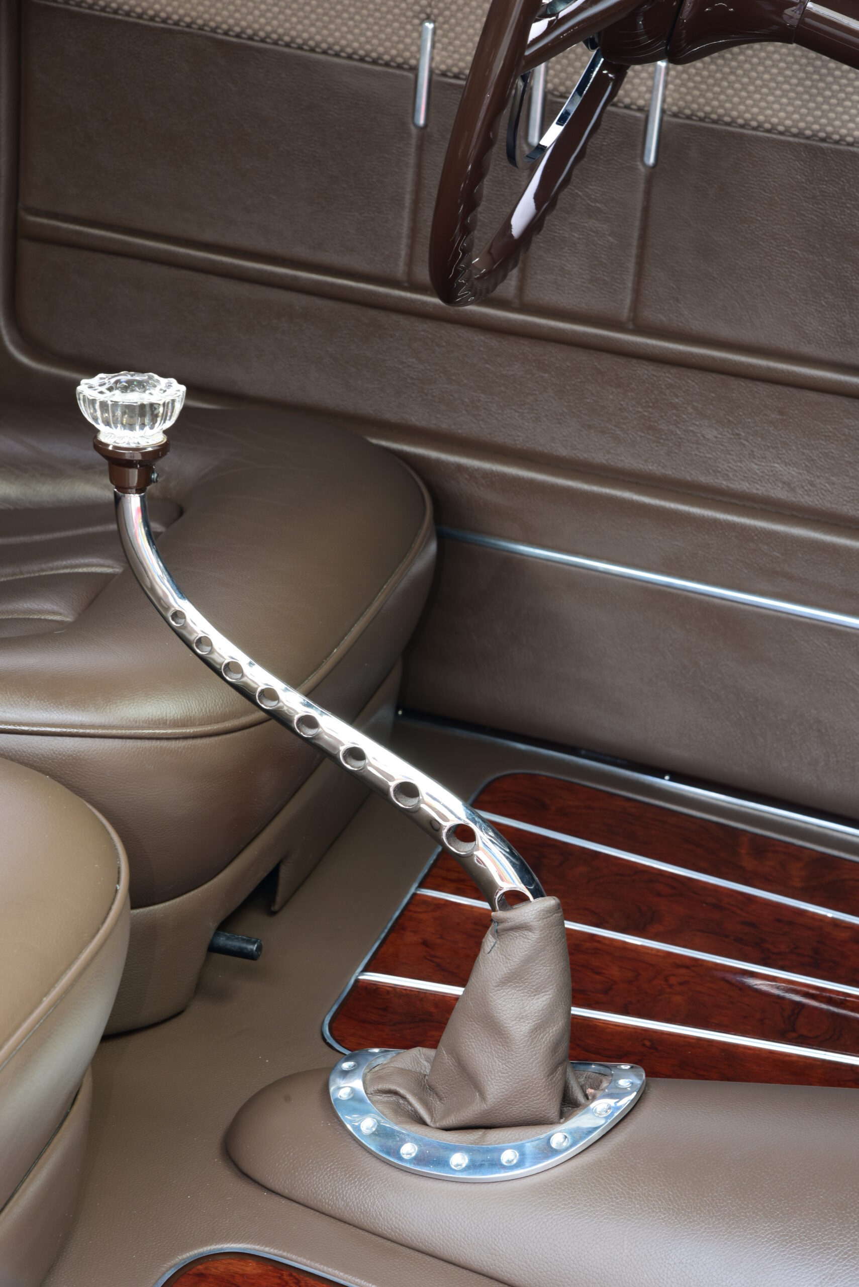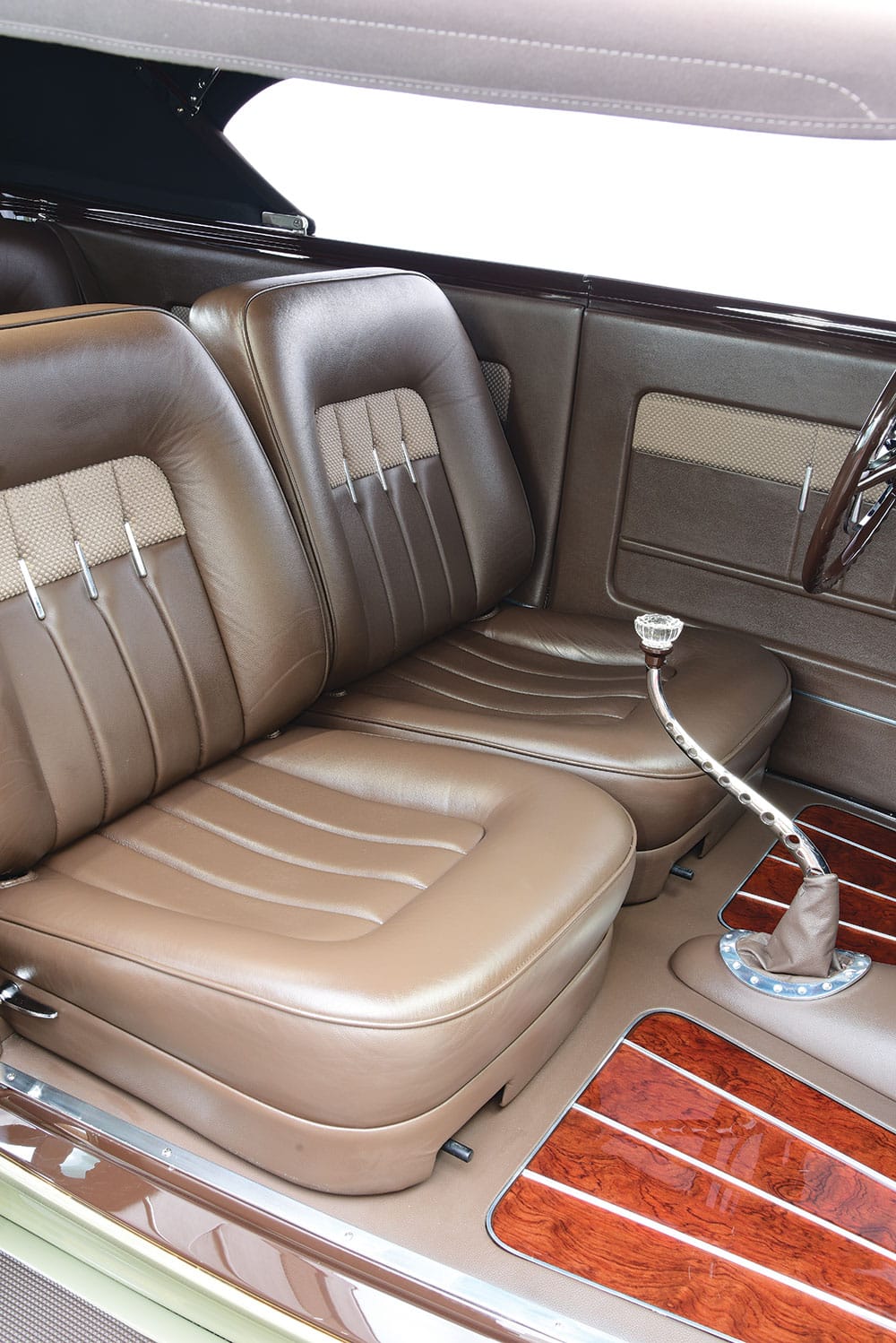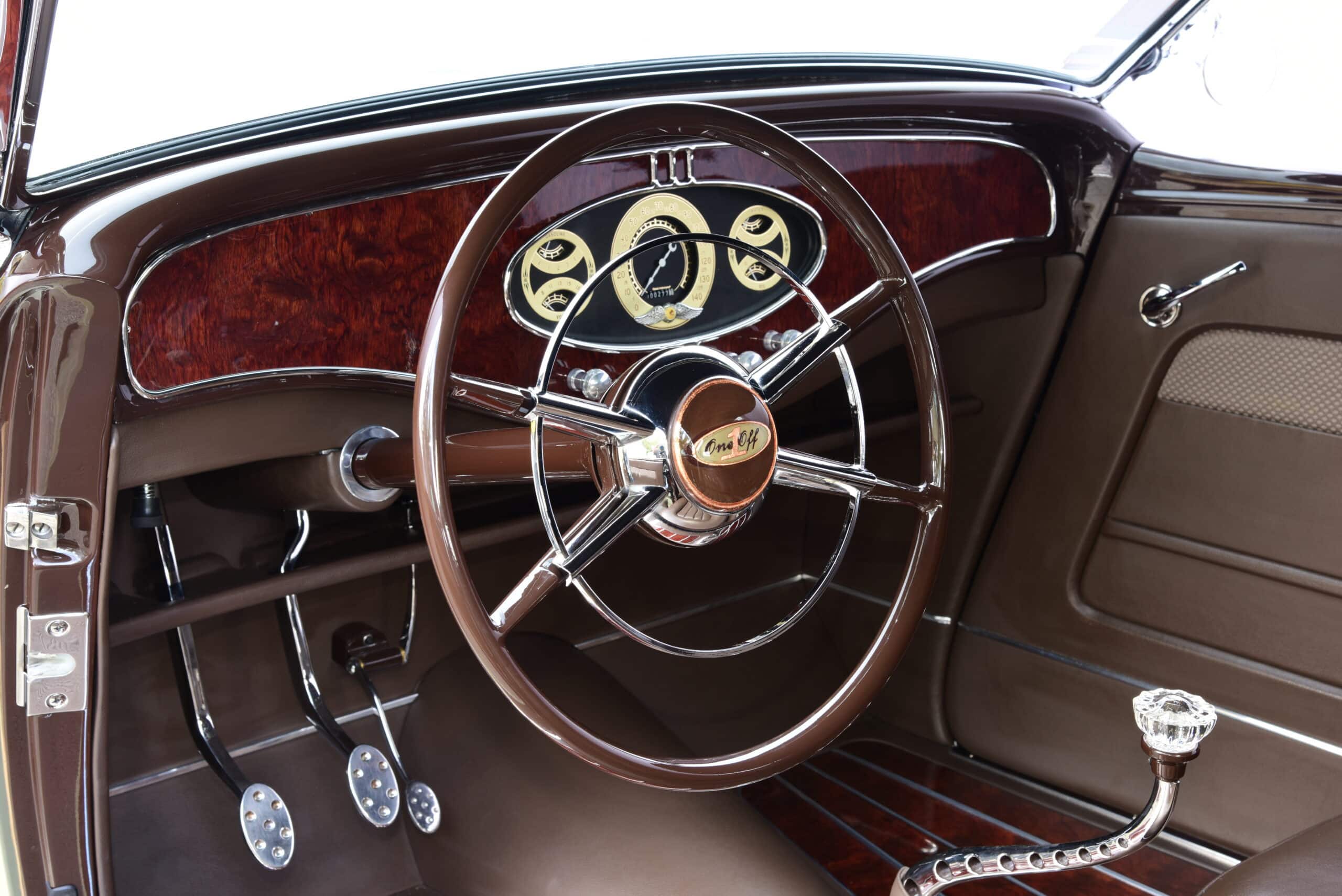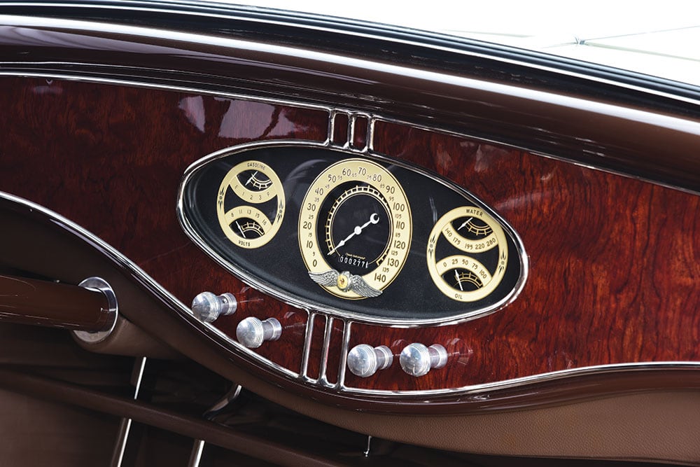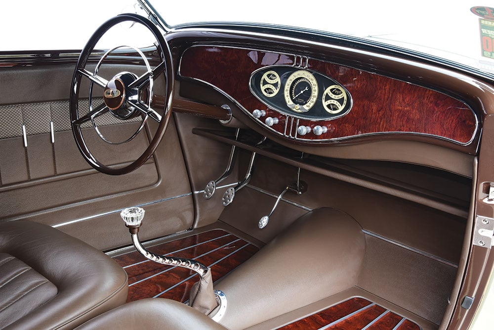 Les détails de finition supplémentaires incluent des phares Cadillac 37, le bouchon d’essence à dégagement rapide Johnson’s Hot Rod Parts, les tapis de marchepied teintés sur mesure de The Dye Guy et les lignes fines du maître, Jerry Campbell, pour ajouter le glaçage final. Quand est venu le temps de concevoir l’intérieur, il fallait une quantité égale de glamour pour correspondre au reste de la construction. Pour commencer, un tableau de bord a été créé à partir d’érable ‘roncé” et accentué par des garnitures en acier inoxydable de McMillan Rod & Custom.