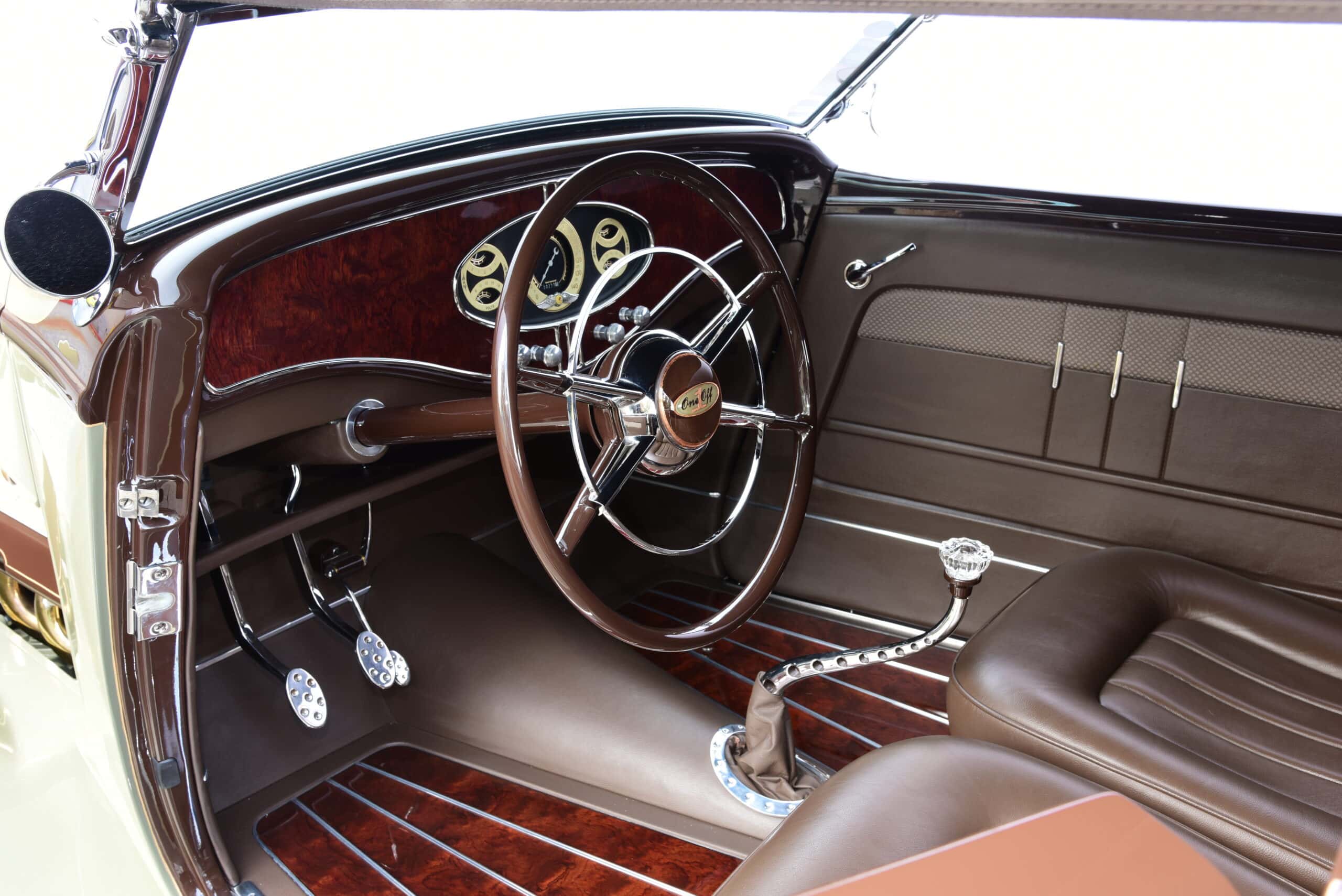 Ils ont été recouverts de cuir vert pâle avec des panneaux latéraux accentués combinés à du cuir assorti sur les sols. La capote a été cousue dans un tissu Stayfast marron chaud tout en ajoutant une lunette arrière de Sid Chavers. L’équipe de One-Off a ensuite fabriqué les incrustations uniques de plancher en érable “roncé” pour compléter le look tout en câblant la voiture. Vu que la construction a été créée en seulement 117 jours pour concourir pour le America’s Most Beautiful Roadster Show, nous devons lever notre chapeau ! C’est génial, pour moi, c’est la façon ultime de rouler à plus de 75 ans !