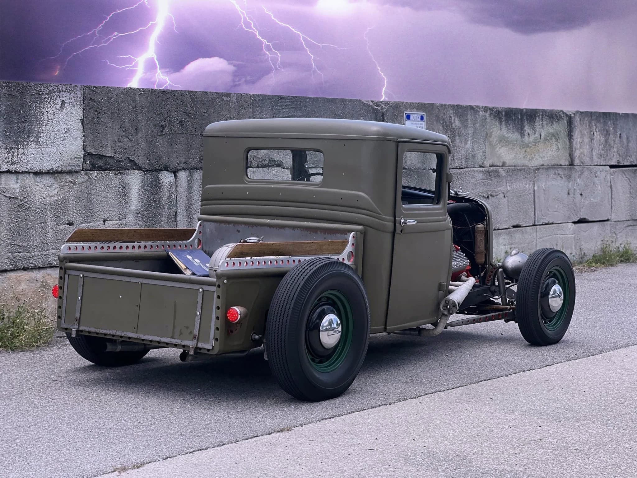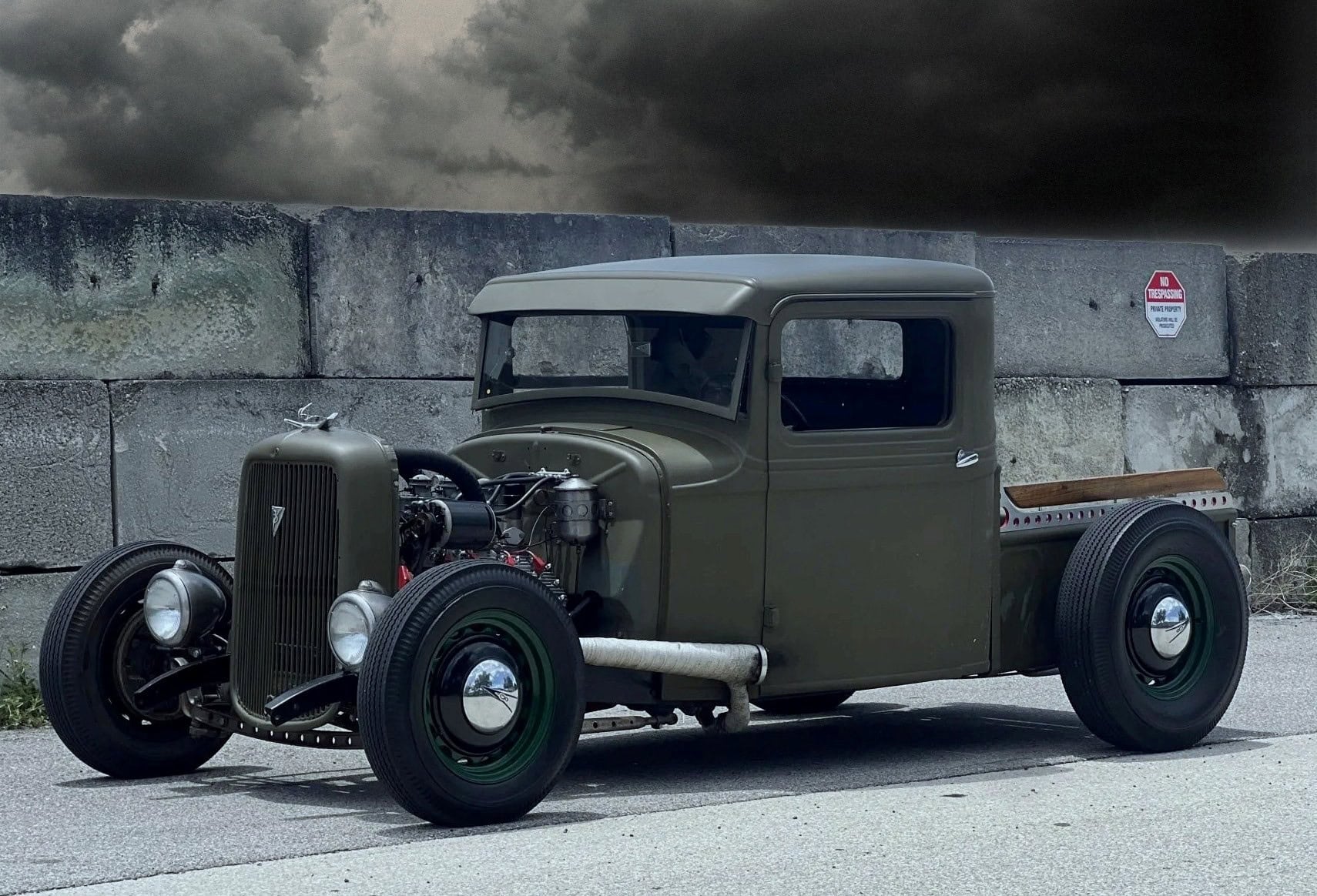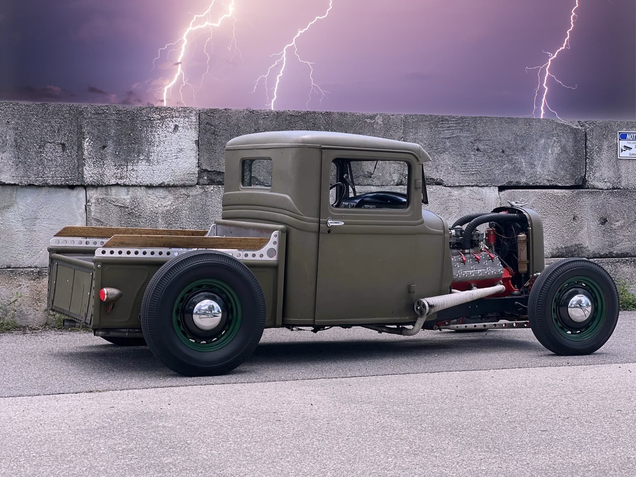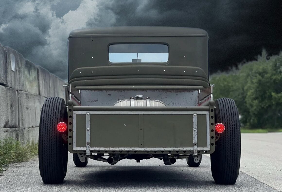 Prenez un Double Dolviran et une bouteille de Chivas et laissez vous porter par le néant : “Construit entre 2007 et 2010 et acquis par Steve Blutch en 2023, ce hot rod ’34 est maintenant en Floride avec des disques et un titre propre de l’Arizona. La carrosserie en acier haché provient d’un pick-up modèle B de 1934, haché et canalisé, et finie en vert olive. La caisse raccourcie est dotée de rails percés avec des barils peints en rouge et des accents de bois. Un radiateur personnalisé est dissimulé derrière la calandre de 1934 surmonté d’un ornement de style imitation, et des phares de style Guide ont été installés”… Ca va ? Vous tenez le coup sans vomir ?