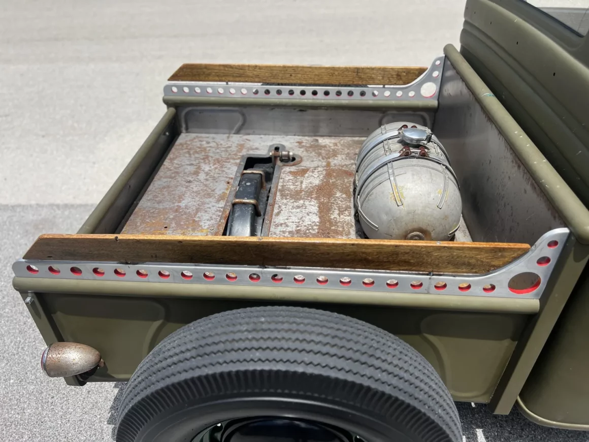 “La vitre personnalisée est fissurée. Le lit a été coupé pour exposer la traverse arrière afin de dégager un réservoir d’air comprimé d’un avion a été monté pour être utilisé comme réservoir de carburant. Le camion roule sur une suspension abaissée avec des ressorts à lames transversaux, des maillons de positionnement arrière réglables, une poutre avant percée et des maillons de positionnement dont les canons sont peints en rouge pour correspondre aux rails de lit. Les roues en acier de style artillerie sont peintes d’un vert contrastant et ont des enjoliveurs avec le logo V8 et des flancs noirs en croûte de tarte”… (C’est traduit tel quel, bon courage pour la suite).