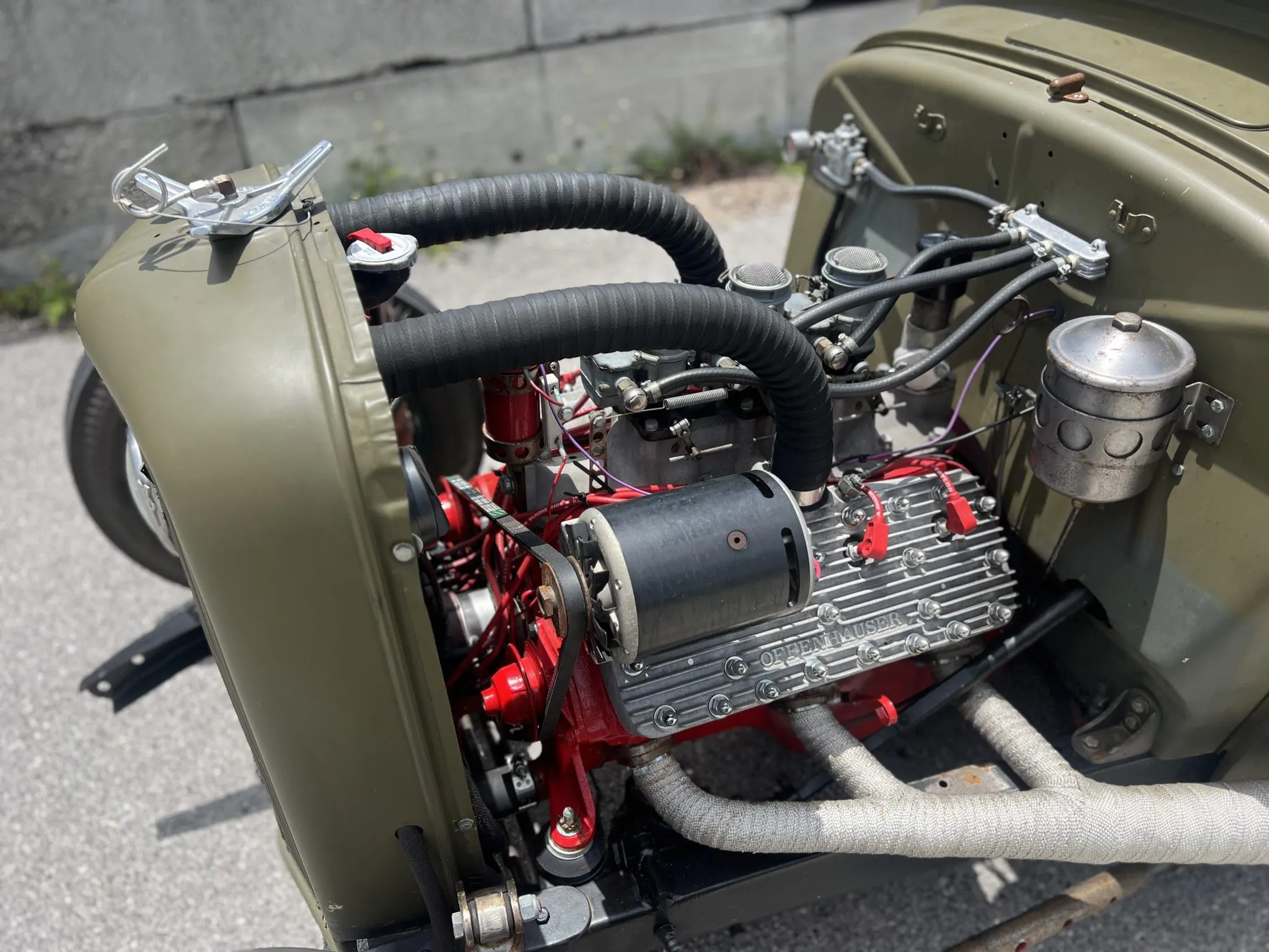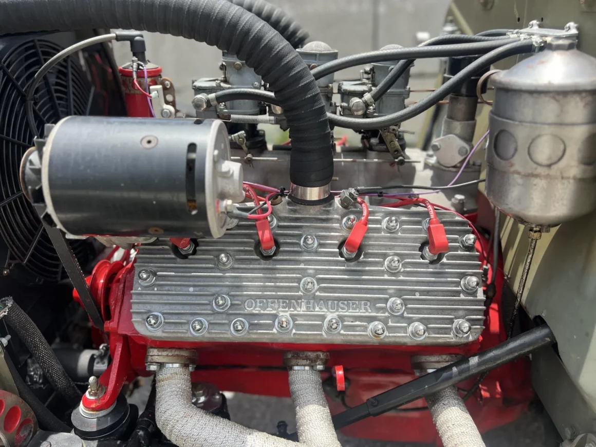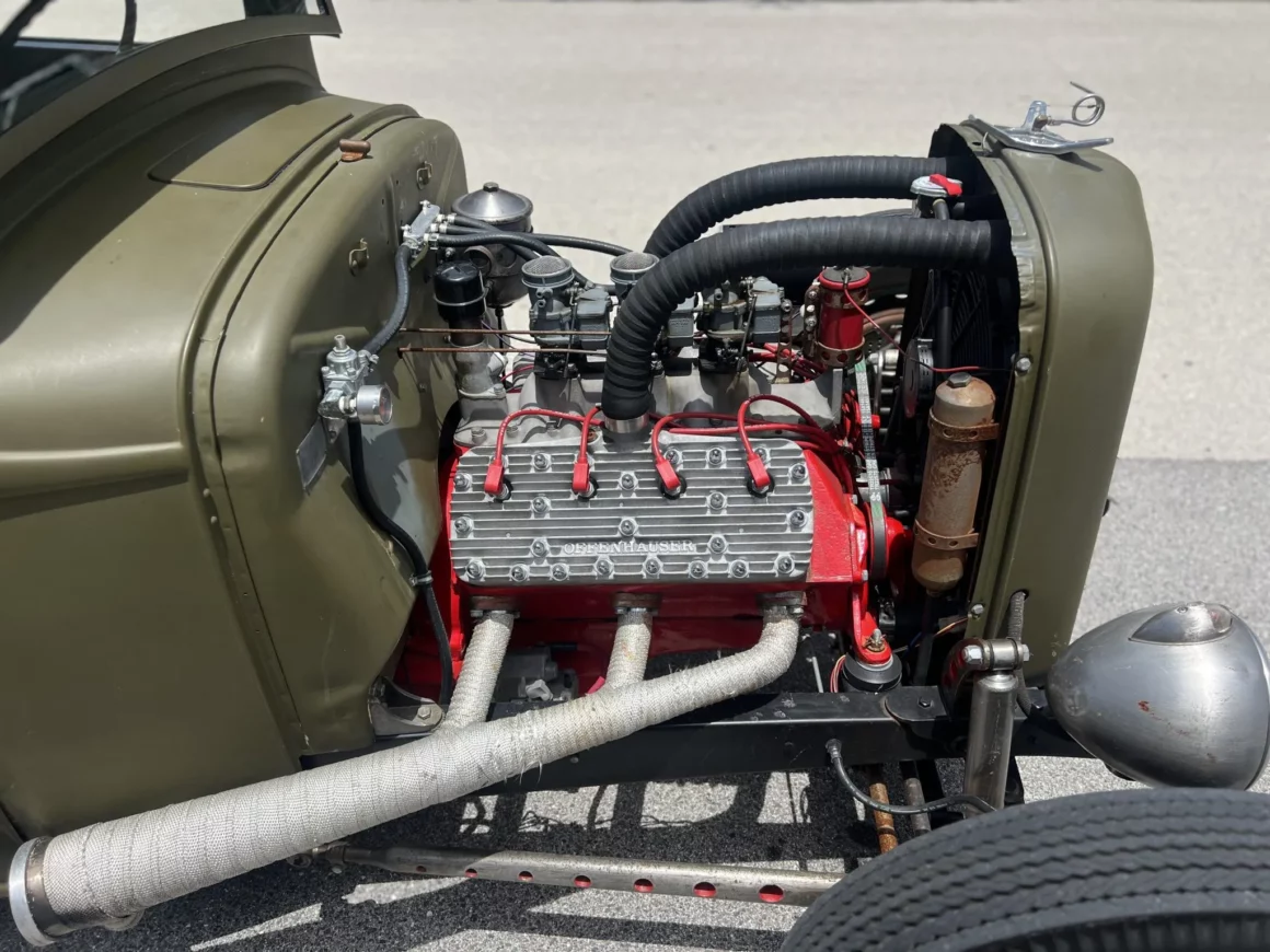 “Le kilométrage total du châssis est inconnu. H&H Flatheads a construit le moteur sur mesure en 2007. Un bloc de 59A a été trempé à l’acide, magnafluxé, percé et refait surface, et les sièges de soupape ont été coupés à trois angles, rectifiés et avaient des sièges durcis installés. L’ensemble rotatif était équilibré dynamiquement, des roulements Clevite et des engrenages de distribution Melling étaient montés avec des soupapes Manley Performance, et le moteur était surmonté de têtes Offenhauser 59A. Le déplacement est estimé à 262 pouces cubes”… Et voilà, votre calvaire touche bientôt à sa fin…. Il reste encore deux lignes après la photo…