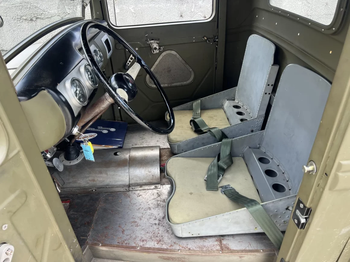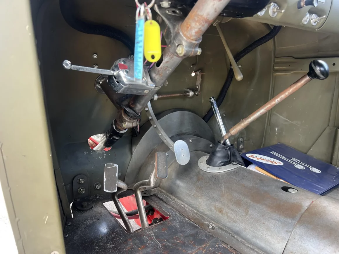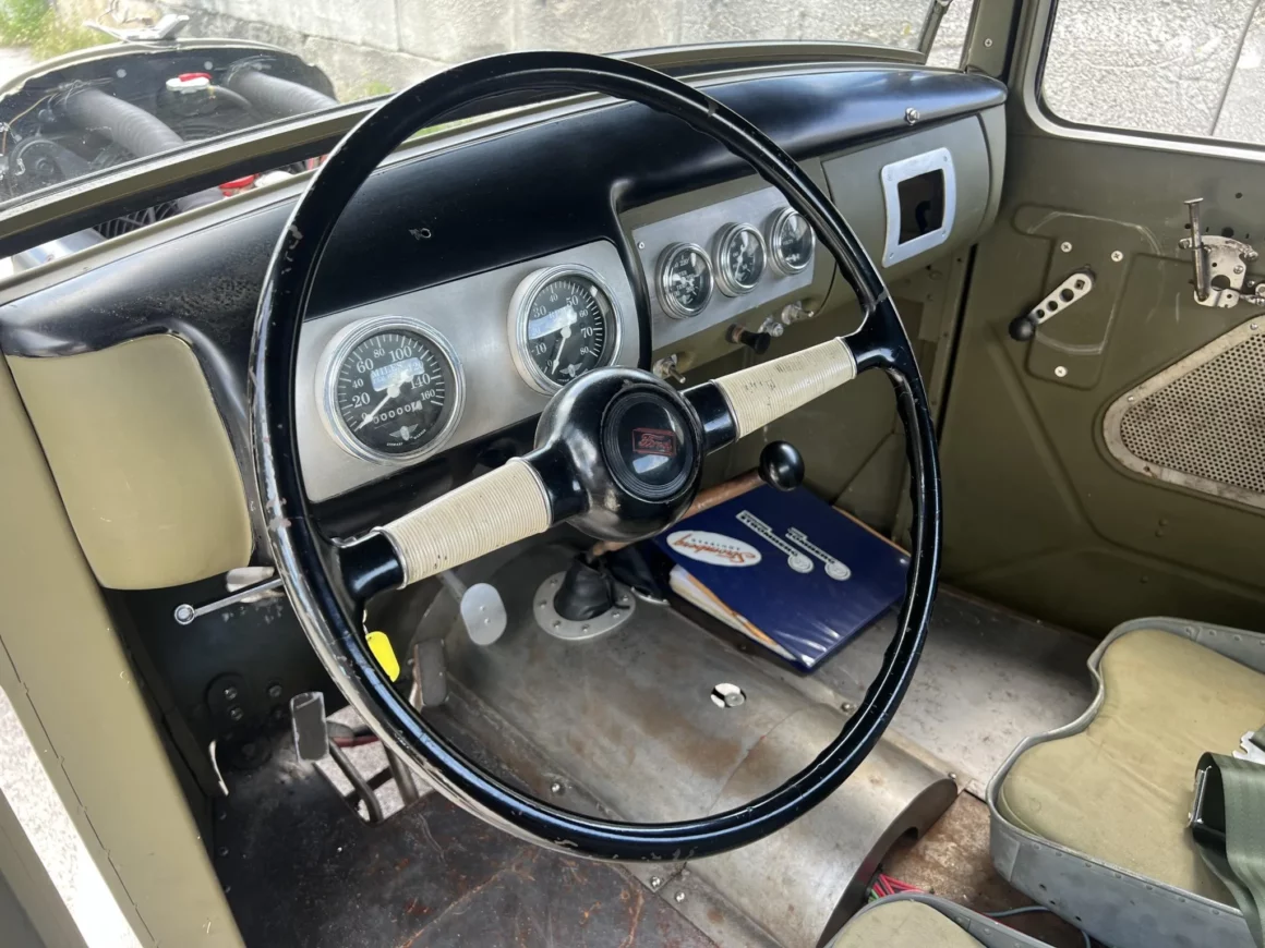 “Les freins hydrauliques proviennent d’un modèle ultérieur et ont des plaques de support percées. Les sièges proviennent d’un Boeing B-25 et sont dotés de coussinets personnalisés ainsi que de ceintures abdominales. Les manivelles des fenêtres ont été percées, tout comme les renforts de cloisons et le bras de la pédale d’accélérateur. Le plancher et le tunnel de transmission sont fabriqués en panneaux métalliques nus. Les instruments Stewart Warner ont été installés dans le tableau de bord de la Ford 40, bien que le compteur de vitesse ne fonctionne que par intermittence”… C’est du petit lait sûré, d’un goût rance et de vomi… Courage…