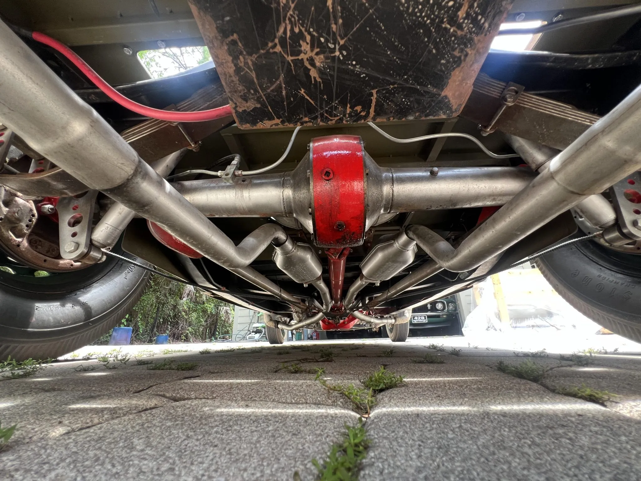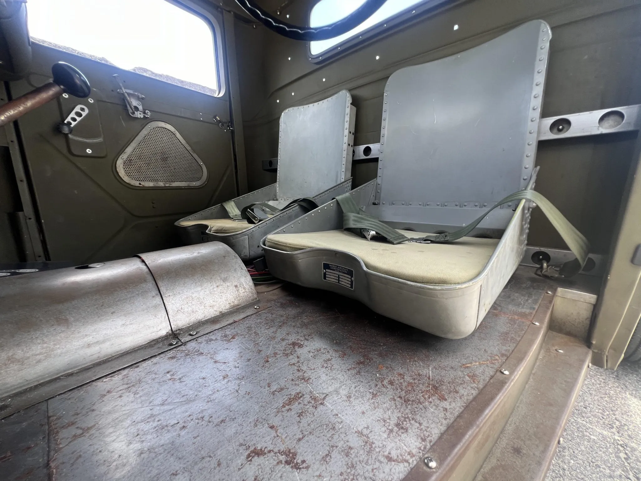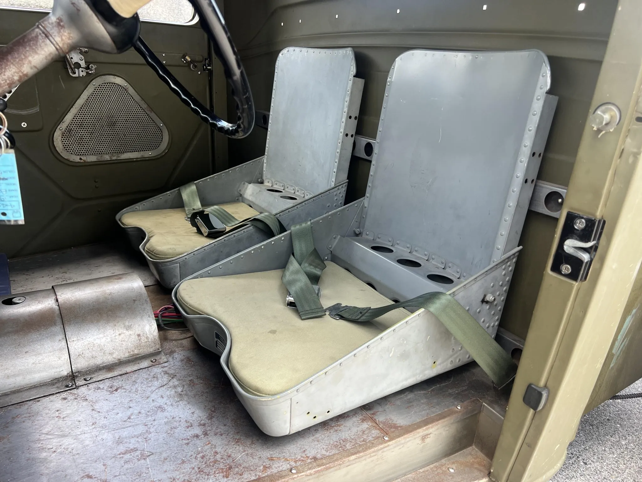 “Les freins hydrauliques proviennent d’un modèle ultérieur et ont des plaques de support percées. Les sièges proviennent d’un Boeing B-25 et sont dotés de coussinets personnalisés ainsi que de ceintures abdominales. Les manivelles des fenêtres ont été percées, tout comme les renforts de cloisons et le bras de la pédale d’accélérateur. Le plancher et le tunnel de transmission sont fabriqués en panneaux métalliques nus. Les instruments Stewart Warner ont été installés dans le tableau de bord de la Ford 40, bien que le compteur de vitesse ne fonctionne que par intermittence”… C’est du petit lait sûré, d’un goût rance et de vomi… Courage…