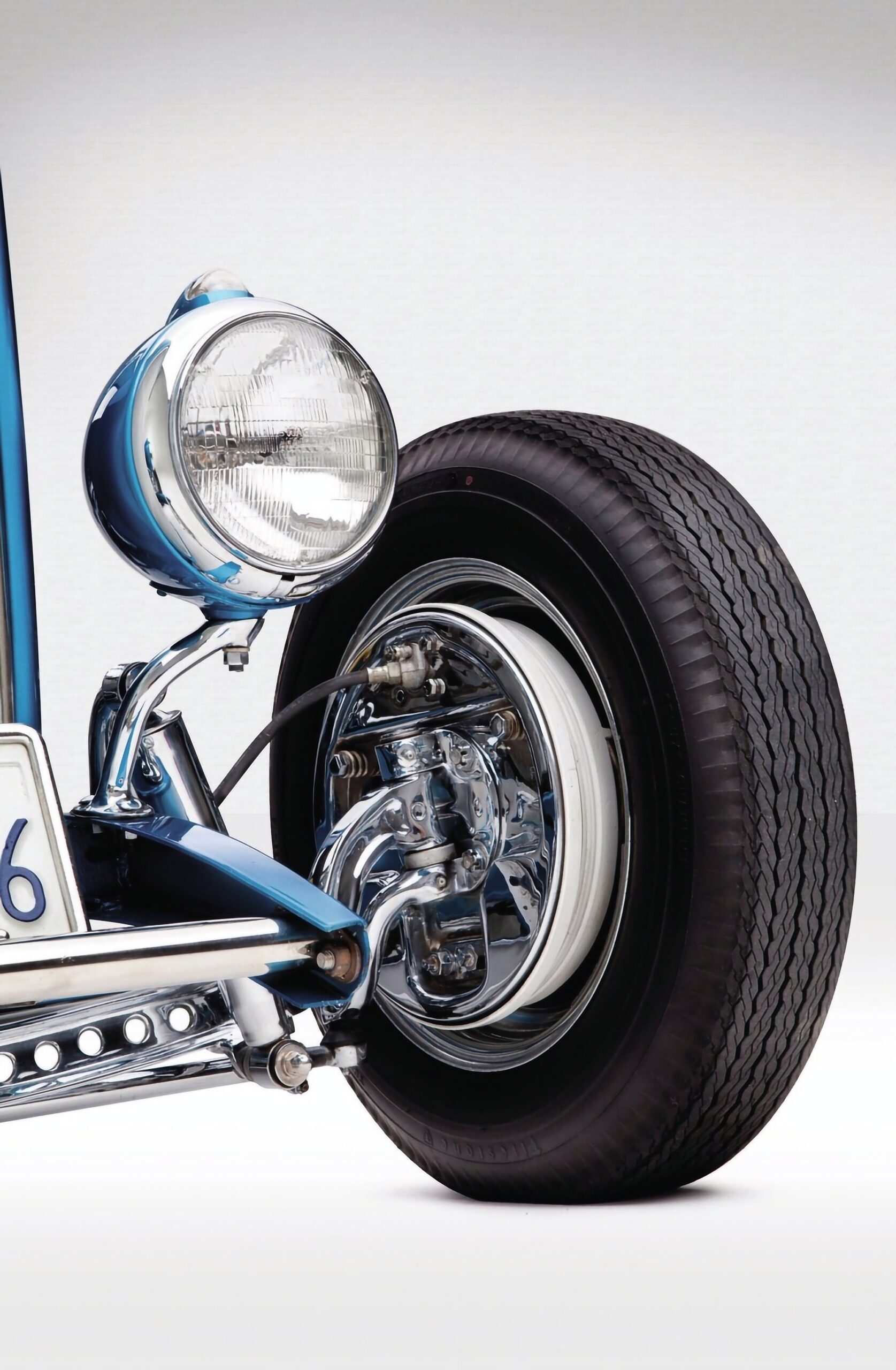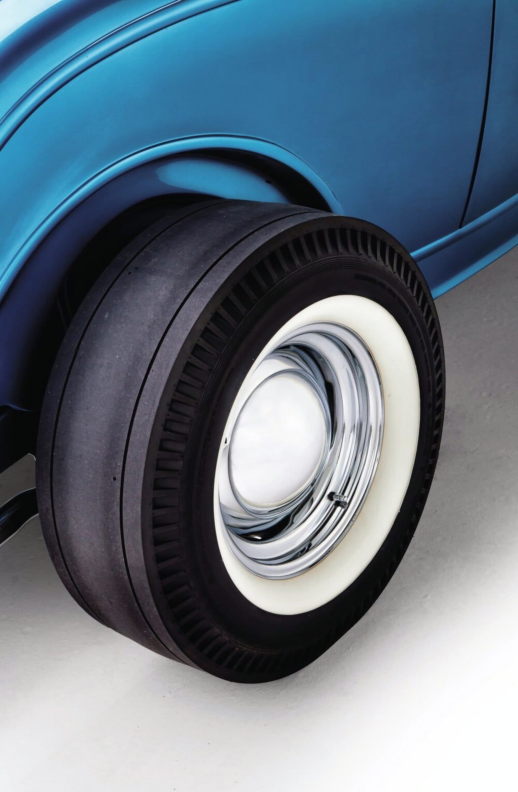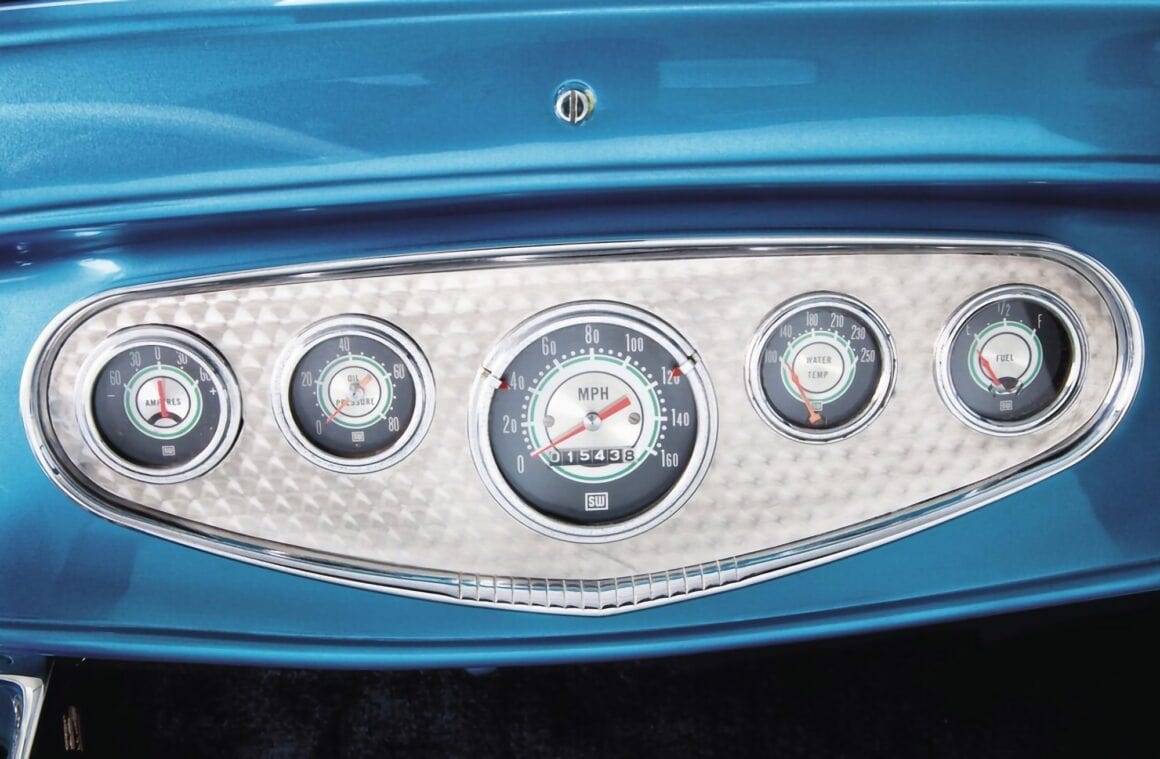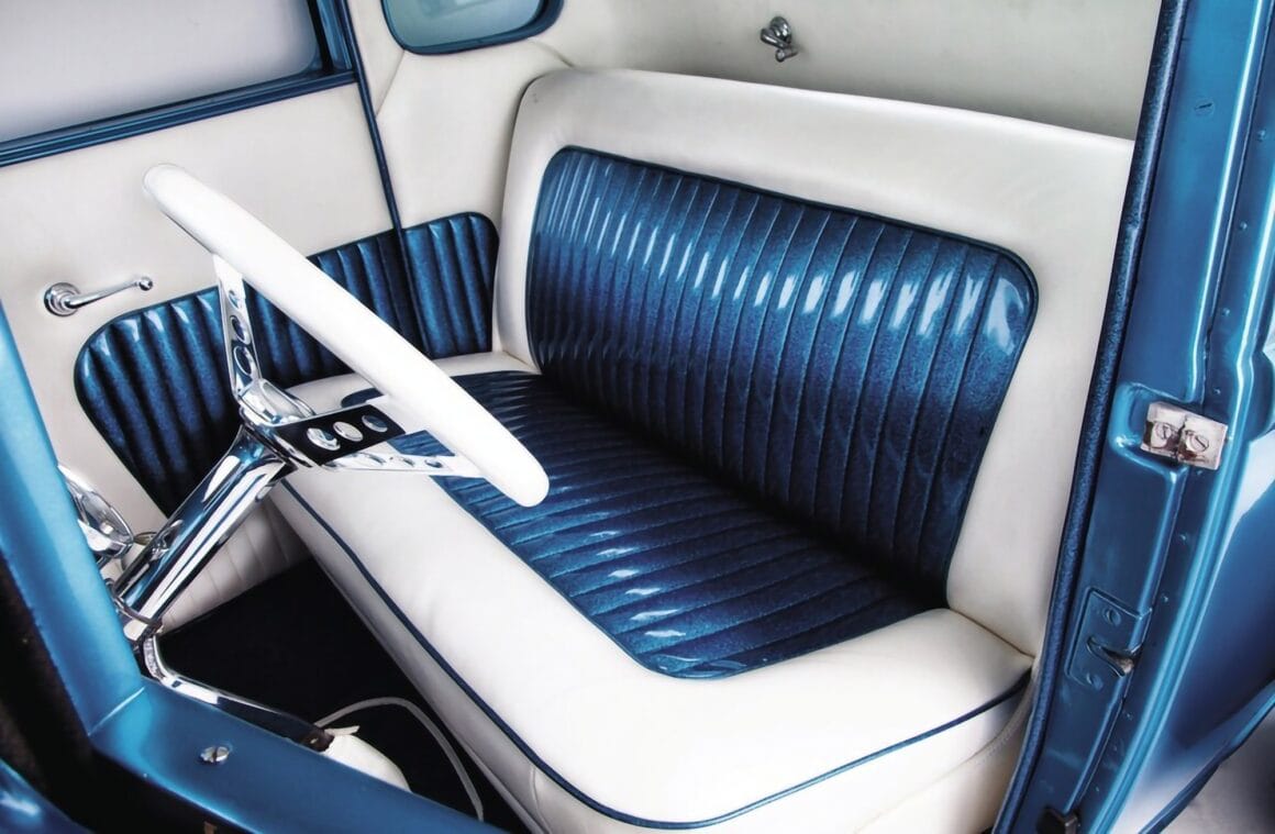 Tous les travaux de carrosserie et la nouvelle peinture Washington Blue ont été réalisés en interne par l’équipe de Lowery. Terry a également décidé de ne pas utiliser les panneaux latéraux du capot ainsi que celui-ci et finir tous les composants frontaux en argent argenté pour un véritable look d’époque. Le V8 Chevrolet 265ci a été refait à neuf par Ted et Randall Wingate chez Precision Balancing à Hudson, New Hampshire. Une fois terminé, il l’a remis à Jim pour l’ajustement final et la configuration. Les garnitures, le câblage en tissu personnalisé et l’installation des pneus et des jantes ont été effectués par l’équipe compétente de Lowery’s. Et l’intérieur en faux cuir bleu et blanc Ford original de 1941 façon vintage a été exécuté par Stephen Pierce de chez One-Off Technologies à proximité de Gilford.