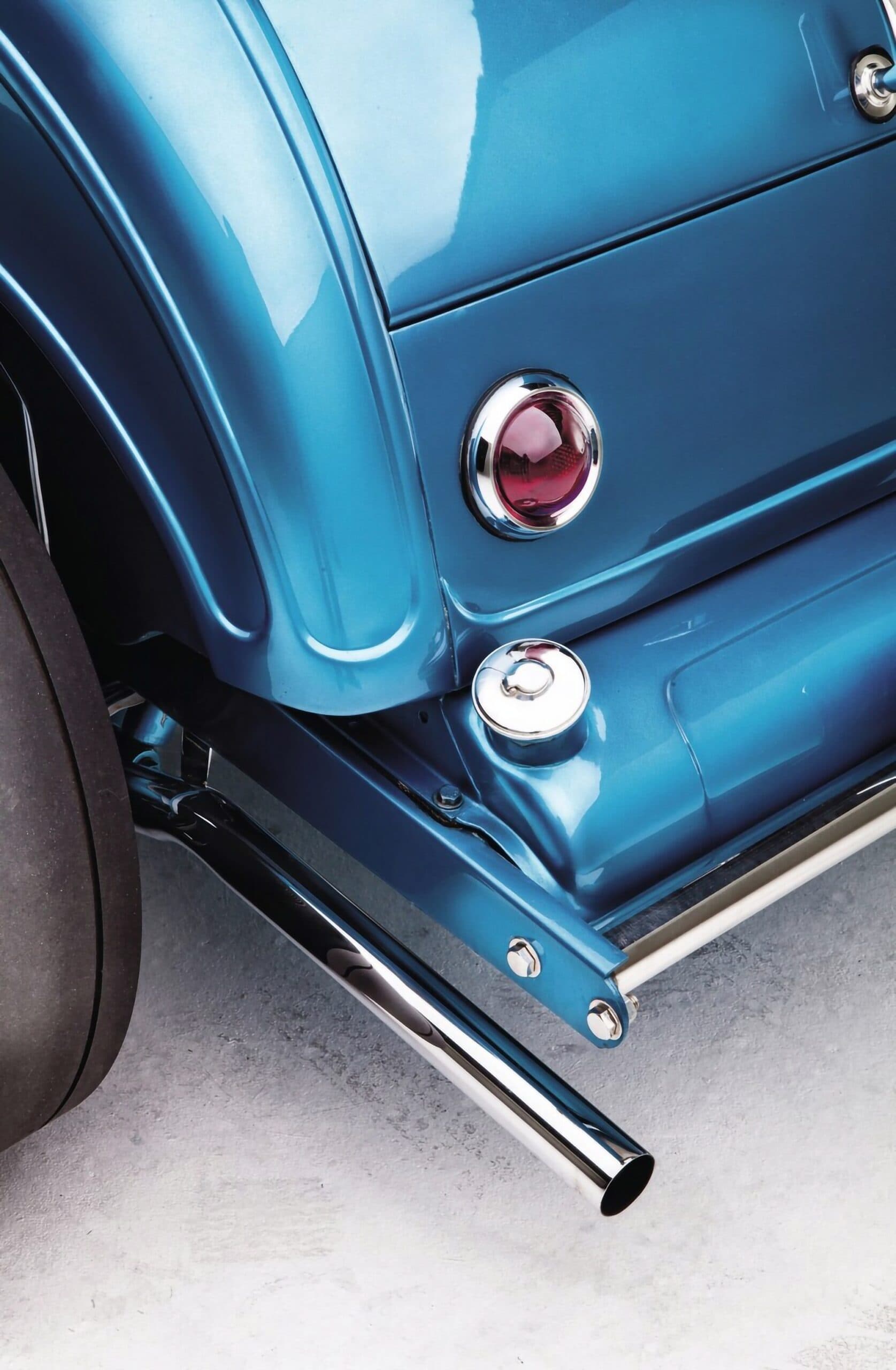 L’empattement étant légèrement étiré, au bénéfice d’un “plus de place pour les jambes” de sorte qu’un nouveau capot devait être fabriqué, Jim a fabriqué un gabarit en aluminium et l’a envoyé à Rootlieb Hood Company, qui a terminé la pièce personnalisée en quelques tours de mains. Rootlieb a utilisé des Louvers c’est-à-dire des persiennes plus ouvertes de style camion 1933. Un tableau de bord de camion de 1933 a été adapté sur mesure au roadster avec les rares compteurs Duplex que Terry avait obtenus. Le Quick-Change, les phares et les sièges ont tous été ajoutés au mélange, avec un parfait ajustement des panneaux. Une fois les deux hommes satisfaits, le Hot-Rod a été préparé pour la peinture.