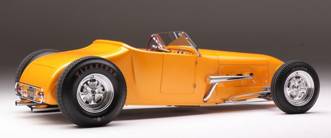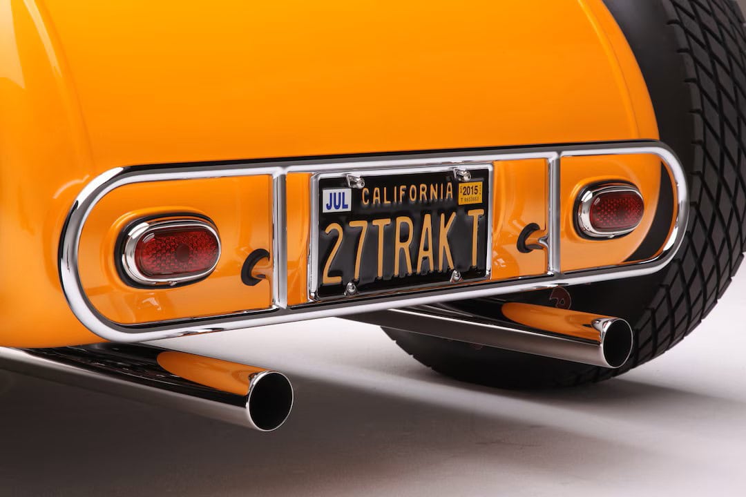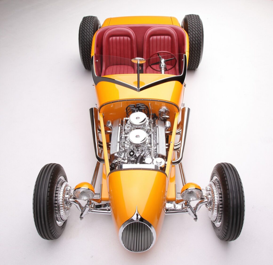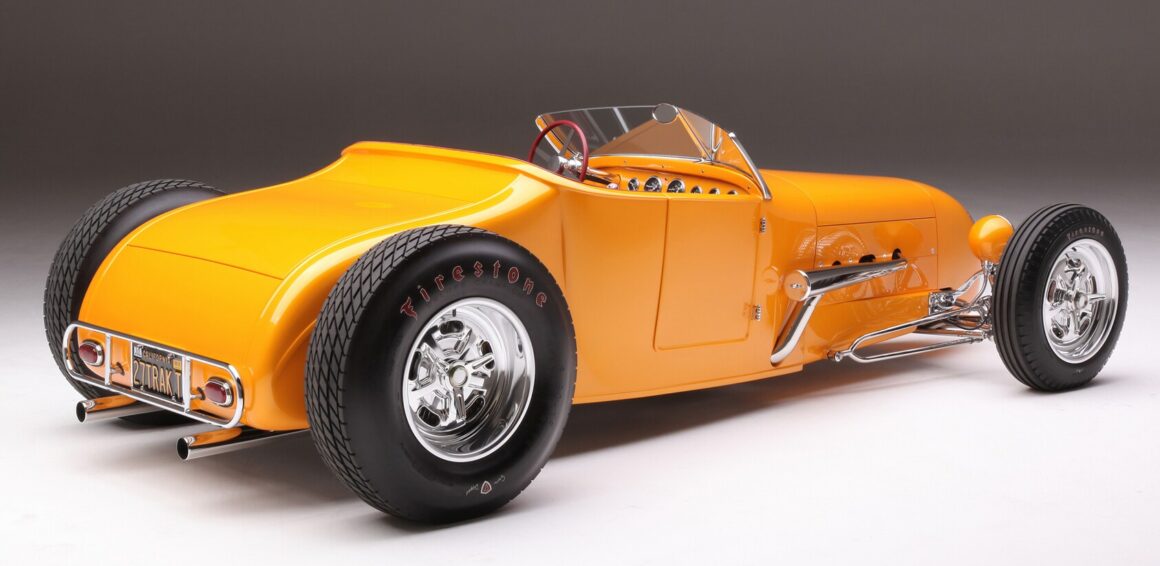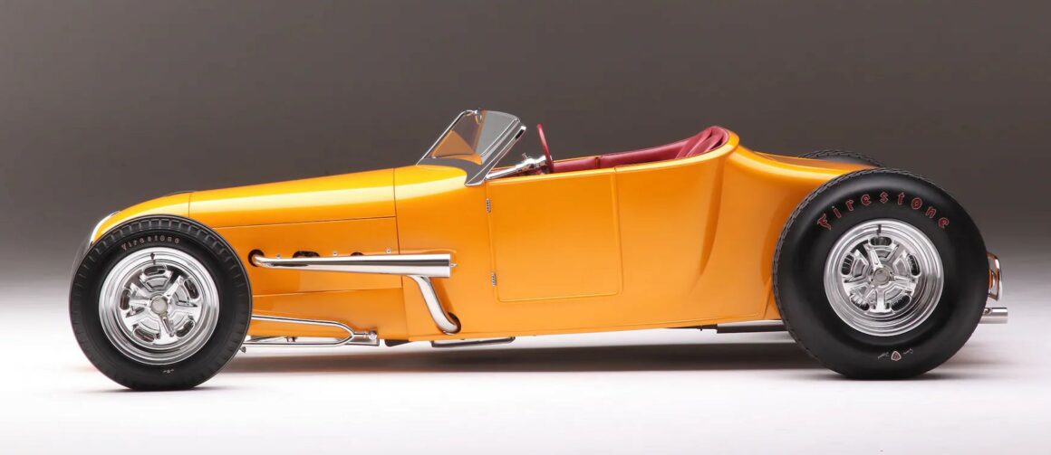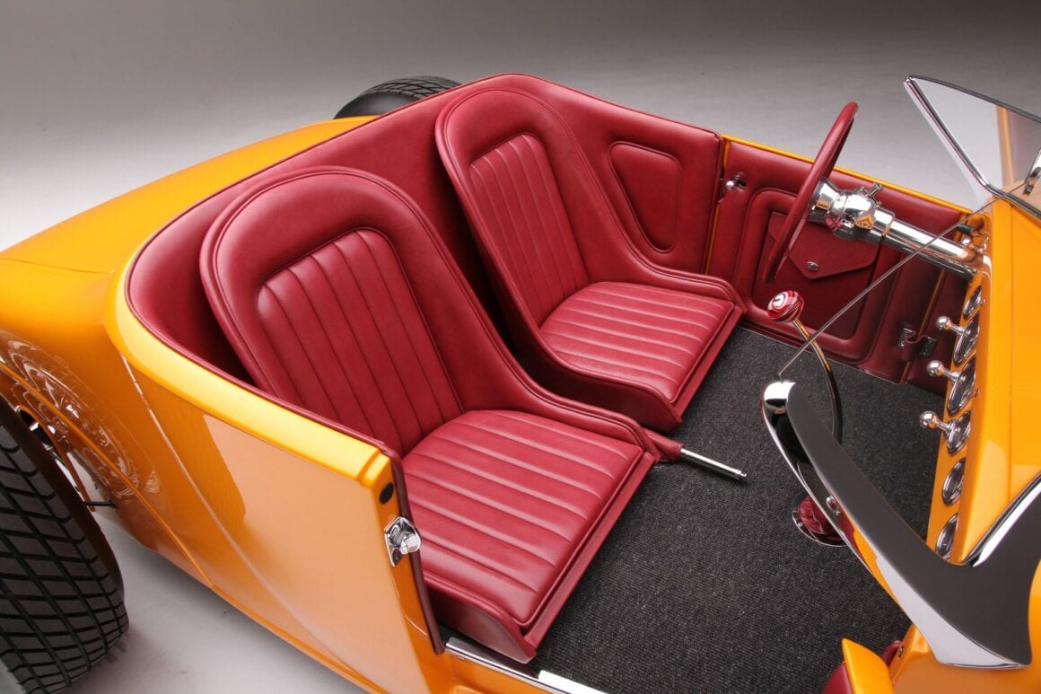 La sellerie en cuir de Fat Lucky de Glendale, en Californie, est l’une des rares choses qui n’a pas été faite en interne par le clan Chopit qui a formé une pièce de finition à mettre en place là où une bande d’accrochage entoure normalement un T-bucket, puis le cuir Fat Lucky a recouvert une paire de sièges baquets en aluminium Speedway ainsi que le coffre et les intérieurs. Sur le tunnel de transmission recouvert de moquette, il y a un levier de vitesses Genie équipé d’un levier de vitesses en acier inoxydable, il se connecte à la 700-R4 construite par Harrell’s Transmission de Covina, en Californie. Le volant sur la colonne inclinable personnalisée a été fabriqué sur mesure puis enveloppé de cuir. Le tableau de bord est un modèle T modifié de 1926 rempli de compteurs Stewart-Warner. Beaucoup de choses se sont passées depuis que Gary Chopit a construit le toit bulle Beatnik en Floride, puis a déménagé son entreprise familiale en Californie et quand Urban Hirsch a déposé sa Track T chez Chopit Kustom, et il est fort probable qu’Urban n’avait aucune idée que les modifications mineures qu’il a demandé à Gary d’effectuer se transformeraient en une voiture digne d’un prétendant à l’AMBR…