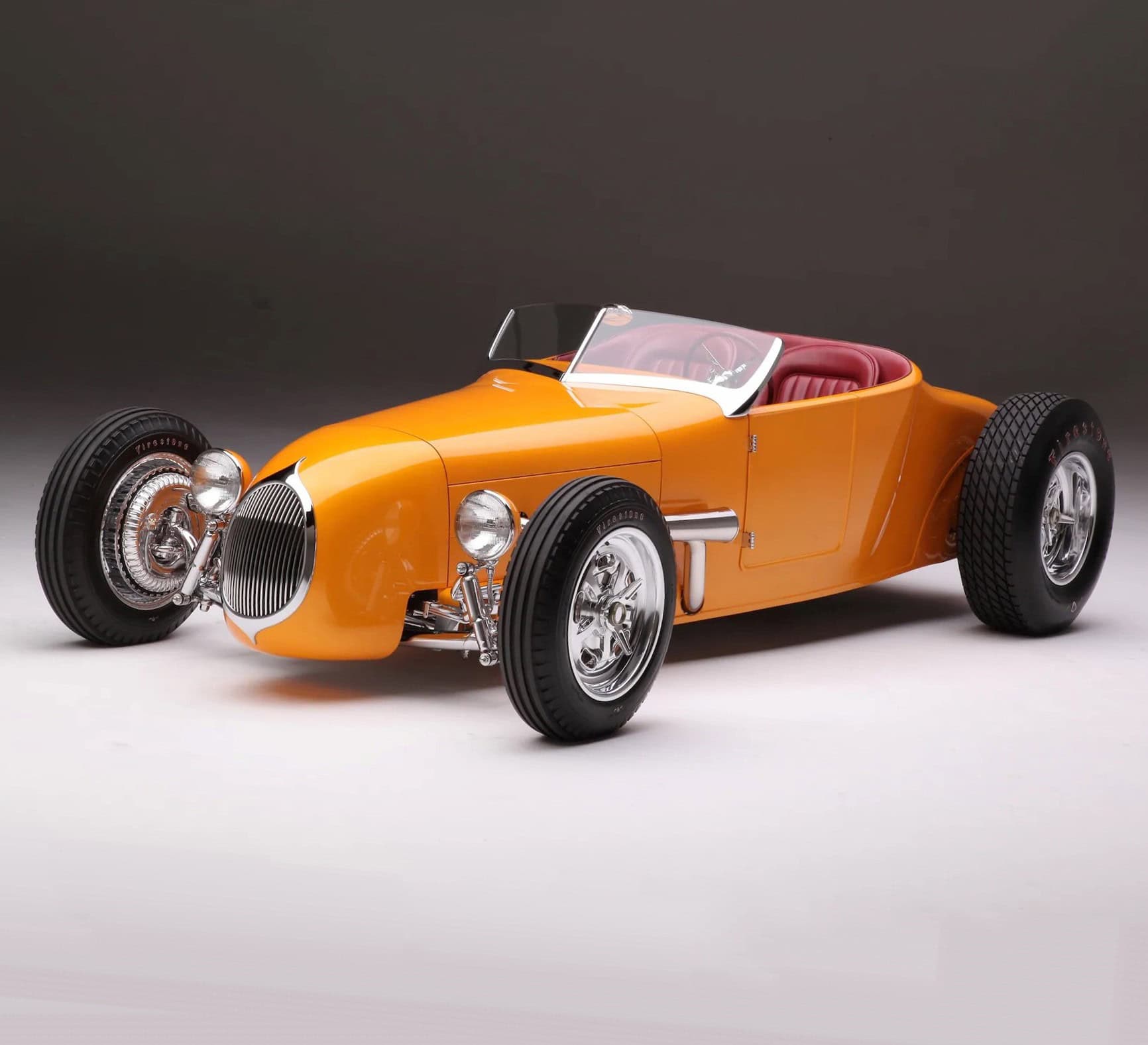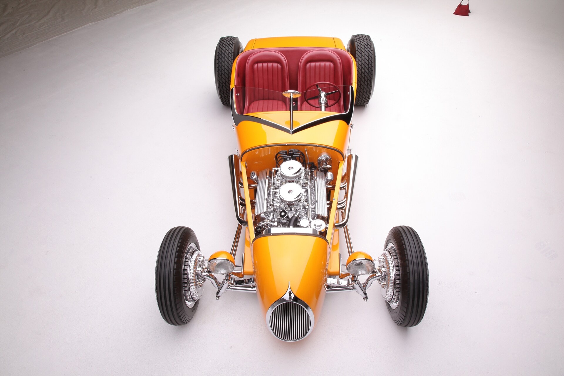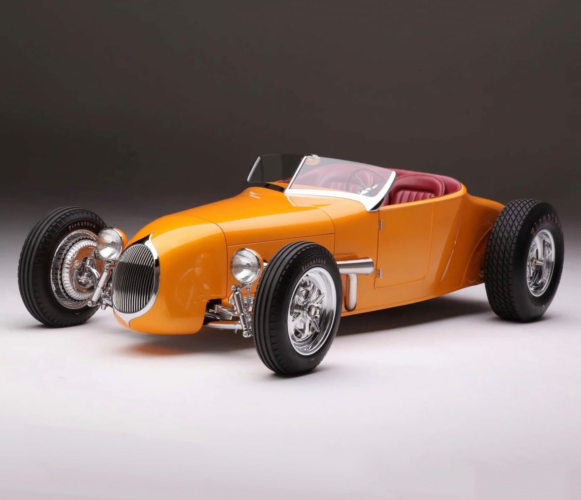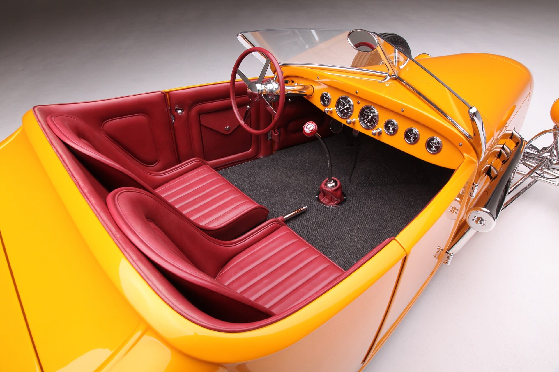 La sellerie en cuir de Fat Lucky de Glendale, en Californie, est l’une des rares choses qui n’a pas été faite en interne par le clan Chopit qui a formé une pièce de finition à mettre en place là où une bande d’accrochage entoure normalement un T-bucket, puis le cuir Fat Lucky a recouvert une paire de sièges baquets en aluminium Speedway ainsi que le coffre et les intérieurs. Sur le tunnel de transmission recouvert de moquette, il y a un levier de vitesses Genie équipé d’un levier de vitesses en acier inoxydable, il se connecte à la 700-R4 construite par Harrell’s Transmission de Covina, en Californie. Le volant sur la colonne inclinable personnalisée a été fabriqué sur mesure puis enveloppé de cuir. Le tableau de bord est un modèle T modifié de 1926 rempli de compteurs Stewart-Warner. Beaucoup de choses se sont passées depuis que Gary Chopit a construit le toit bulle Beatnik en Floride, puis a déménagé son entreprise familiale en Californie et quand Urban Hirsch a déposé sa Track T chez Chopit Kustom, et il est fort probable qu’Urban n’avait aucune idée que les modifications mineures qu’il a demandé à Gary d’effectuer se transformeraient en une voiture digne d’un prétendant à l’AMBR…