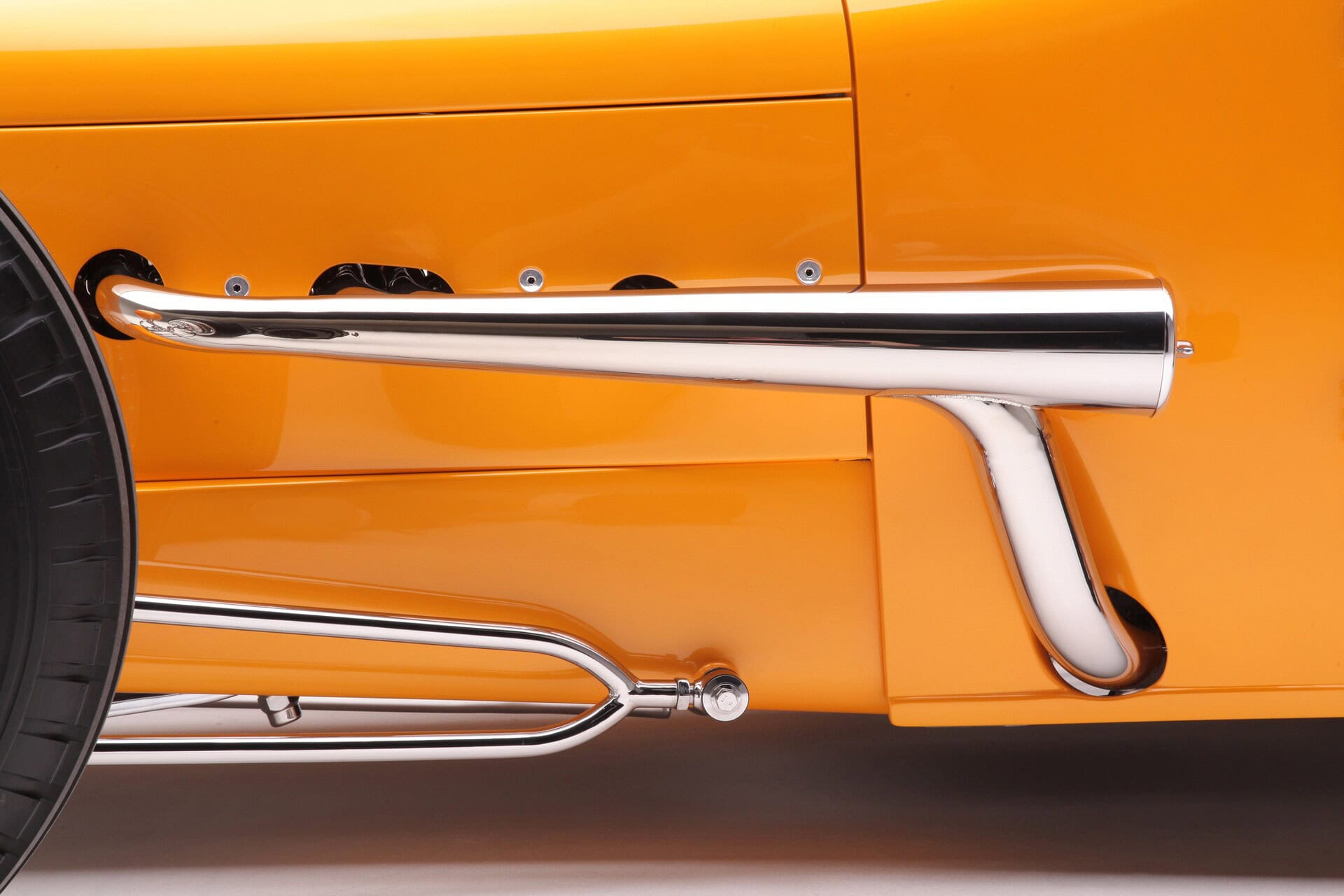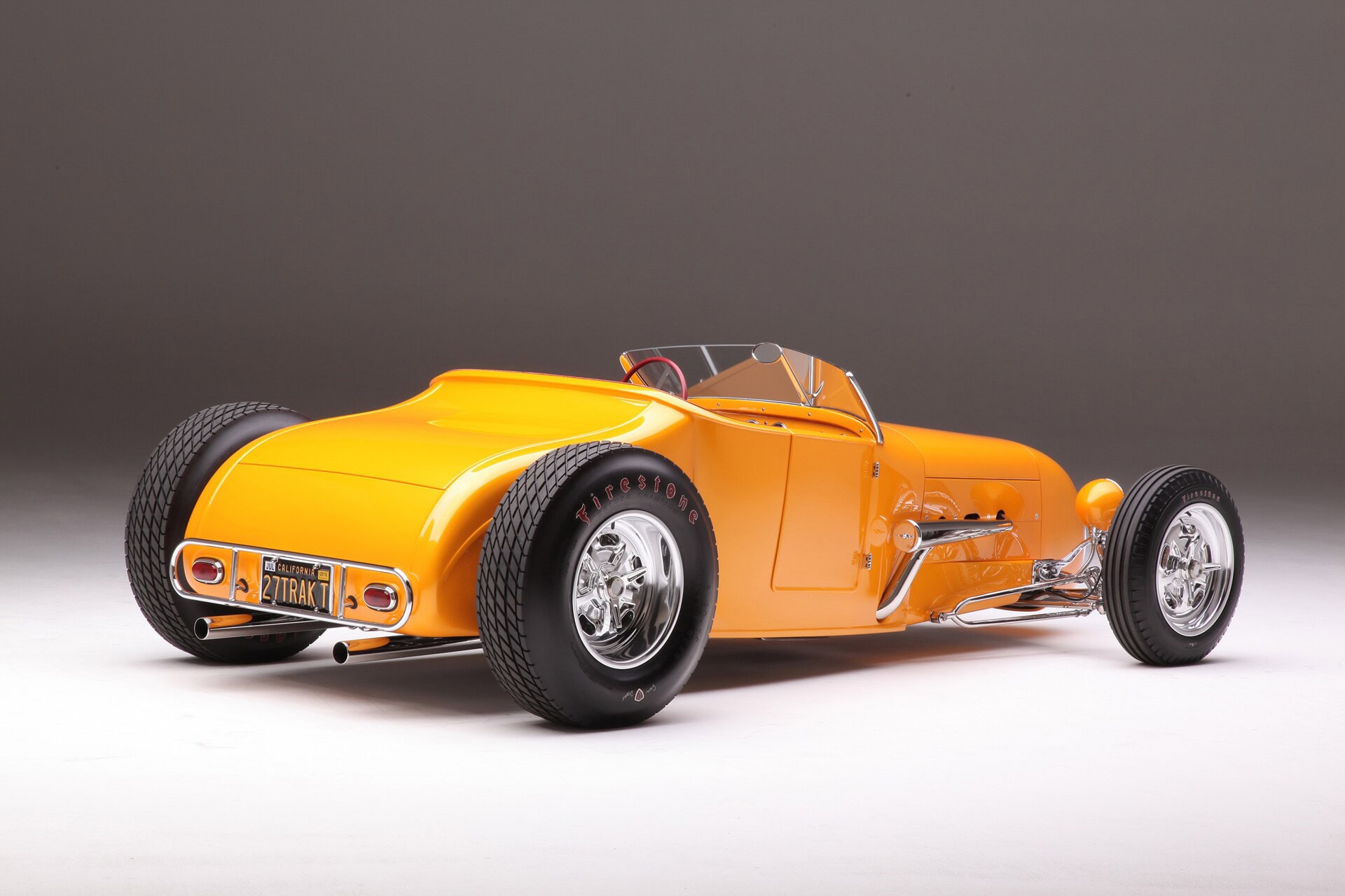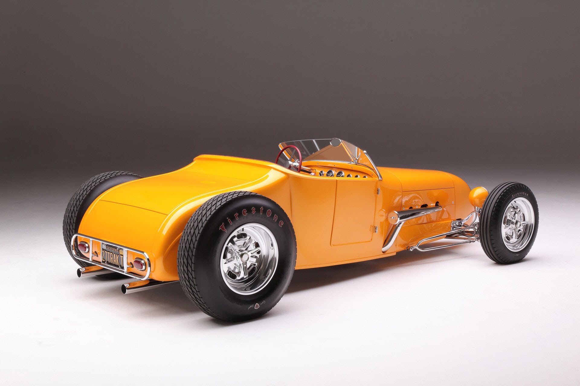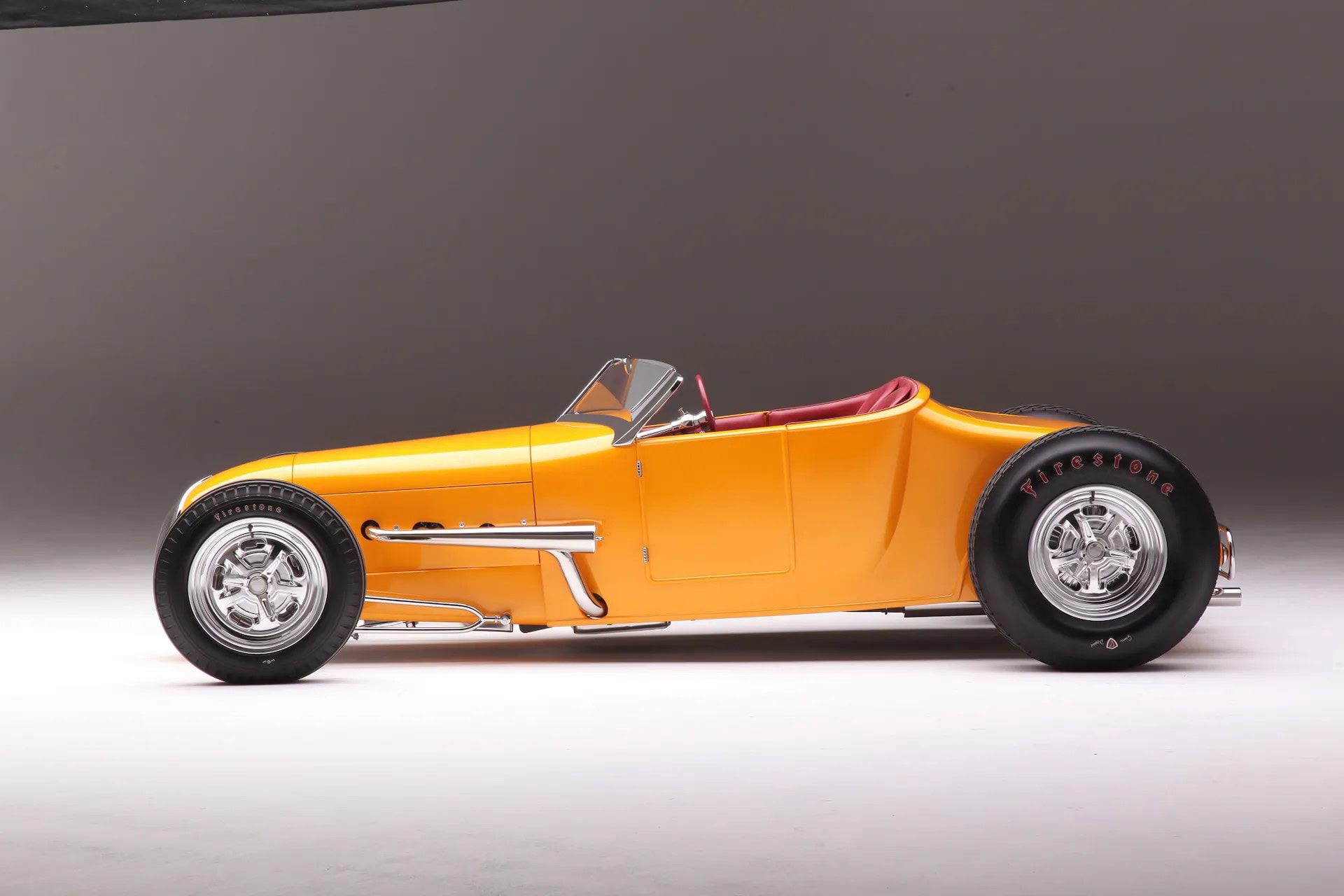 Comme pour tous les chromages de la voiture, l’arrière du Currie a été placé dans une caisse en bois spéciale et expédié à Advanced Plating à Nashville. La suspension avant est un essieu Super Bell entièrement chromé suspendu avec des axes ronds Ford et des freins à disque JHRS Kinmont Safety Stop Buick à tambour. Les quatre freins dépendent d’un maître-cylindre Corvette assisté d’un booster de 7po. Les roues avant sont des SO-CAL Knockoffs 16×5 montés sur des Firestones 5.00-16 Coker. À l’arrière, les SO-CAL Knockoffs 16×8 sont chaussées de Firestone 8.90-16 Coke. La petite amie de Nick, Kiera Brady, a peaufiné à-la-main les lettrages des Firestone Coker la veille de leurs débuts en tant que concurrent de l’AMBR. Nick a fabriqué le pare-feu du T à partir de plaques d’acier de 1/8 de pouce d’épaisseur. Cela a permis à aucun trou de montage de pénétrer la face avant du pare-feu et a créé un support extrêmement solide pour un Tri-C Engineering Steer Clear pour résoudre le problème de désencombrement de la zone autour de la plinthe. Une fois qu’il y avait plus d’espace pour les jambes, Chopit Kustom a fabriqué des pédales personnalisées pour en profiter.