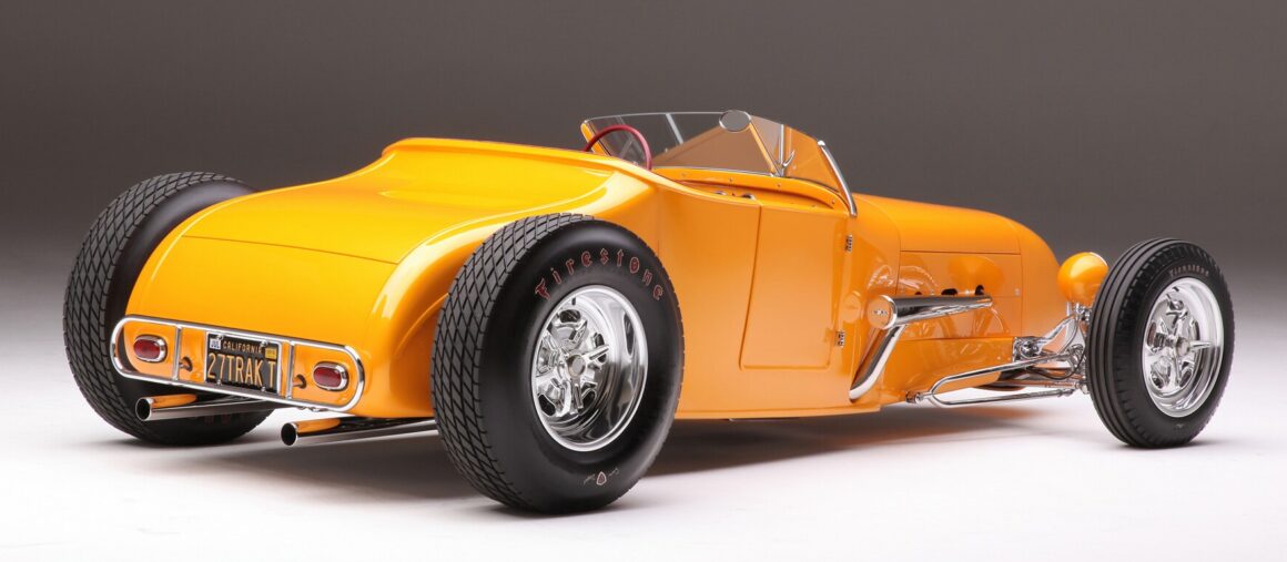 Plus tard dans la journée, je me suis souvenu que la création de Barris faite pour Mark Lindsay et le groupe s’appelait le Raider Coach, et j’ai appelé Chopit… Gary m’a invité à venir visiter sa boutique à Stanton et à voir de quoi il s’agissait. Chopit Kustom se trouve à un pâté de maisons au nord de l’endroit où se trouvaient les Hot Rods de Boyd et Kustom Kolors de Vale sur Monroe. Entrer dans la boutique fut comme une distorsion temporelle avec un vol de 2 secondes vers le meilleur Deli de New York où le menu est composé de Merc’s “hachées” et de savoureux Hot Rods assaisonnés d’un style et d’une ingénierie totalement uniques à Gary Chopit… Je n’avais pas vu la voiture depuis 20 ans, c’était lors de l’une de mes visites hebdomadaires pour mon magazine “TopWheels”… Je suis entré chez Chopit Kustom et j’ai découvert que le Track ‘T d’Urban Hirsch était là pour se refaire une beauté. Pour une raison quelconque, Urban a dit à Gary de lui trouver une vraie carrosserie de roadster’T 1927 en acier, produite par Henry donc légalement immatriculable. Ce n’était donc pas pour être une nouvelle construction totale à partir de zéro…