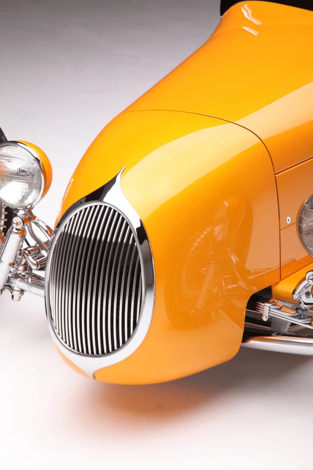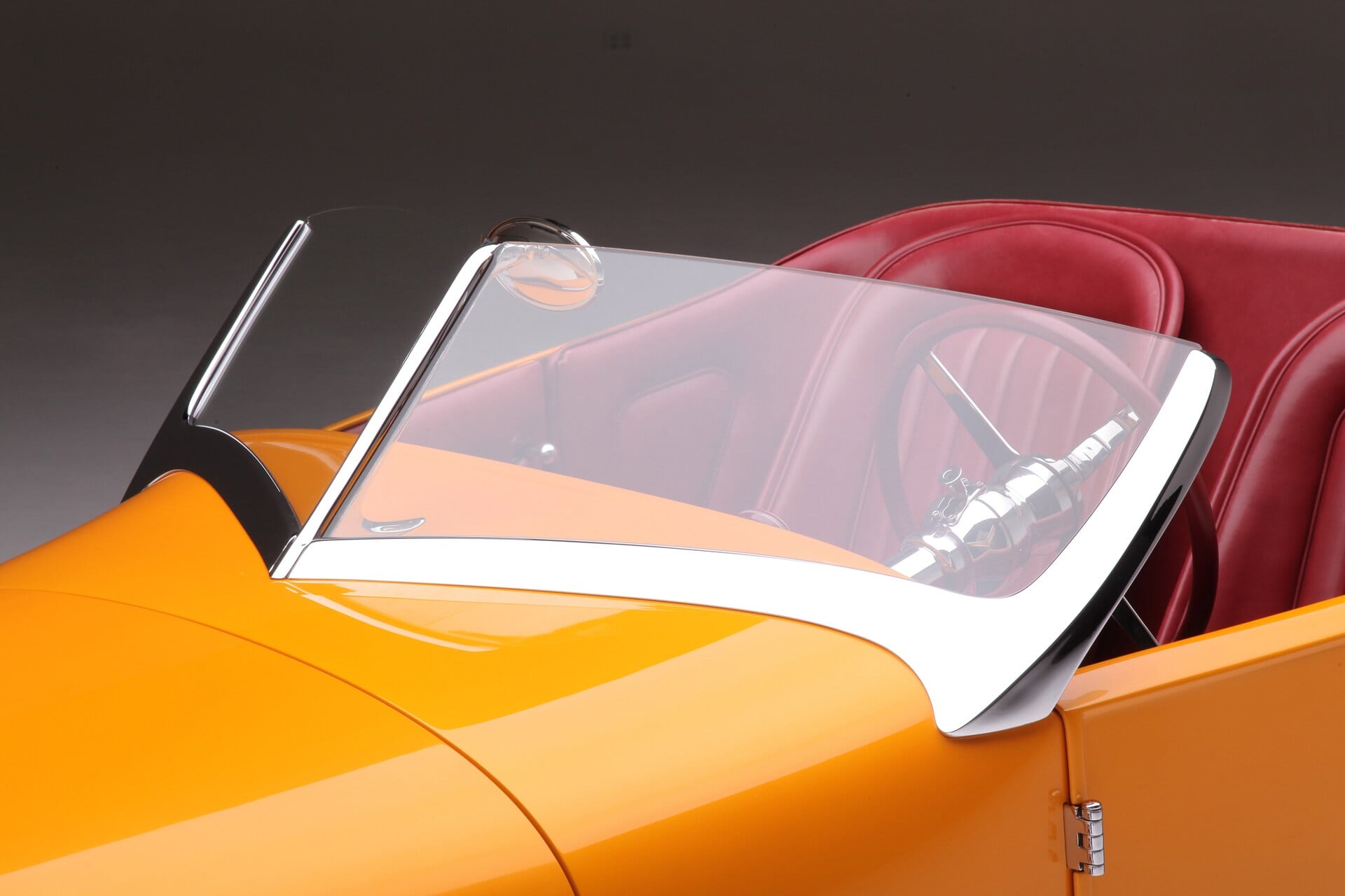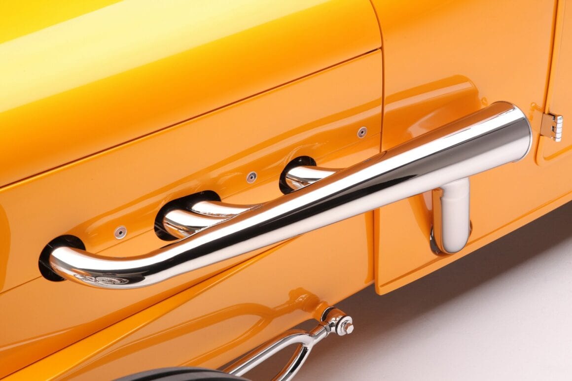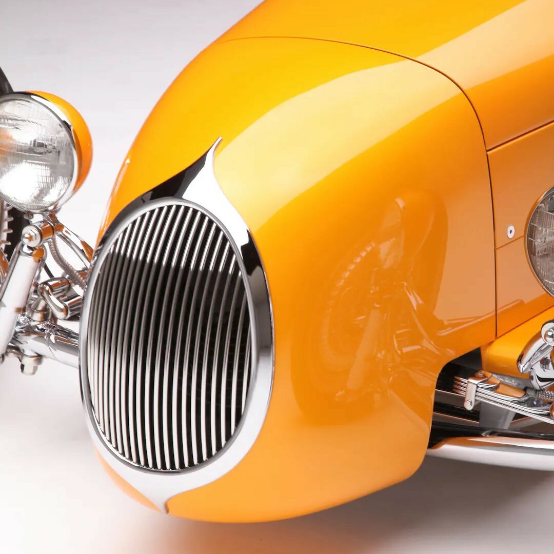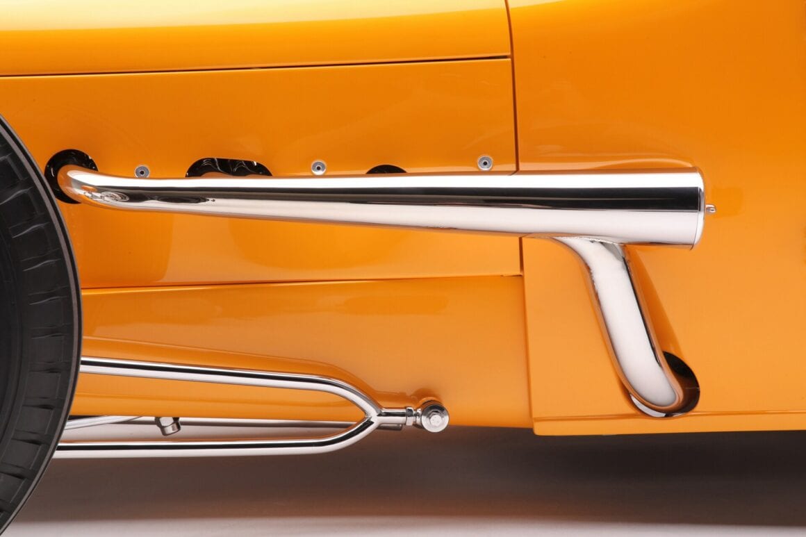 Retourné vers le haut, les montants de porte ont été fortement renforcés, de sorte que lorsque les portes sont fermées, elles cliquent silencieusement comme on s’attendrait à ce que les portes Rolls-Royce s’adaptent et sonnent. Regardez tous les espaces sur la voiture et vous remarquerez un ajustement parfait. À seulement 21 ans, Nicky Chopit a ainsi tenté de fabriquer son premier “nez de chenille” en aluminium. Nick a pris une grande feuille d’aluminium et l’a modifiée en ce qui ressemblait à un emballage de chewing-gum froissé, qu’il a dessiné sur un bouc en bois et qui s’est transformé en un nez parfaitement formé. Lorsque le moment est venu de peindre, le nez a reçu un apprêt, mais aucun mastic de carrosserie n’a été nécessaire. Nick a utilisé le bouc avant pour fabriquer un gabarit afin de former le contour de la calandre en laiton massif et le remplir de barres de calandre fabriquées en acier inoxydable. Pour le pare-brise, Nick a commencé avec un cadre de pare-brise Speedway DuVall et l’a coupé. La touche finale a été un voyage à Nashville pour une partie du bon vieux chromage du Tennessee recommandé par Speedway Motors.