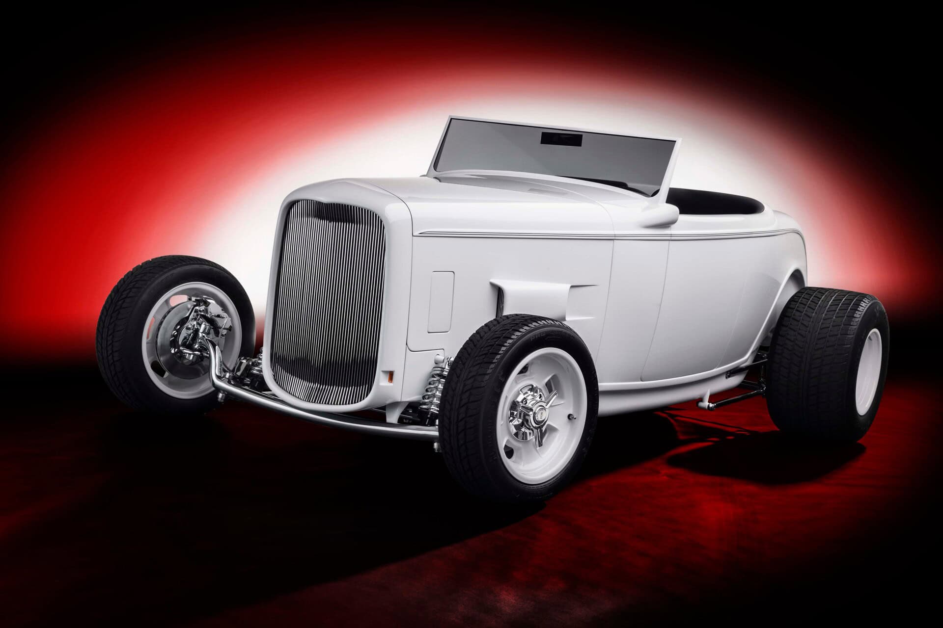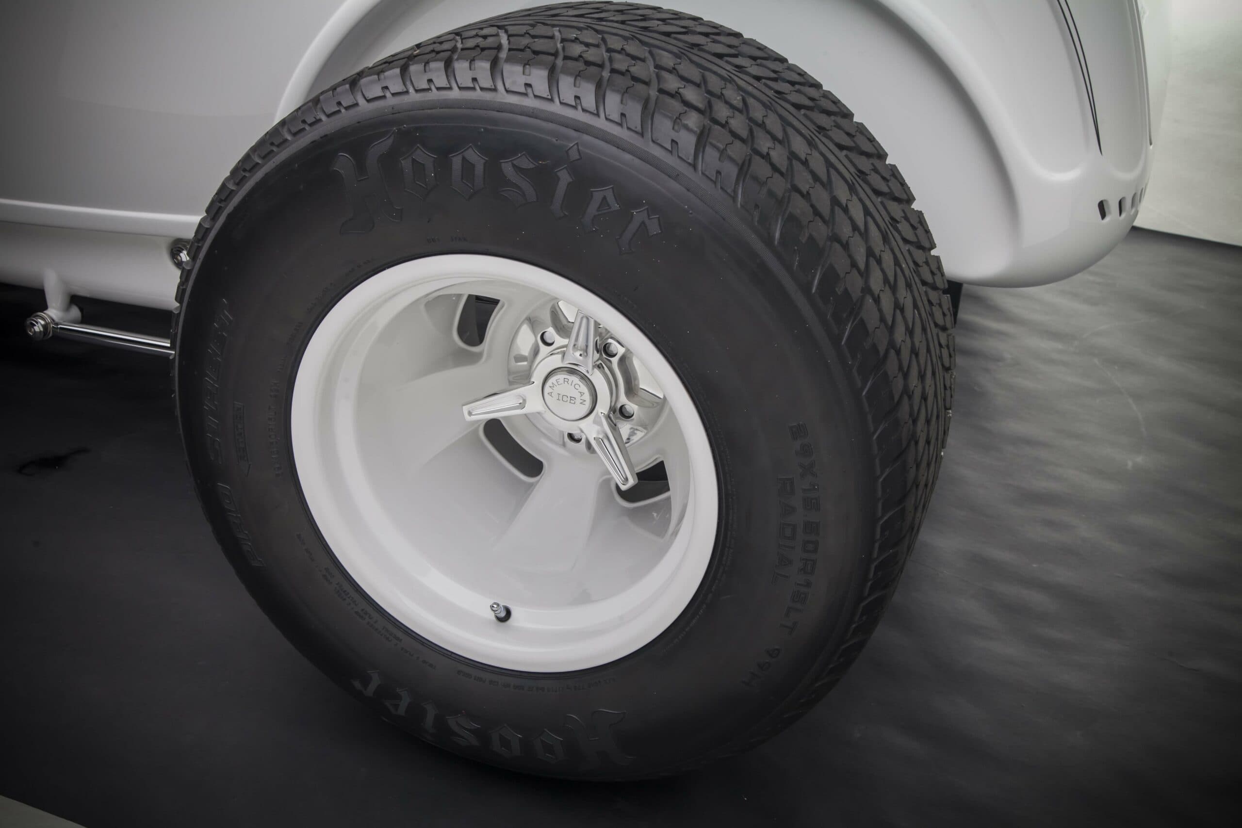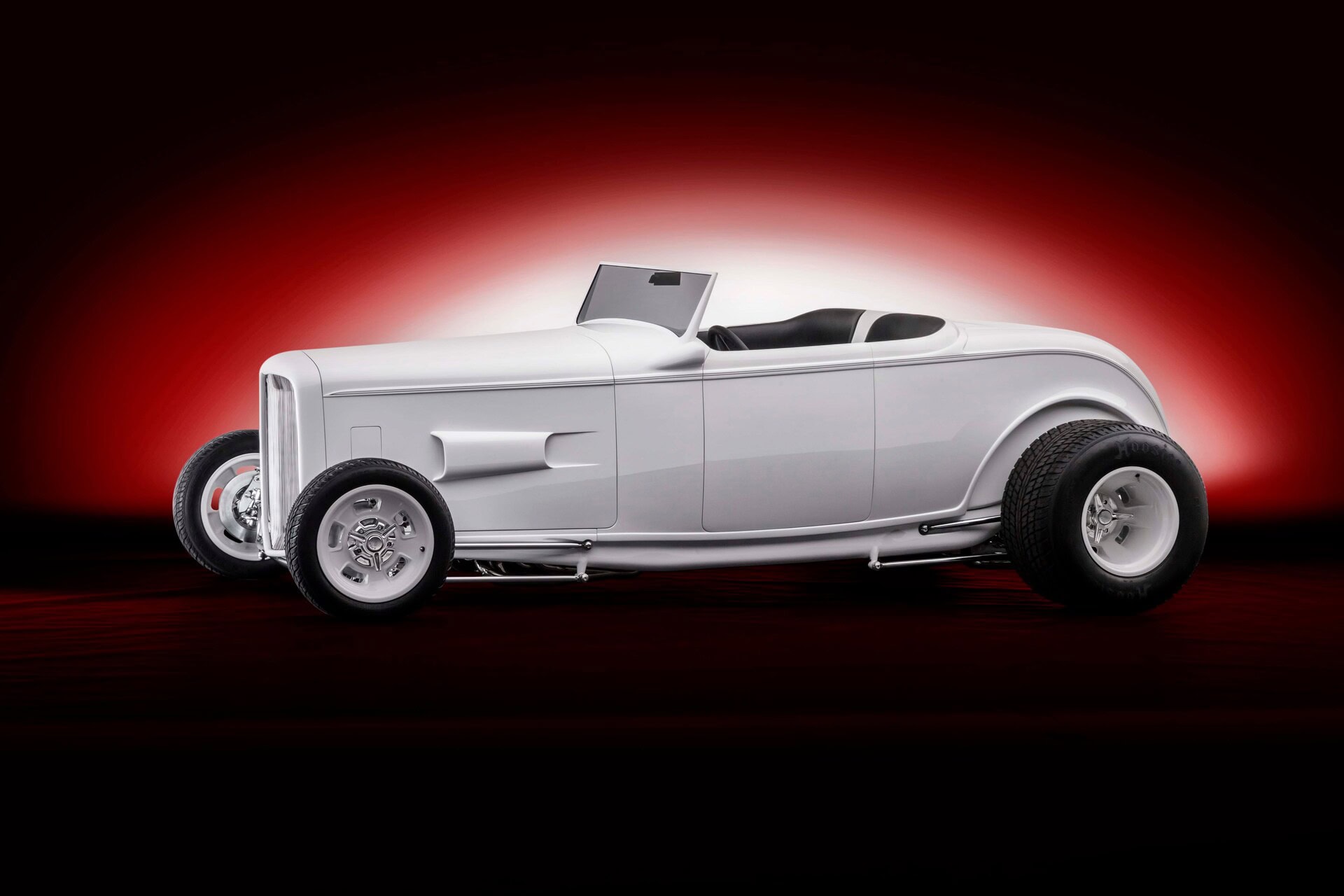 Ce roadster révolutionnaire de Sacramento a été construit par Dennis King de chez Kings Fabrication situé à Turlock, en Californie. King a construit la voiture “à la main”, en ajoutant des centaines de pièces uniques et de détails personnalisés. Comme les 23 autres Hot Rods Deuce de la collection de Gary, ce Highboy blanc est en acier d’Henry Ford… Bien sûr, Henry ne reconnaîtrait pas toutes les modifications apportées à la carrosserie, telles que les panneaux de carrosserie, le capot et la calandre fabriqués “à la main” (avec des clignotants “Frenching”) et les écopes latérales du capot (nécessaires pour le Hemi).