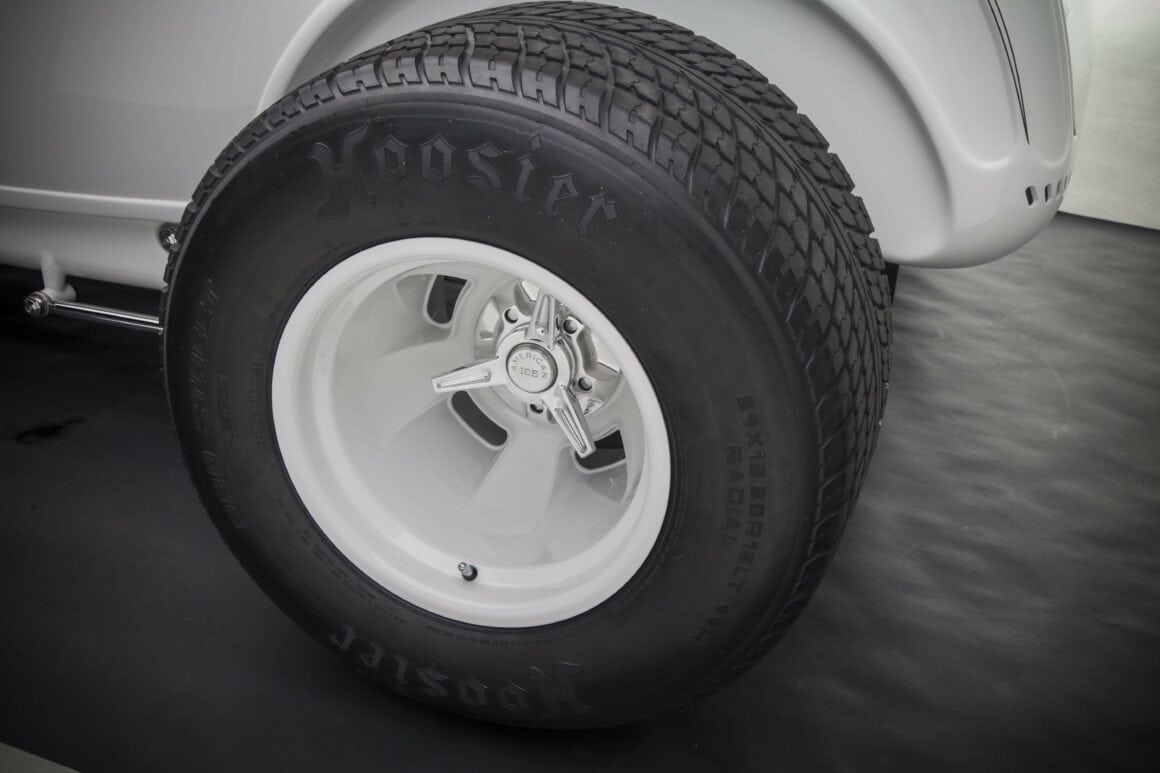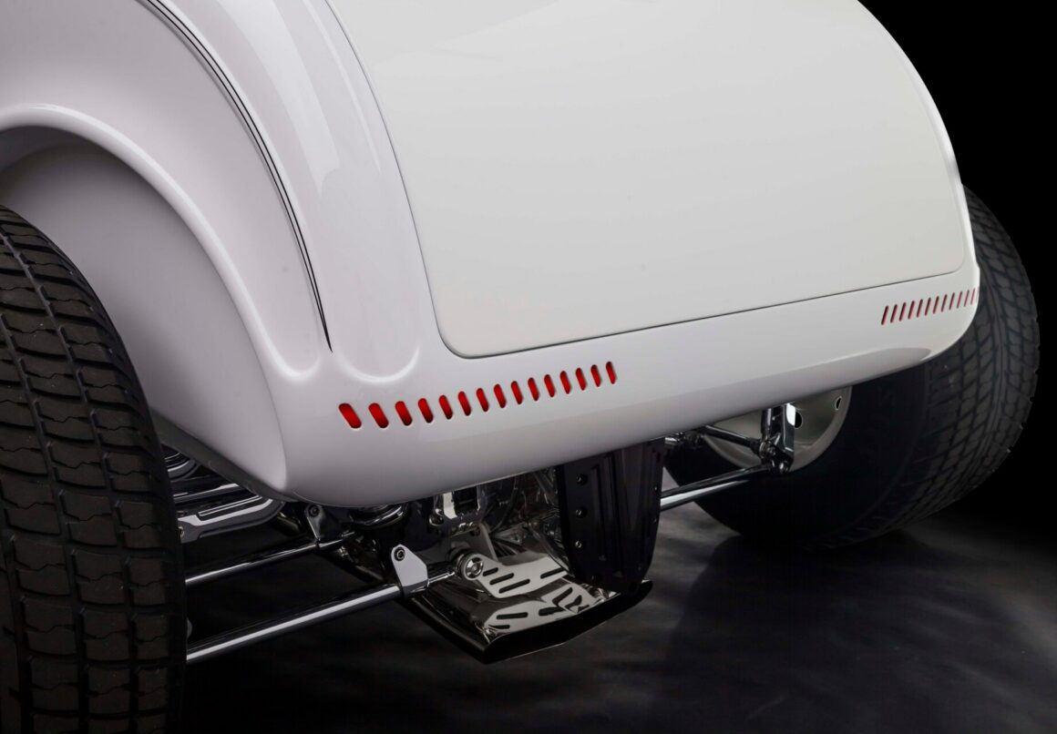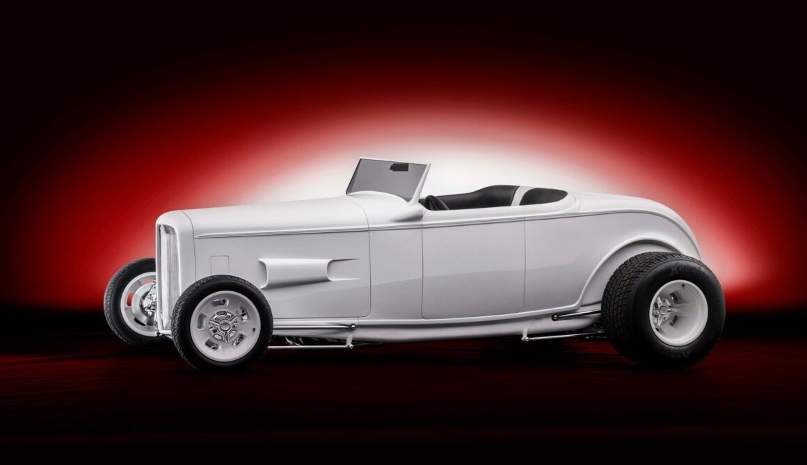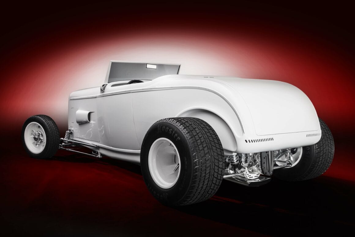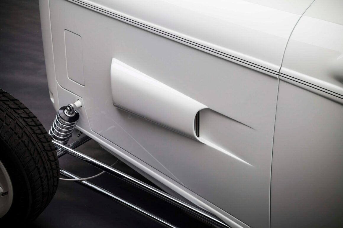 Il y a aussi les phares rectangulaires rabattables cachés, les rétroviseurs moulés, le cadre de pare-brise moulé, les portes inversées avec charnières cachées et les feux arrière “fendus”. Les proportions ont également été modifiées. Ces portes ont été étirées de 2 1/2po, le capot a été raccourci de 2po et le capot a été allongé. L’empattement a été allongé de 4po par rapport aux 106po d’origine. À Oakland il y a quelques années, le ’32 de Gary était en compétition pour le prix du meilleur roadster des États-Unis. Aussi radical soit-il, il a été devancé par le Roadster modèle T à nez de chenille d’Ermie Immerso.