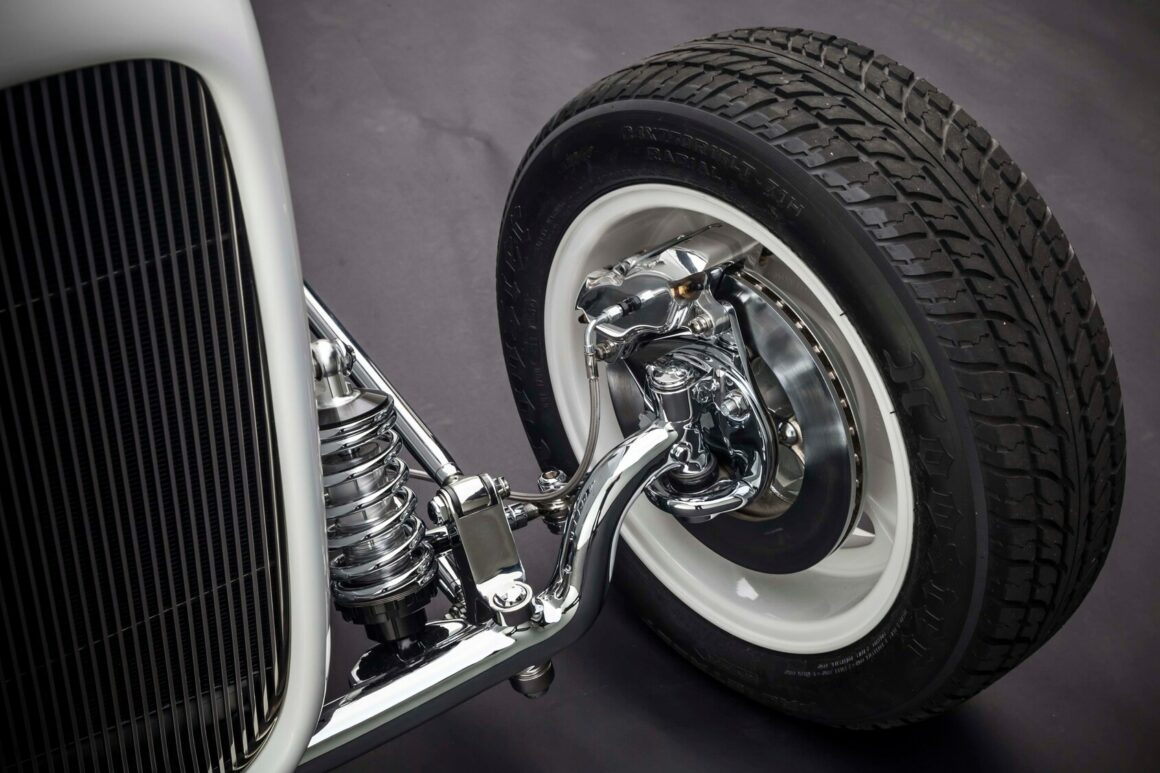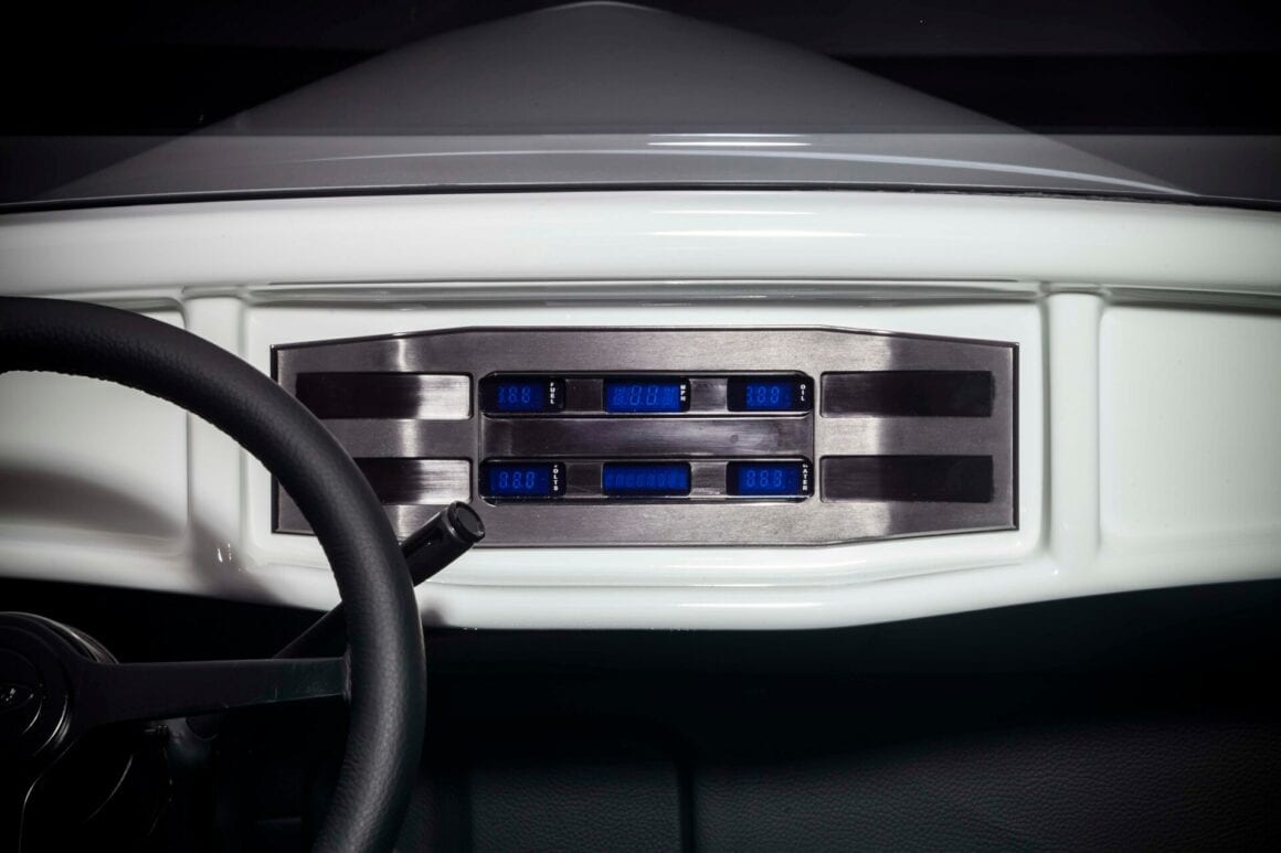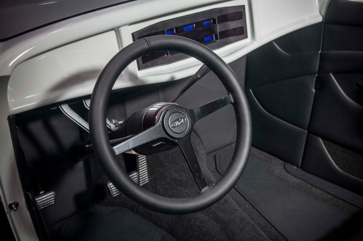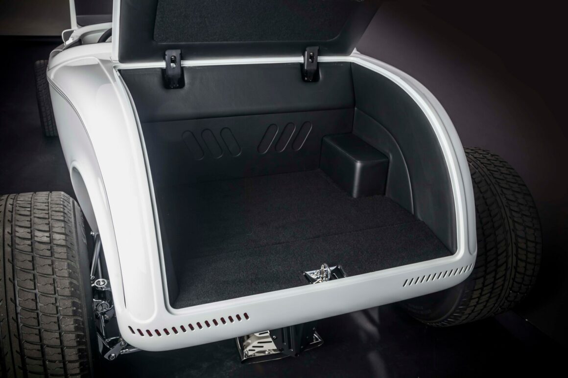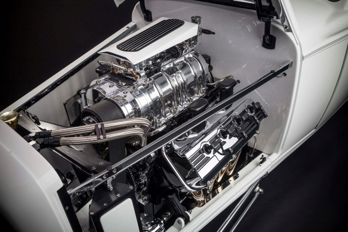 Il y a aussi les phares rectangulaires rabattables cachés, les rétroviseurs moulés, le cadre de pare-brise moulé, les portes inversées avec charnières cachées et les feux arrière “fendus”. Les proportions ont également été modifiées. Ces portes ont été étirées de 2 1/2po, le capot a été raccourci de 2po et le capot a été allongé. L’empattement a été allongé de 4po par rapport aux 106po d’origine. À Oakland il y a quelques années, le ’32 de Gary était en compétition pour le prix du meilleur roadster des États-Unis. Aussi radical soit-il, il a été devancé par le Roadster modèle T à nez de chenille d’Ermie Immerso.