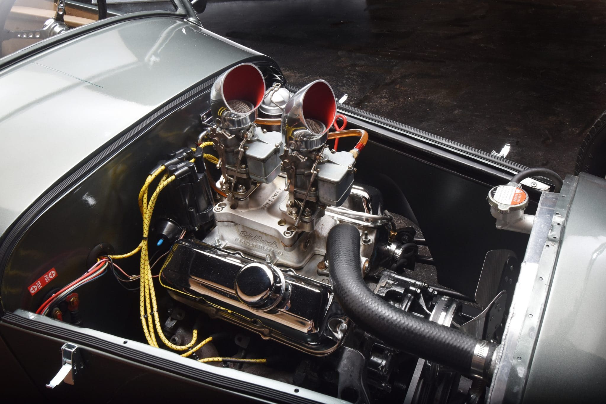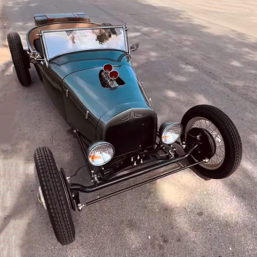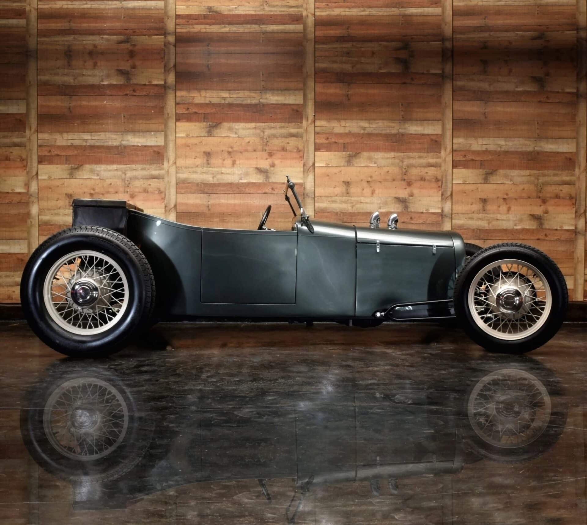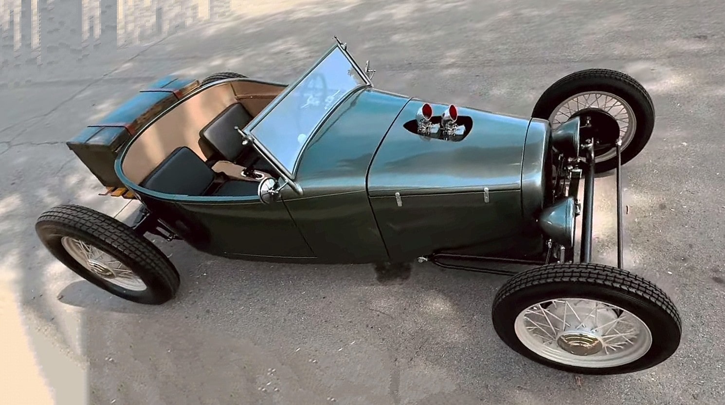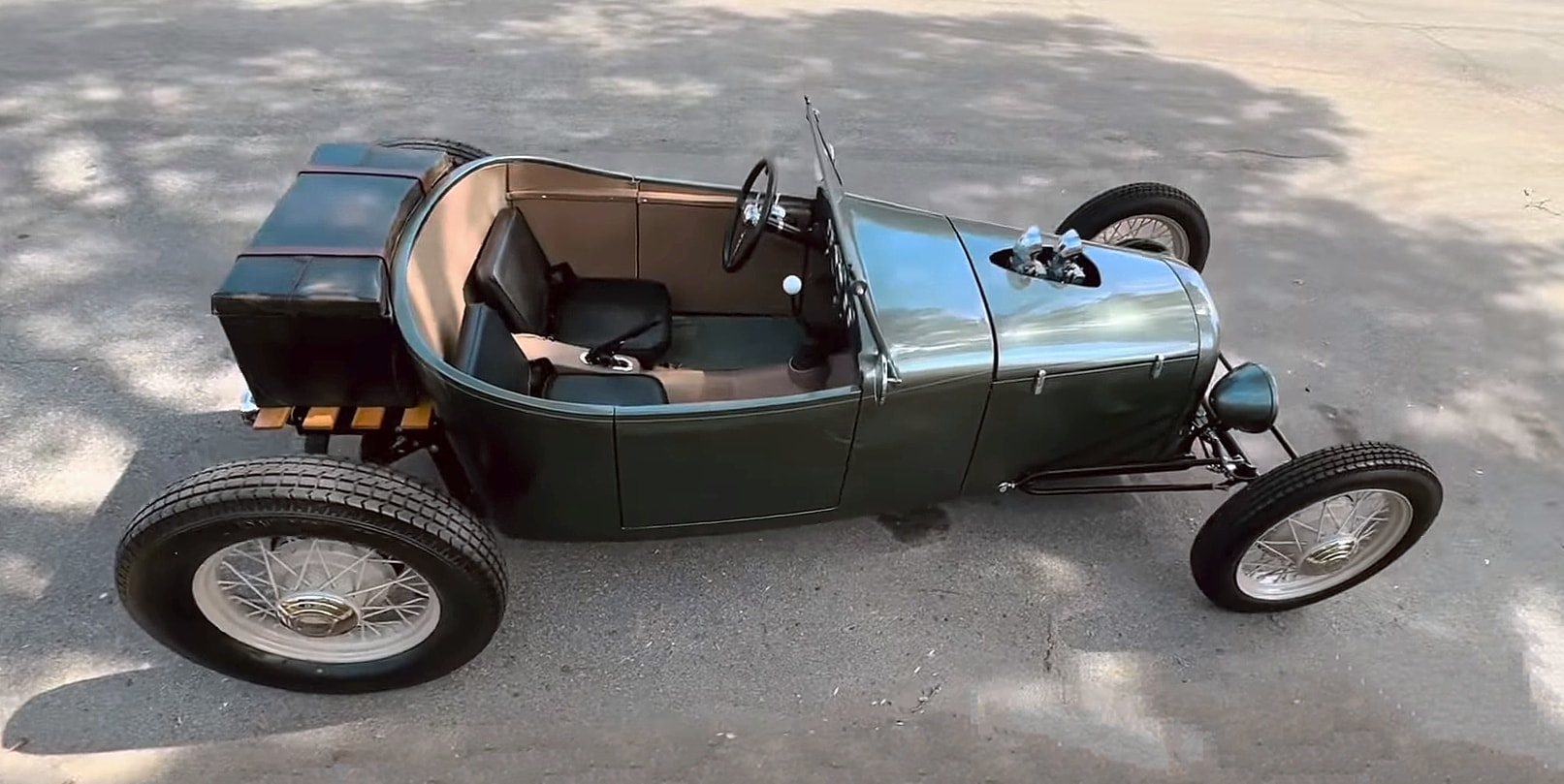 Ce Hot-Roadster de style T “minimaliste” a été construit il y a environ 15 ans par Steve Berry en utilisant une carrosserie métallique “maison” montée sur un châssis “maison”, le tout motorisé d’un V6 2L8 Twin’Carbs’Stromberg avec collecteur Edelbrock, un ensemble reconstruit “maison” accouplé à une transmission manuelle à quatre vitesses avec un pont rigide Toyota.. Pour être totalement “Vintage”, la voiture a été volontairement équipée de freins à tambour aux quatre roues et par manque de place, le réservoir de carburant a été dissimulé dans un faux bagage disposé sur un faux porte-bagages.