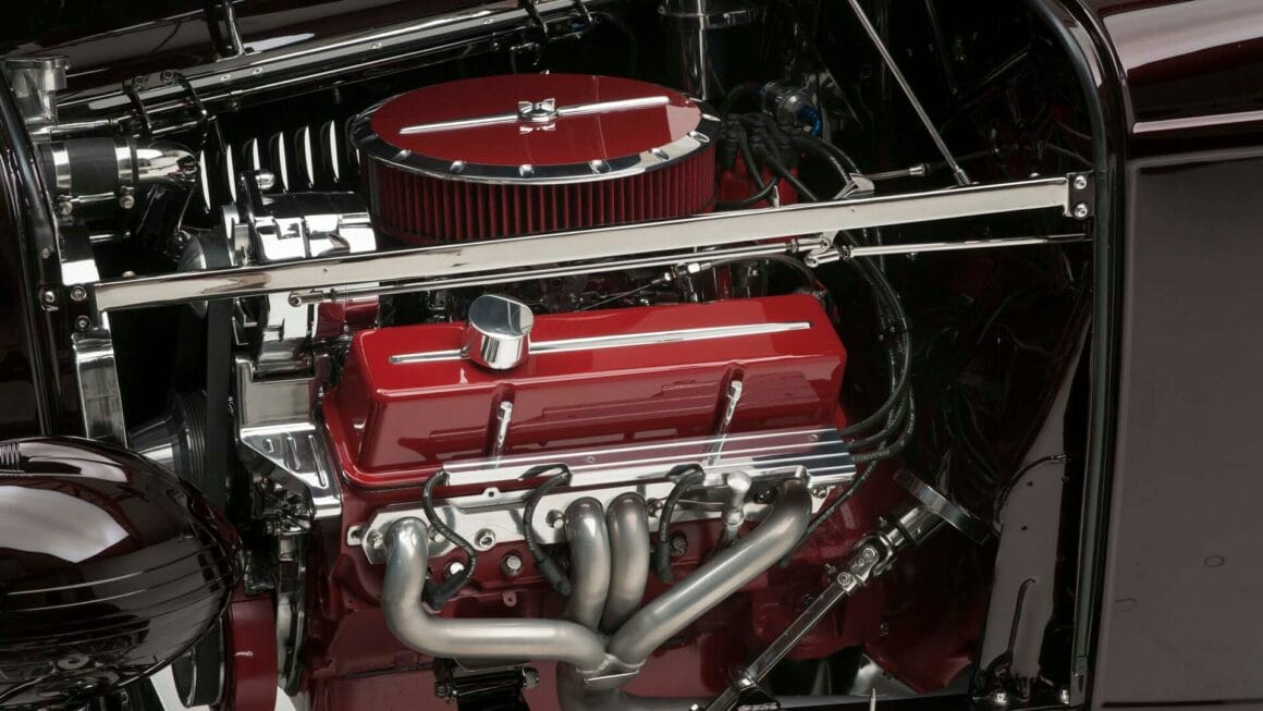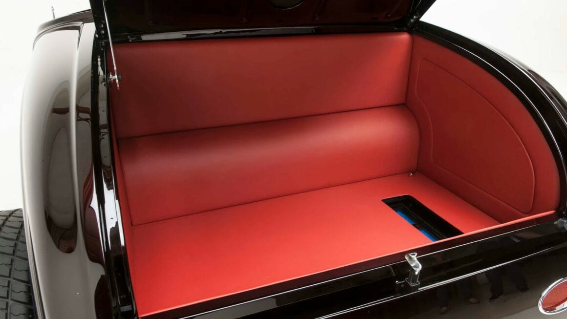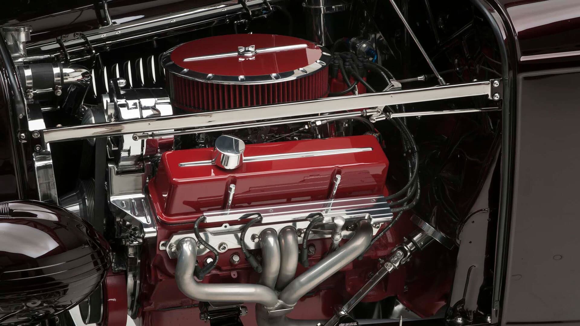 Des charnières cachées personnalisées et un bouchon d’essence intégré sont de petits détails qui font passer une voiture comme le roadster de Leonti au niveau supérieur. Lorsque le roadster a finalement été prêt à être peint, il a été envoyé à Gary’s Rods and Restorations à Watsonville, en Californie, où Jesse Cruz a pulvérisé la peinture Divine Wine Black Cherry, mélangée sur mesure par Mike Taylor. Le moteur Chevy Gen 1 de 355ci a été acheté à Jim Allen, le gars qui a fourni la carrosserie en acier. Chuck Johnson de Chuck’s Automotive à Cedar City, dans l’Utah, a effectué le travail de la machine et l’assemblage. Un compresseur Blower Shop et un collecteur personnalisé, ainsi qu’un carburateur Quick Fuel personnalisé, alimentent le petit bloc de 560cv.
