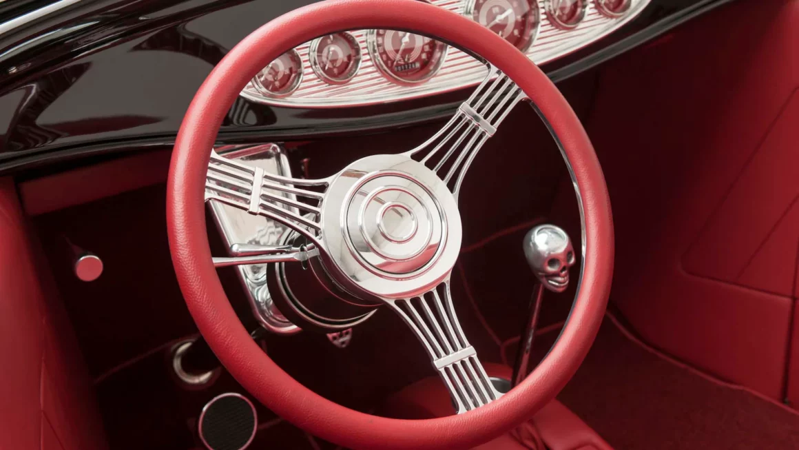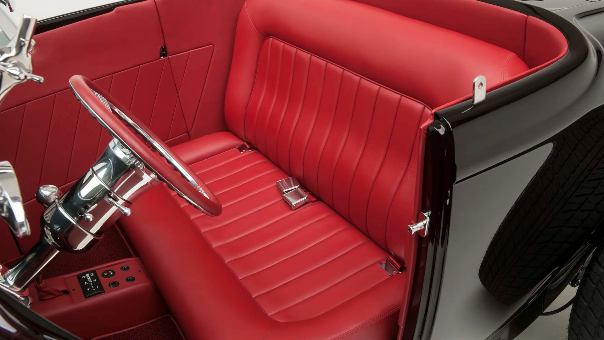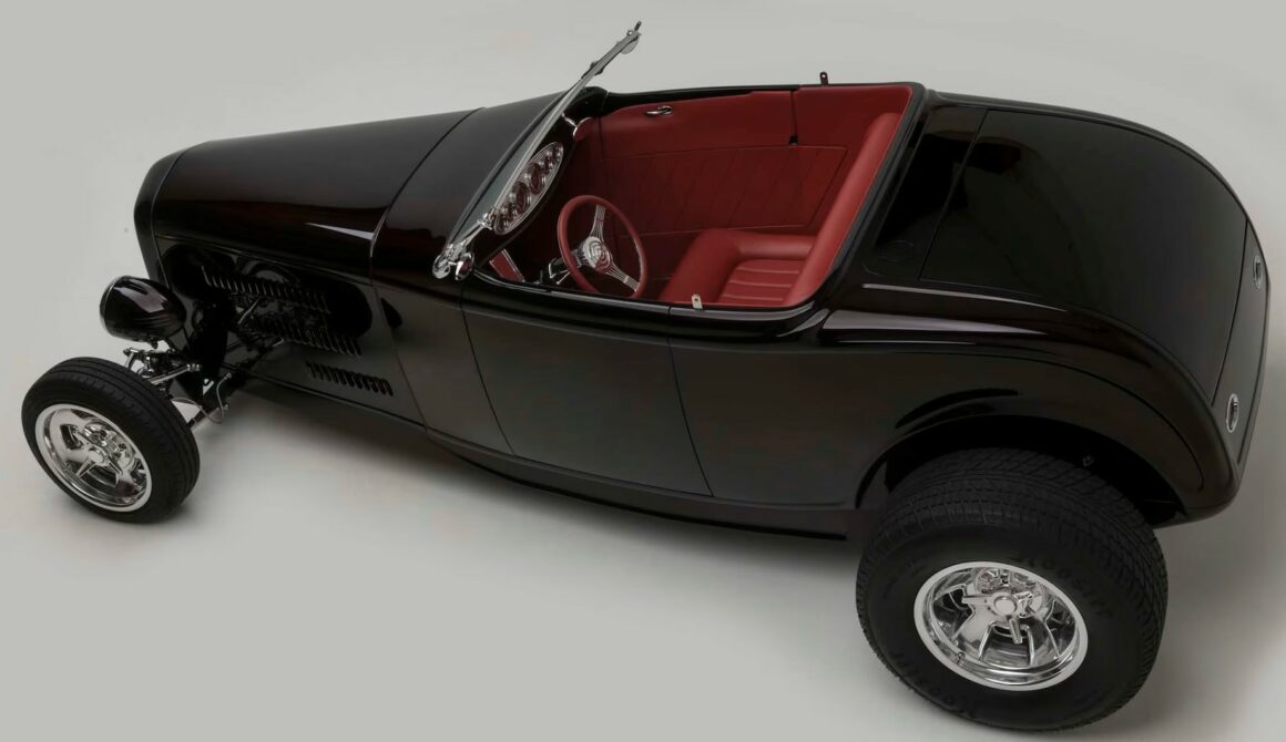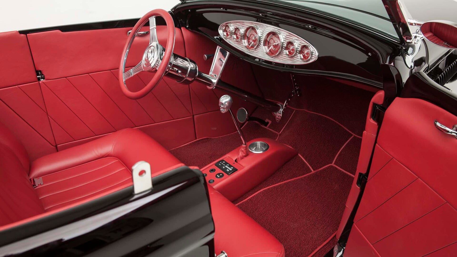 Ils ont recouvert les panneaux intérieurs du cockpit, le banc roadster à profil bas Glide Engineering et le coffre, en cuir rouge Le volant banjo Billet Specialties est recouvert de cuir assorti. La console au sol personnalisée Ron Mangus abrite le levier de vitesses Lokar à pommeau “crânien”, un port USB, un allumage et des commandes pour la position du siège et pour le système audio Kicker. Dans le tableau de bord, les compteurs Classic Instruments sont montés dans un insert… Voilà la vraie histoire… Leonti a donc officiellement passé 3 ans et demi de week-ends à construire son Hot Roadster. La réalité est que tout a été réalisé par des pros… Le coût total de ce Hot Rod aurait été d’environ 1.300.000 $ s’il avait du être payé en dollars par Leonti…