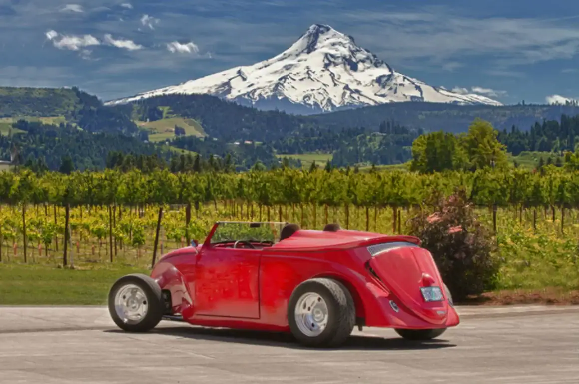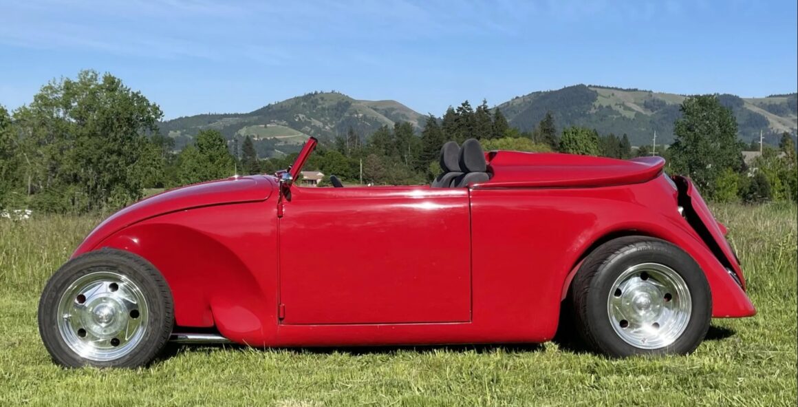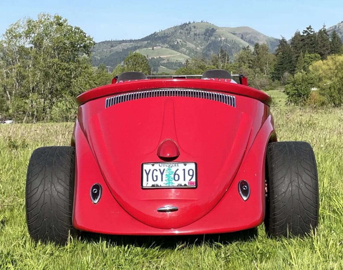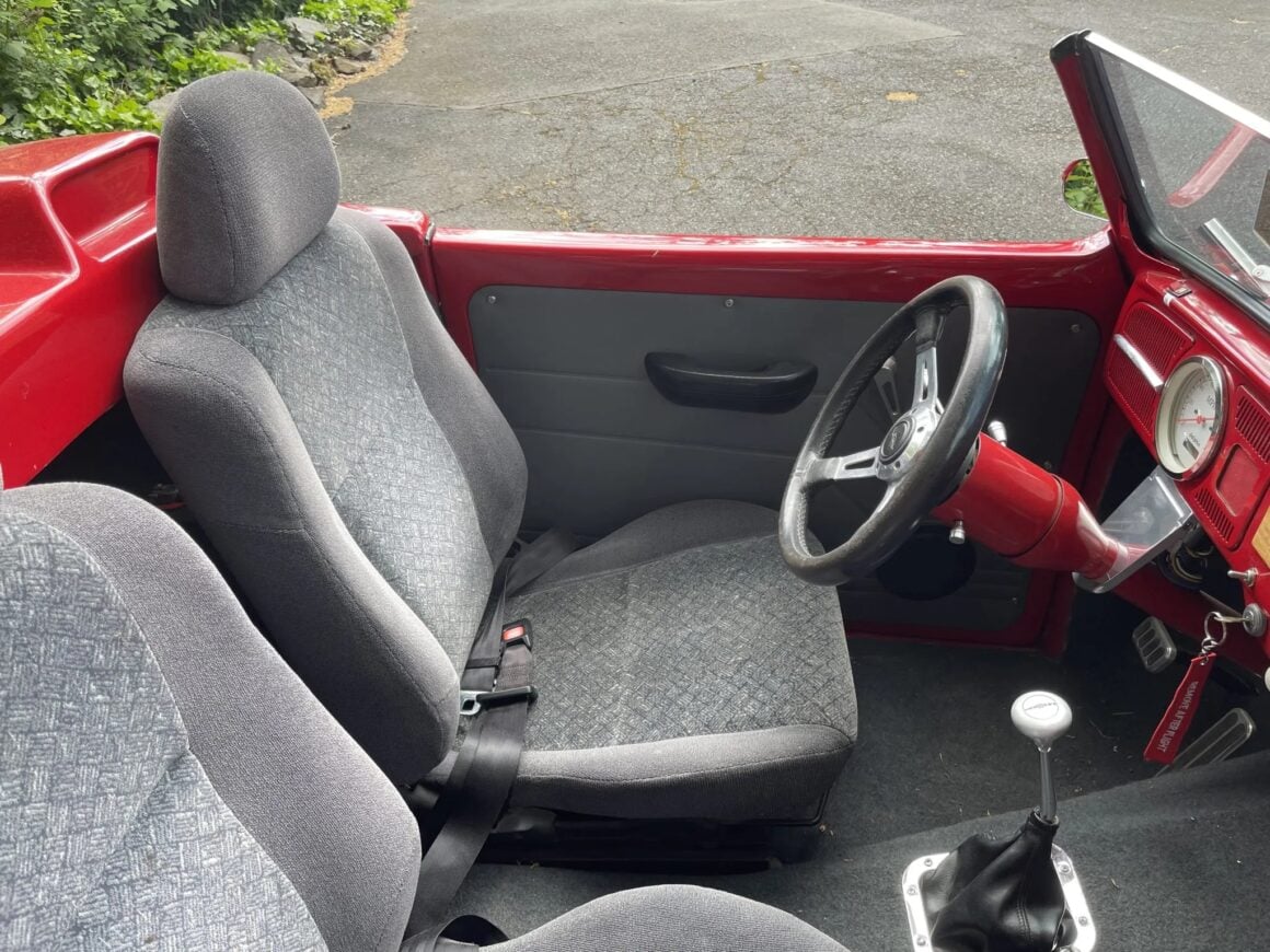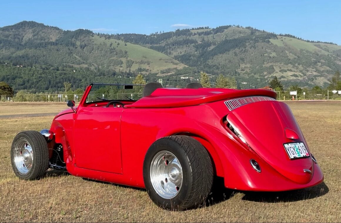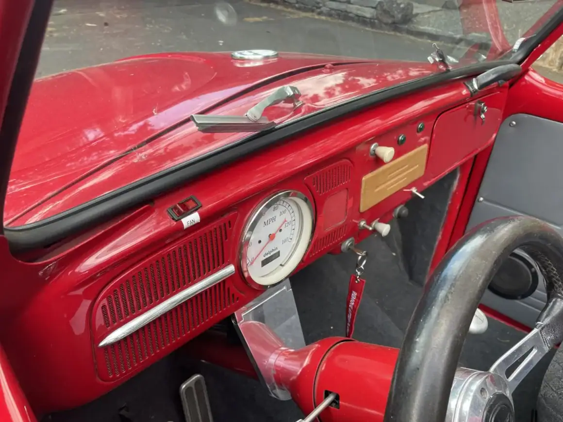 Celle-ci, comme les autres sont de marque Lokar et pour les manœuvrer avec un V8 situé plein avant, cela a nécessité de minimiser l’espace pour les jambes rendant la position de conduite “Cramped”... C’est une bagnole pour déviant sexuel masochiste… Les jantes sont des Center Line de 15po. Ce Hot Roadster Beetle est muni d’un titre de propriété de l’Oregon au nom du vendeur, stipulant que l’engin est une VW qui est détenue par son concepteur depuis 1990.