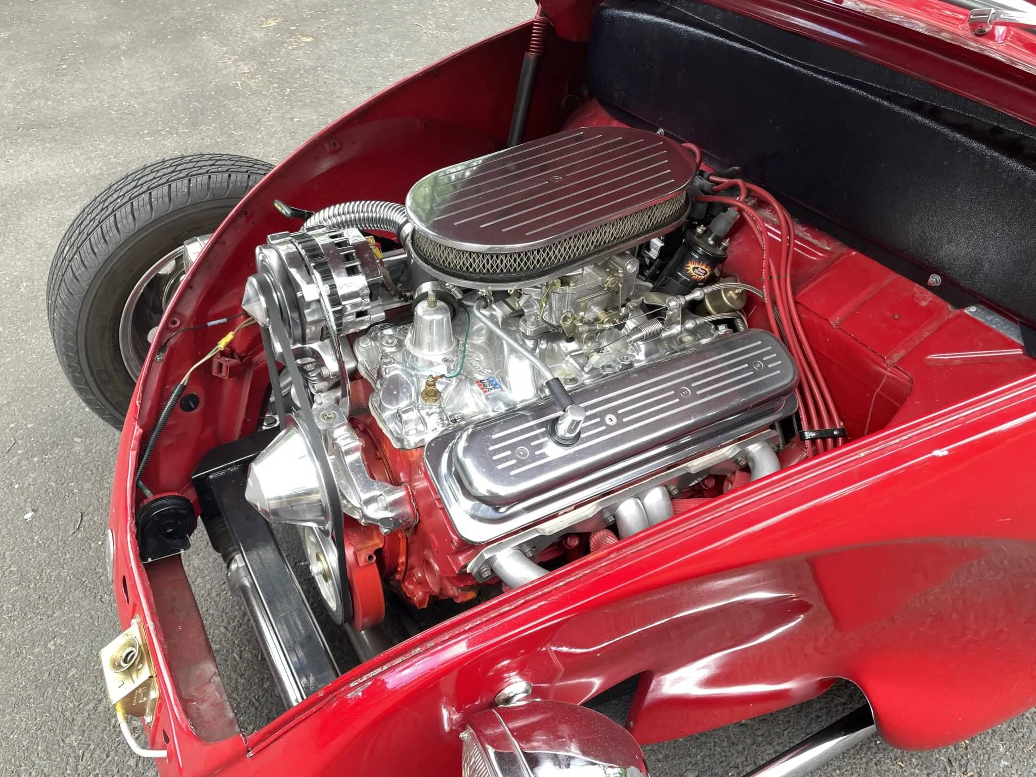 Un V8 Chevrolet 350ci a été positionné à l’avant surmonté d’un collecteur d’admission Edelbrock et d’un carburateur Weber. Des collecteurs Sanderson ont été installés de même qu’un allumage PerTronix. Et pour en terminer, c’est une transmission automatique 700R4 à quatre vitesses qui assiste le V8, et ce sont des freins à disque aux quatre roues qui ont été missionnés d’arrêter l’engin à toutes les sollicitations de la pédale.