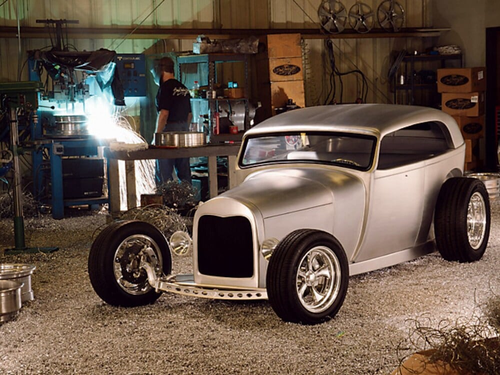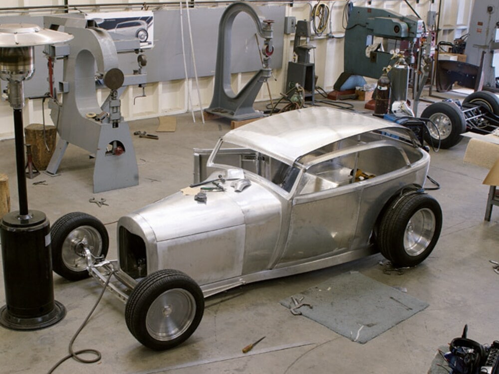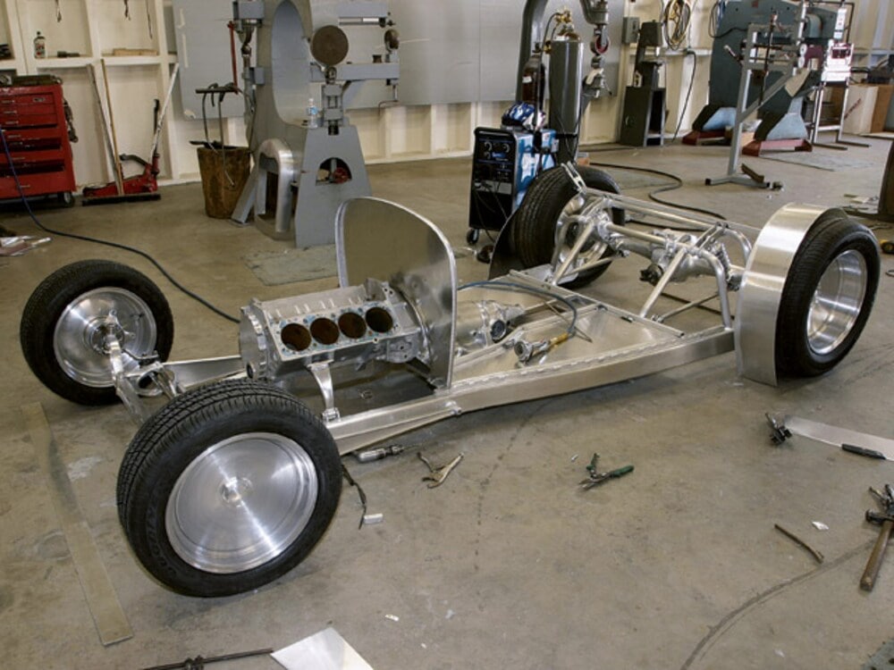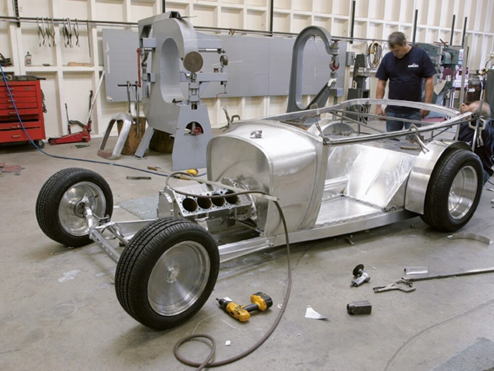 C’est “Boyd Coddington Hot-Rod Shop” à La Habra, en Californie qui a fait le boulot, avec “LA” condition qu’il soit terminé en moins de huit semaines. Le projet a été documenté du début à la fin dans cinq épisodes de la série télévisée “American Hot-Rod” de Discovery Channel qui ont été diffusés en 2004. Ce Hot-Rod est 100% en aluminium nu formé à la main par “Marcel’s Custom Metal” (et non pas par l’équipe de Boydd Coddington) sur un châssis tubulaire en aluminium fabriqué sur mesure et propulsée par un V8 350ci Chevrolet full aluminium qui respire à travers trois carburateurs Demon Six Shooter en alu.