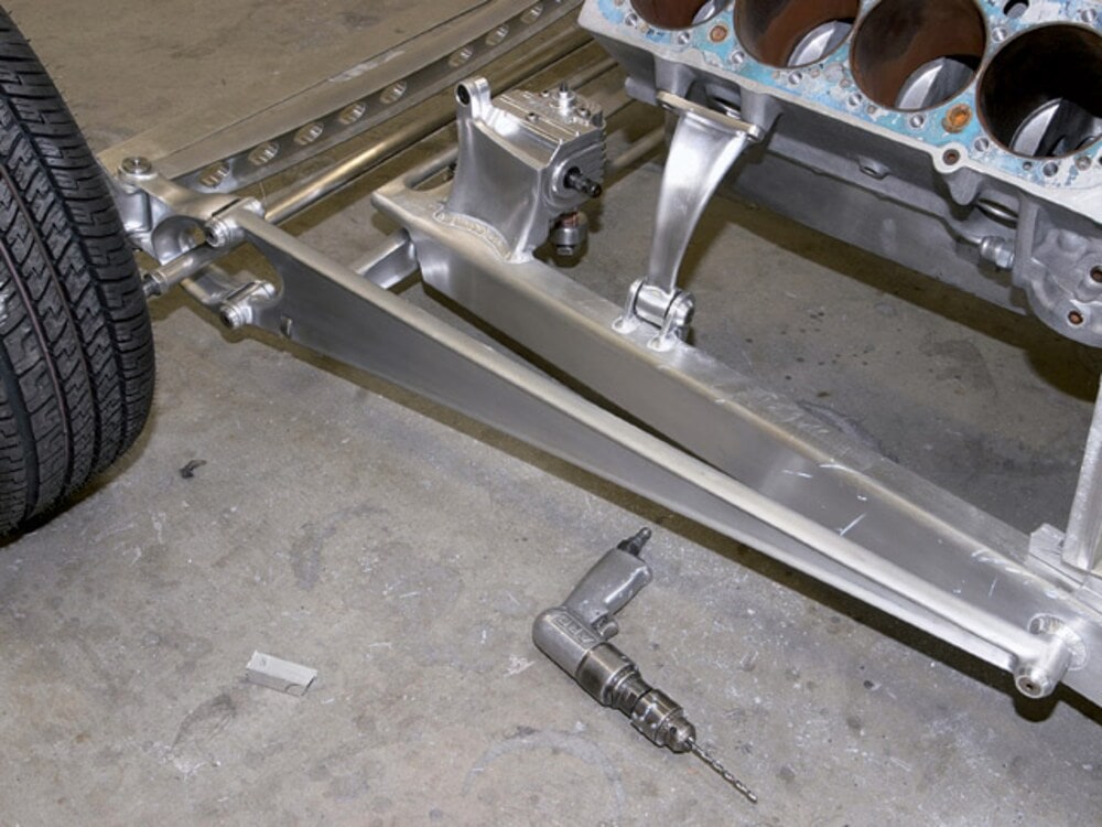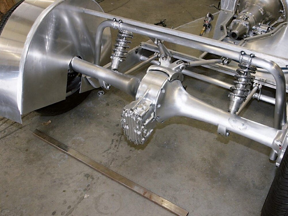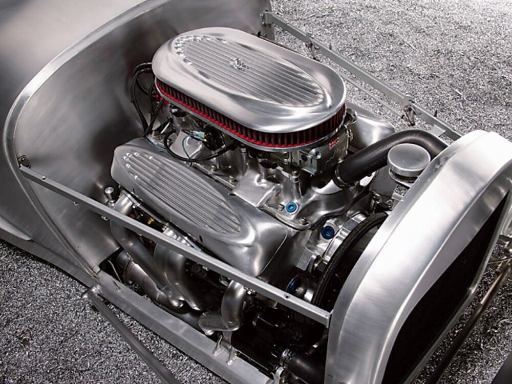 Le boîtier de direction en aluminium est un Mullins Vega. L’instrumentation Classic Instruments logée dans un tableau de bord en aluminium nu comprend un compteur de vitesse de 140 mph et des compteurs surveillant le niveau de carburant et la température du liquide de refroidissement. Le V8 350ci small bloc Chevrolet est en aluminium usiné par la “Schwartz Machine Company”, les culasses Vortec sont en aluminium, de même que l’arbre à cames à rouleaux hydrauliques COMP Cams, que les couvercles de soupapes, le carter d’huile et de couvercle de distribution en aluminium Universal Machining “Doug Upton”.