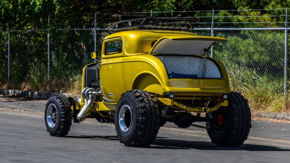 Un Hot Rod 4X4 pour crapahuter le jour dans le désert et draguer la nuit les minettes en jupettes plissée, chaussettes, baskets déambulant sur le Strip en léchant une sucette… C’est la Kooltitude façon American Graffiti… Le rêve chewing-gum mâchouillé des “Rebels without a cause” depuis les fifties comprenant un passage obligé dans une guerre (une nouvelle chaque année), le retour des héros claudiquant, le kulte de l’America first, du Rock’N’Roll guimauve d’Elvis, quelques branlées, le salut au drapeau quotidien, la survie et la mort dans les pleurs… La description de la bête est du même ordre. Il se trouvera au hasard un écrivain pour en gribouiller des pages, un cinéaste pour en réaliser des films, une pute pour branler les héros… J’suis as-been d’en tapoter des textes interminables. Chez Uncle-Joe tout se résume en quelques mots formant une ligne… C’est pas plus… C’est comme la présentation de ce Rod 4X4 mis aux enchères chez MECUM : “Known as MUD-USA / Custom 4-wheel drive build / Suicide doors / 468 CI supercharged V-8 engine / Automatic transmission / Custom Yellow reptilian-themed paint / Diamond stitched White interior / Tilt steering column / Power windows. Waaahhhhhh ! No reserve… Best offer…. Only Ca$h please”… J’y ajoute : “Have a nice day… Fuck-You… So long… Its all folks… Go to Hell… American Psycho”...