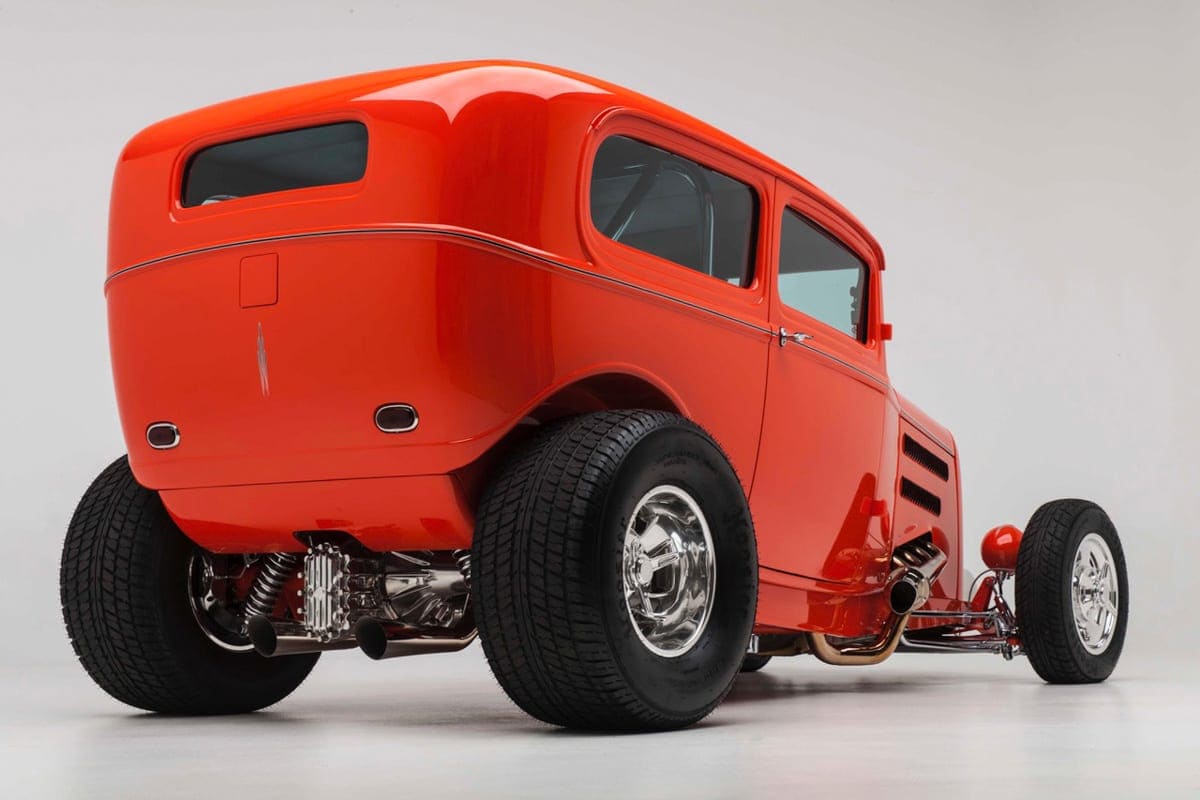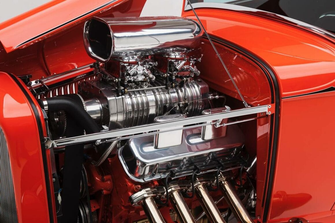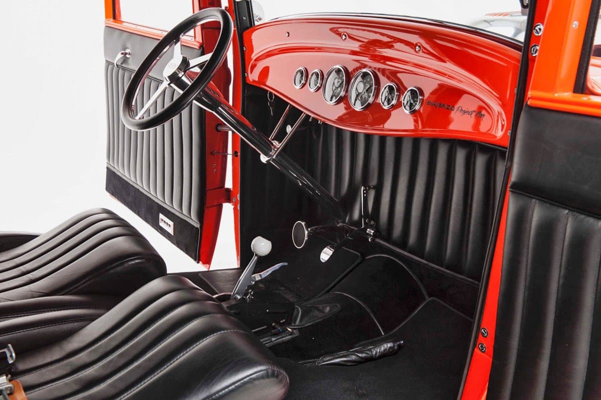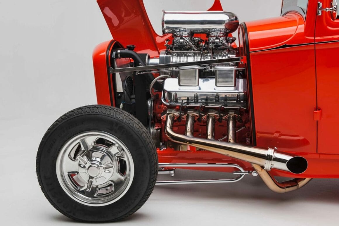 Elle a été coupée de 2,5 pouces, équipée d’un pare-feu personnalisé Brizio, et d’un évent de capot en acier. Les passages de roue arrière modifiés et remodelés accueillent des pneus massifs et les ailes avant ont simplement été retirées. Tout le travail du métal a été effectué par “Custom Metal Shaping” à Corona, en Californie, bien connu dans la communauté comme l’un des ateliers prééminents de l’industrie du Hot-Rodding.