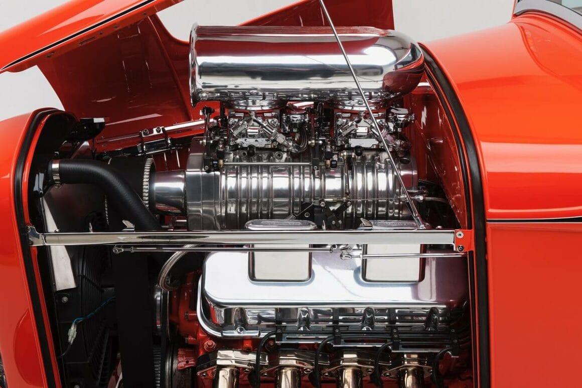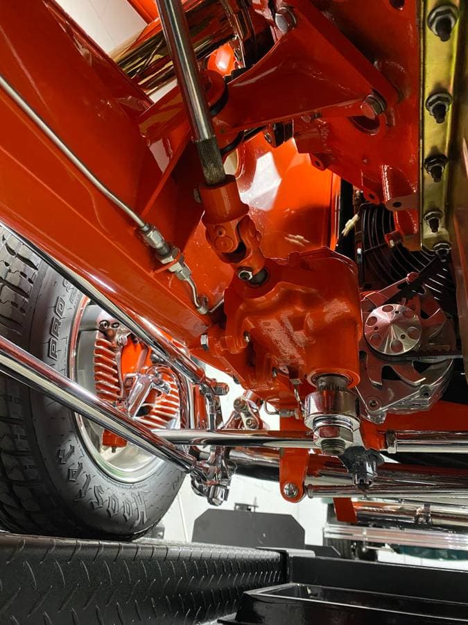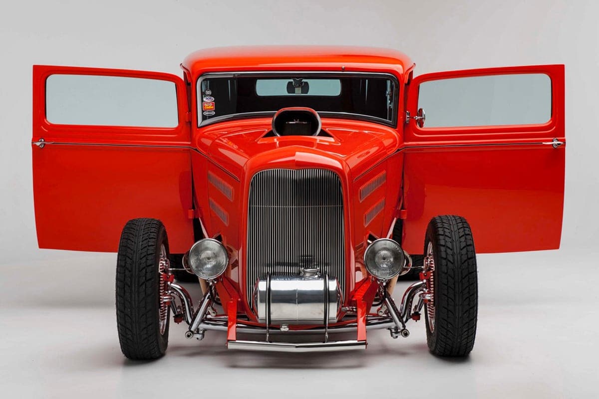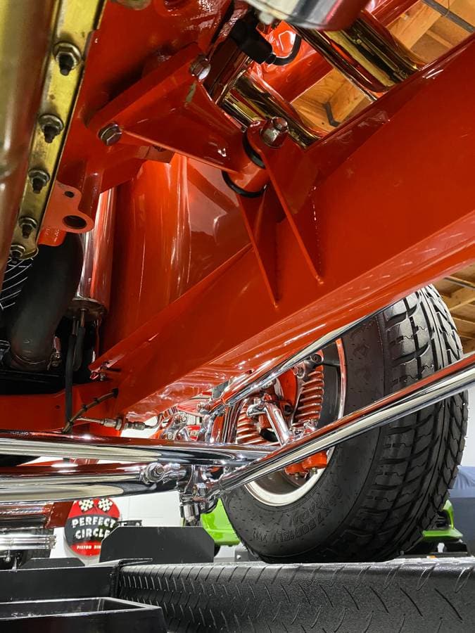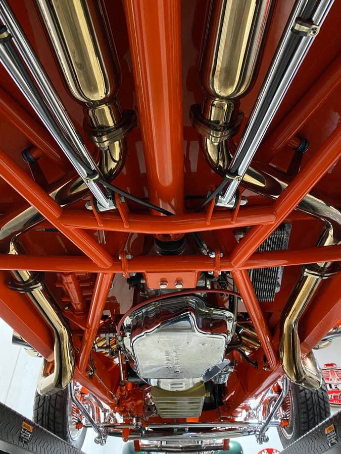 Des collecteurs en acier inoxydable fabriqués sur mesure, une transmission B&M Turbo 400 sur mesure avec refroidisseur et convertisseur de couple B&M Hole-Shot, et toute une batterie de composants de Milodon, Holley, MSD, Taylor et Griffin s’ajoutent au bestiau… Waouwwww ! Bien entendu, la transmission est contrôlée par un levier de vitesses à cliquet B&M Pro. Voilà, il est temps d’en venir à à la carrosserie originale de la Ford 2 portes de 1932…