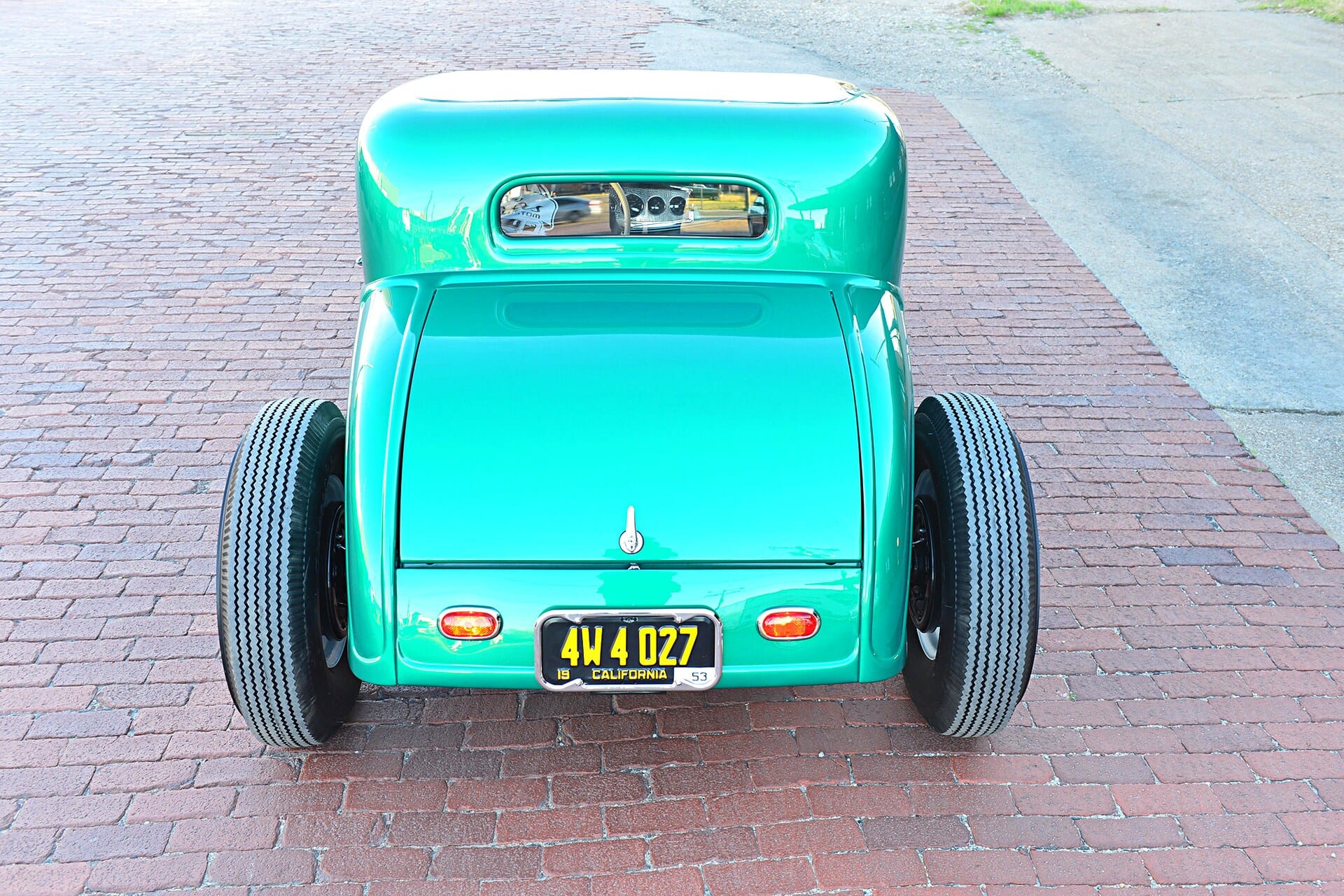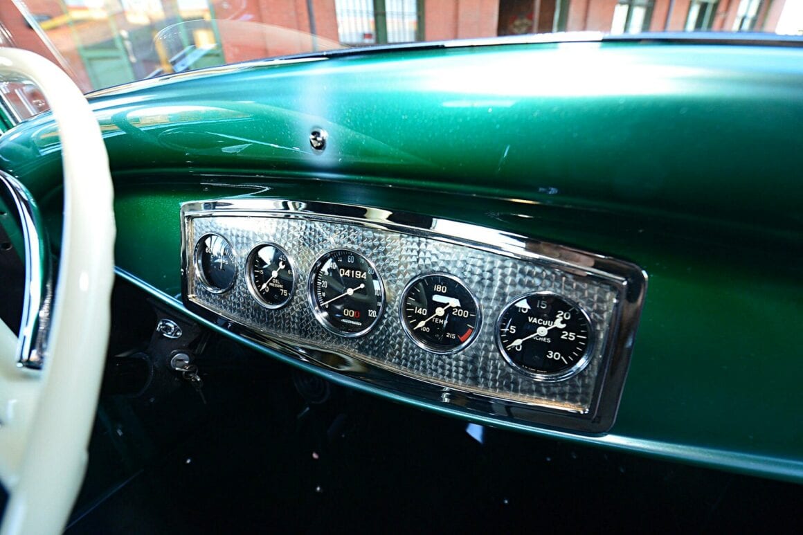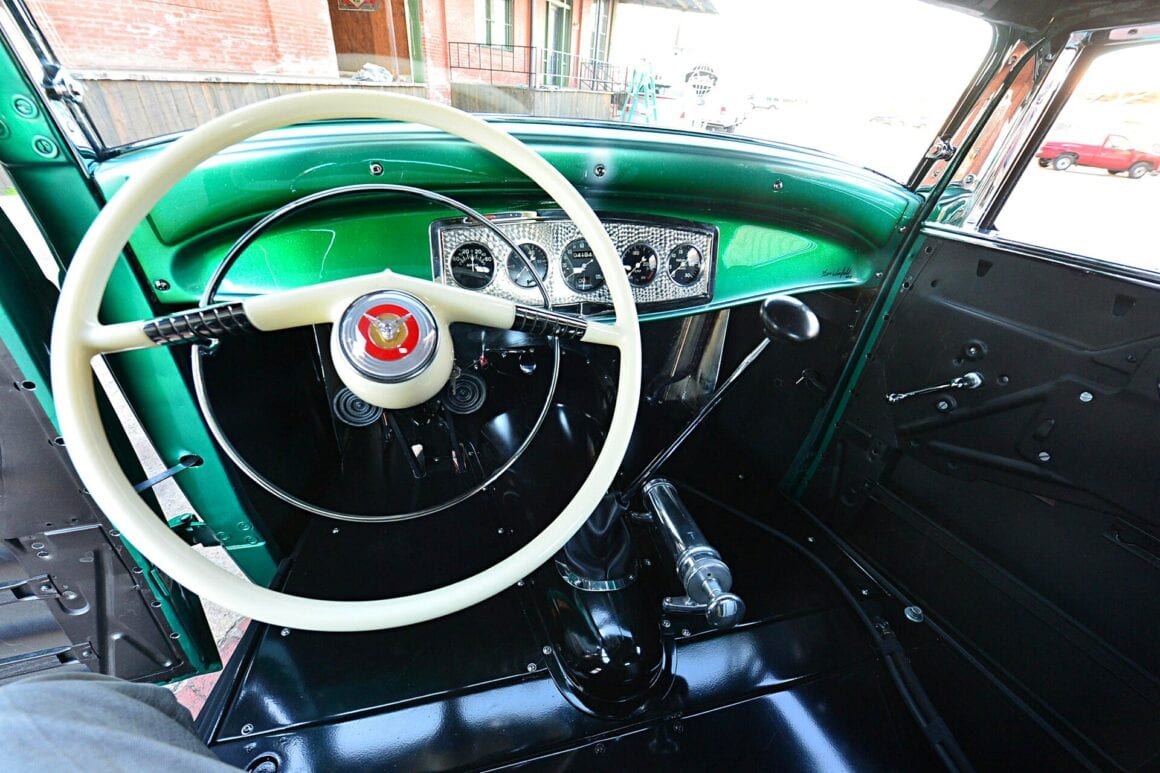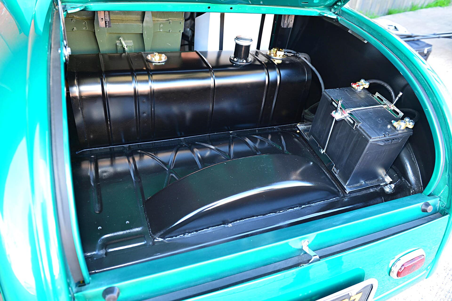 La jante accessoire Mercury de 1951 avait disparu depuis longtemps, mais Arnette a chassé et acheté un N.O.S. Les compteurs sont des Stewart-Warner en verre incurvé vintage des années 1940 ajustés dans un panneau Stewart-Warner de la fin des années 1940. Thompson a utilisé un levier de vitesses Ford 39. À droite du levier de vitesses se trouve une pompe à carburant manuelle Moon. Avant que Thompson n’obtienne ce ’32 en 1947, quelqu’un a fabriqué un « trois fenêtres du pauvre » à partir d’un coupé à cinq fenêtres en recouvrant les vitres de custode avec de la tôle, puis en les introduisant. Thompson a choisi le côté passager du coffre pour localiser une batterie de 12 volts. Pour des raisons de sécurité, Arnette a opté pour un réservoir d’essence moderne.