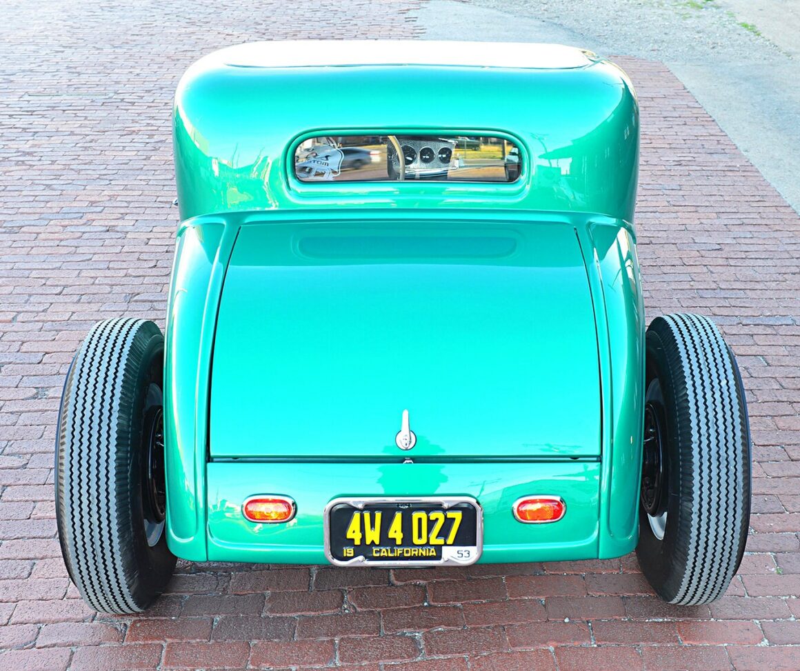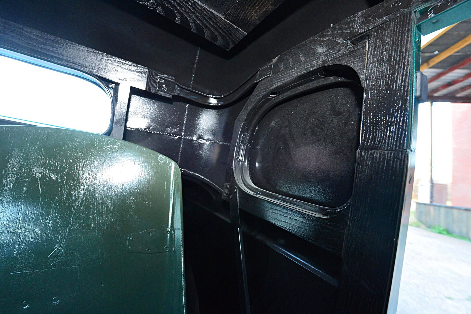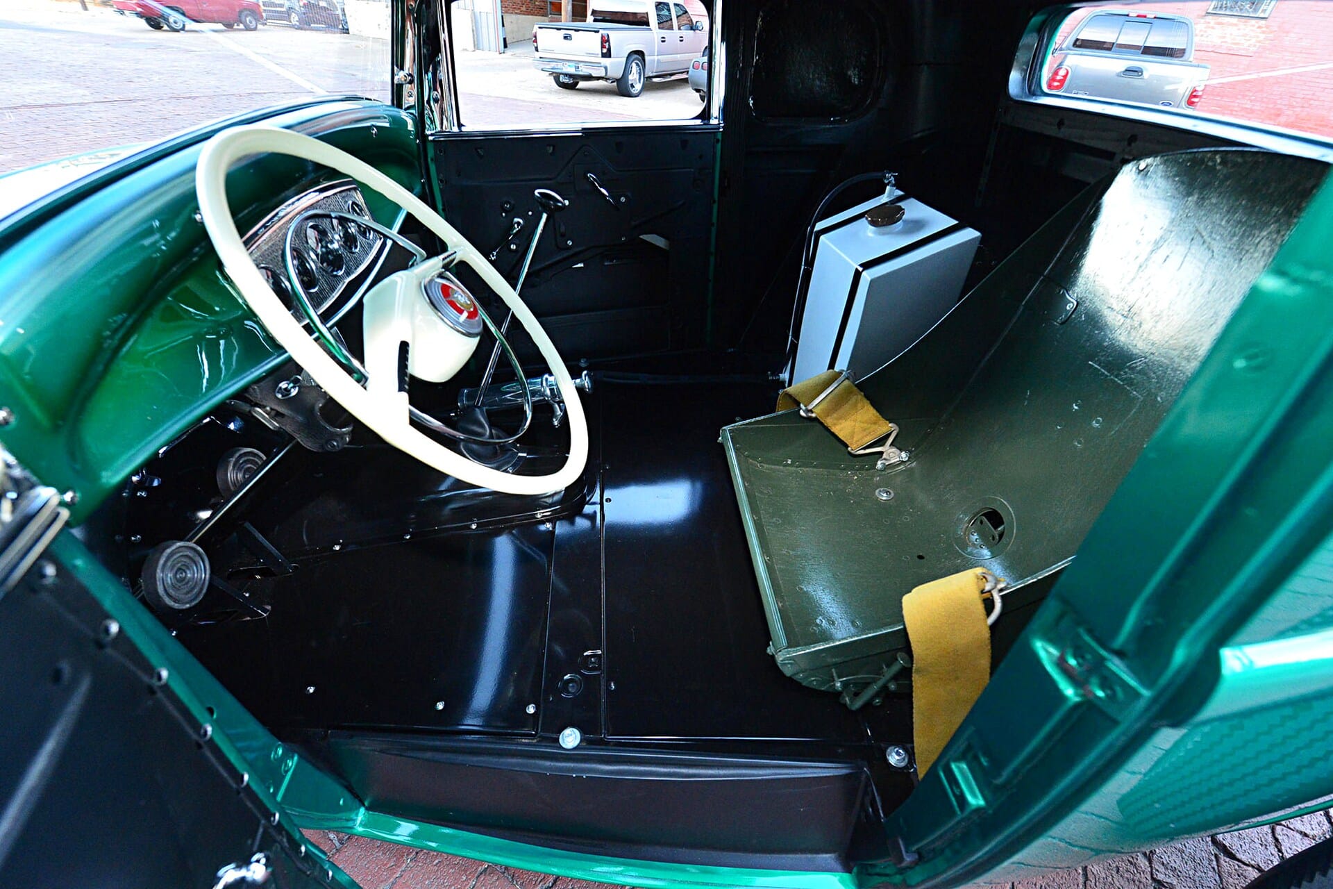 La jante accessoire Mercury de 1951 avait disparu depuis longtemps, mais Arnette a chassé et acheté un N.O.S. Les compteurs sont des Stewart-Warner en verre incurvé vintage des années 1940 ajustés dans un panneau Stewart-Warner de la fin des années 1940. Thompson a utilisé un levier de vitesses Ford 39. À droite du levier de vitesses se trouve une pompe à carburant manuelle Moon. Avant que Thompson n’obtienne ce ’32 en 1947, quelqu’un a fabriqué un « trois fenêtres du pauvre » à partir d’un coupé à cinq fenêtres en recouvrant les vitres de custode avec de la tôle, puis en les introduisant. Thompson a choisi le côté passager du coffre pour localiser une batterie de 12 volts. Pour des raisons de sécurité, Arnette a opté pour un réservoir d’essence moderne.