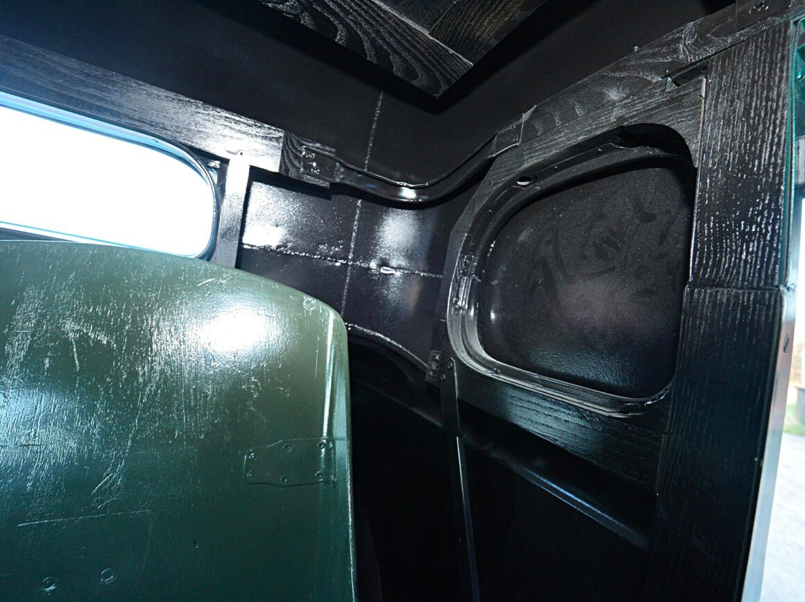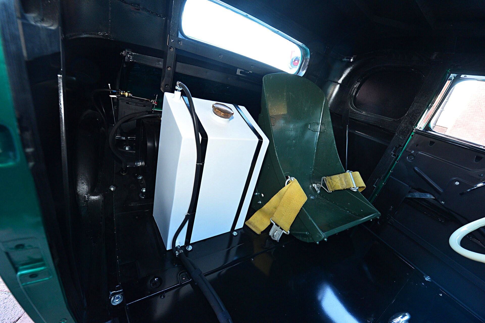 Le siège Stearman était une autre caractéristique originale qui a permis de retracer l’héritage de cette voiture jusqu’à Lew Thompson. Pour une utilisation en course, le réservoir de gaz se trouvait à la place d’un passager. Thompson et son ami Jere Woodhead ont remplacé le plancher métallique par des planches de bois, auxquelles ils ont fixé le siège de l’avion. Arnette imagine, avec crainte et émerveillement, un adolescent dévalant le quart de mile dans ce siège de 32 boulonné à des planches de bois. Au cours de la restauration, Arnette a choisi des planchers en métal pour la sécurité et la maniabilité, et a remplacé les pédales rudimentaires (qu’il a conservées) que Thompson avait coupées en deux pour s’adapter à la petite zone et se plier dans différentes directions.