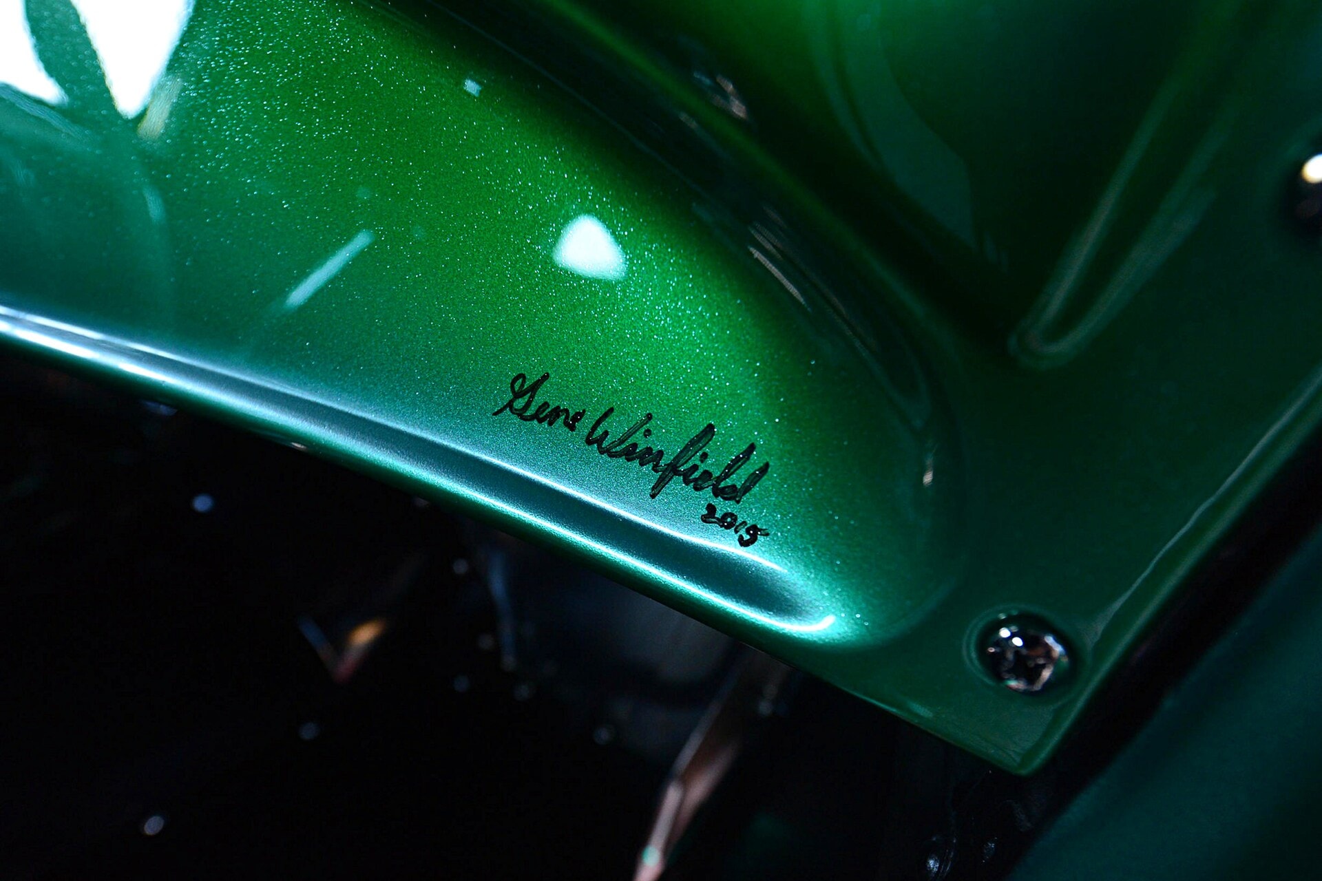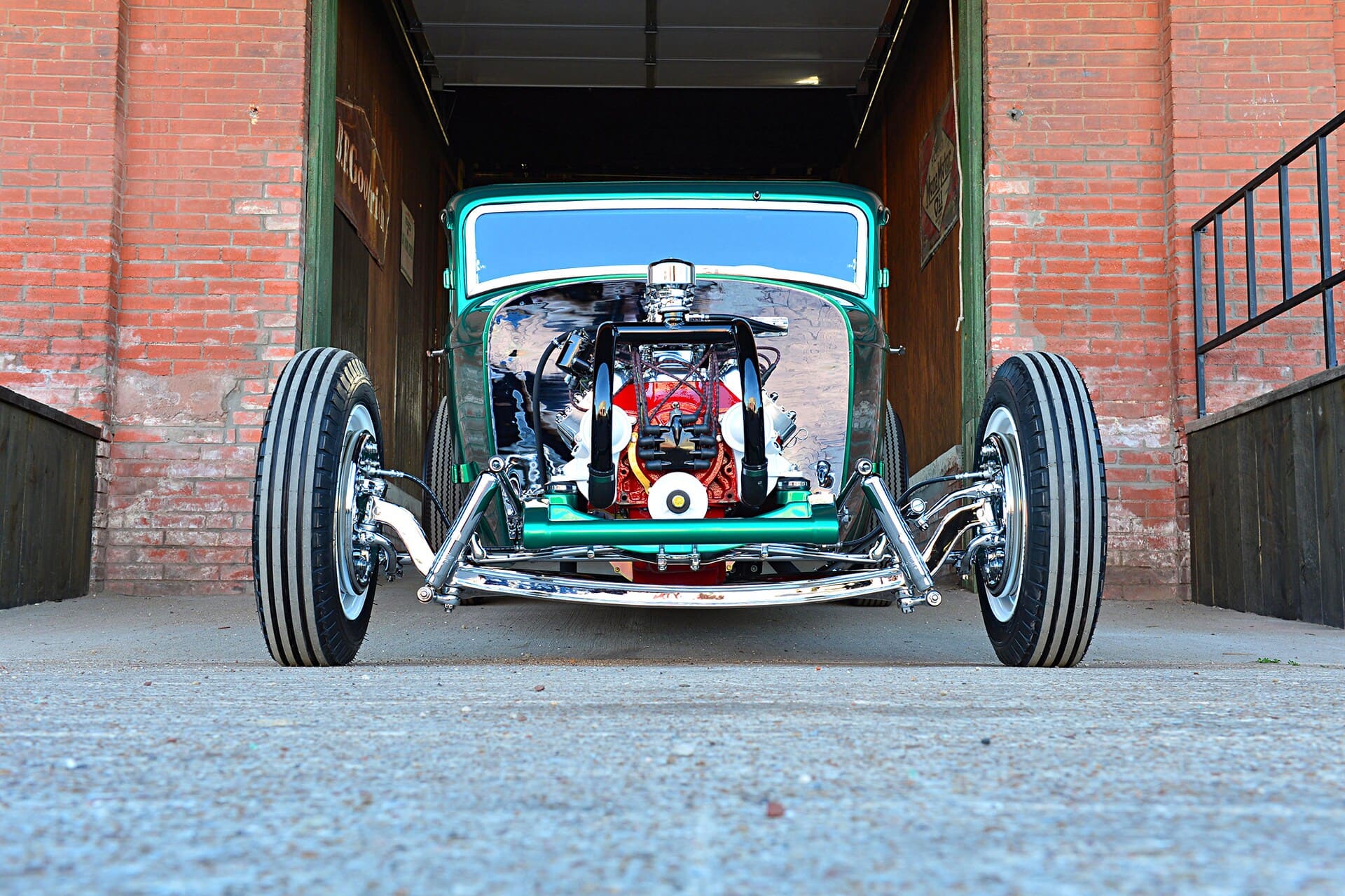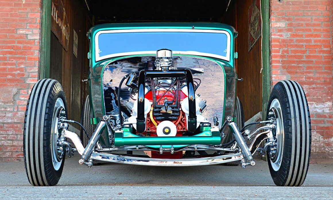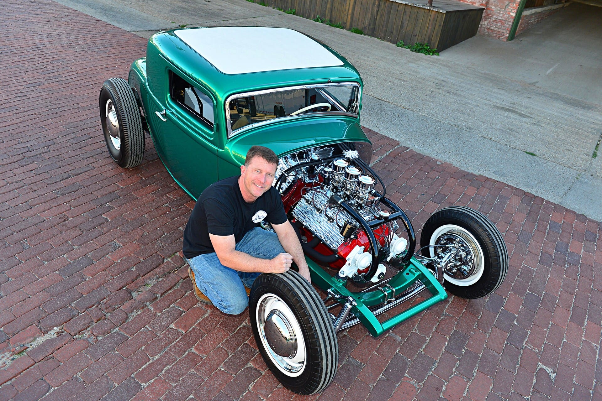 Lew Thompson a signé et donné à Eric Arnette le pistolet à peinture Binks, qu’il a utilisé pour peindre son ’32 en 1952. Incroyablement, Thompson n’avait pas utilisé le pistolet à peinture depuis ce travail de pulvérisation, et la peinture verte séchée est restée dans le pistolet. Arnette a conservé l’aspect original de la restauration, y compris le clapot de 3 pouces et le canal de 7 pouces du coupé. “Nous avons fait reproduire un radiateur tout comme Lew, donc en mettant le radiateur et les tuyaux, le ’32 peut être rendu utilisable dans la rue”. Ce qui sépare cette ’32 des versions actuelles, c’est l’histoire. Ce vieux Hot Rod était la construction de rêve d’un lycéen à la fin des années 1940, a vu des courses de nuit sur des routes secondaires du centre de la Californie et était un dragsters du week-end à Kingdon Dragstrip près de Lodi. Trouver et restaurer ce ’32 à ses racines vintage a été une expérience incroyable, a déclaré Eric…