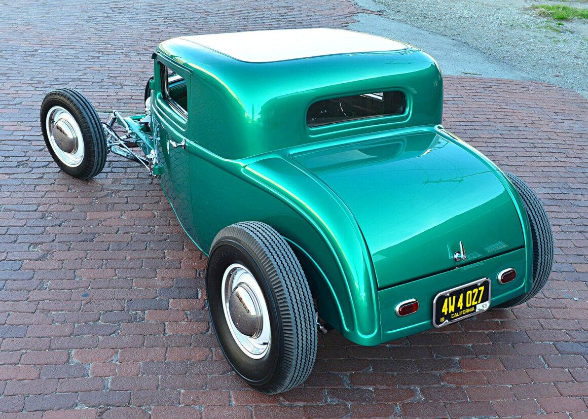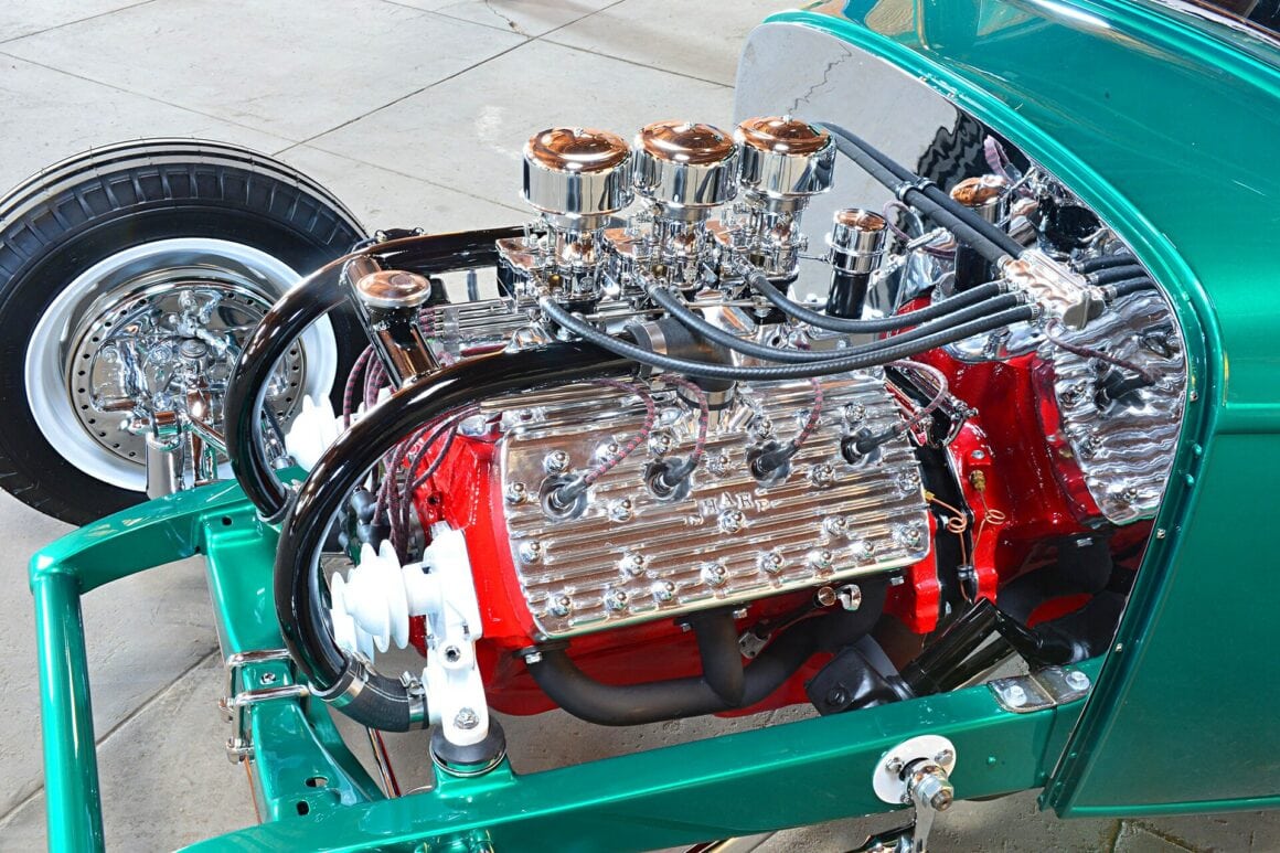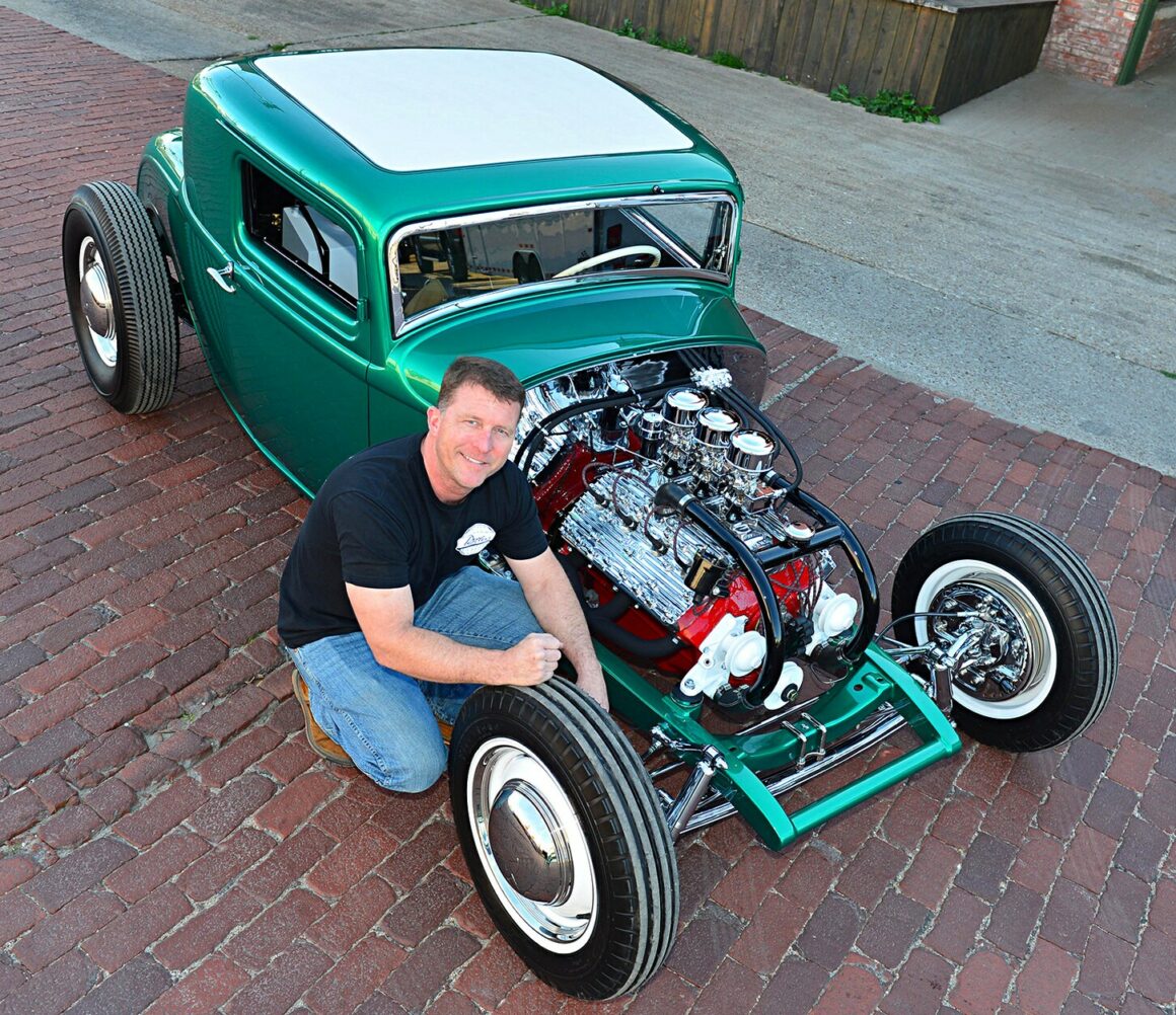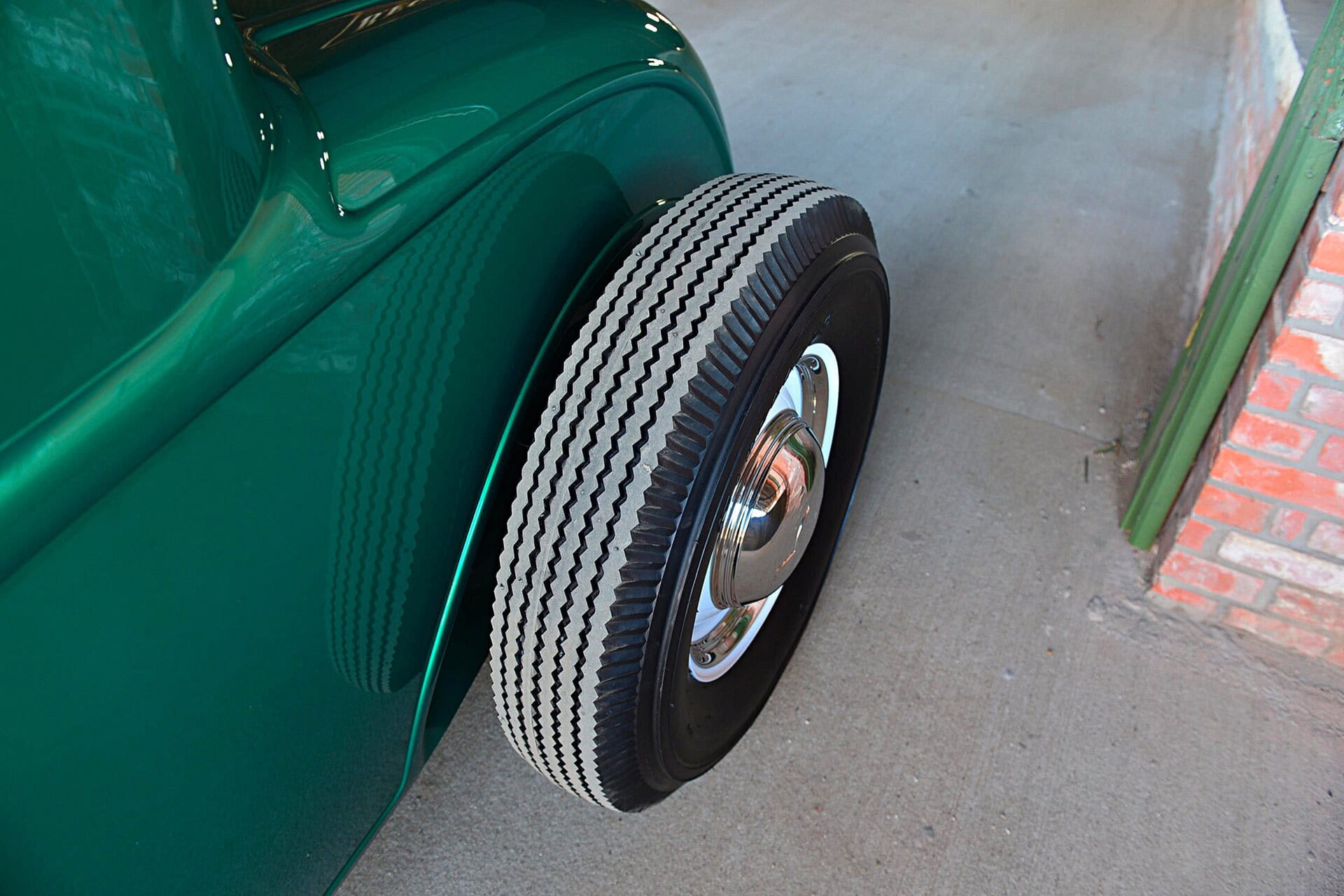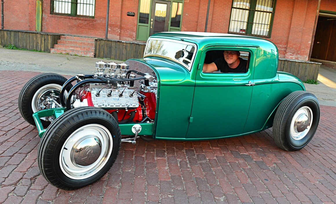 Lew Thompson a signé et donné à Eric Arnette le pistolet à peinture Binks, qu’il a utilisé pour peindre son ’32 en 1952. Incroyablement, Thompson n’avait pas utilisé le pistolet à peinture depuis ce travail de pulvérisation, et la peinture verte séchée est restée dans le pistolet. Arnette a conservé l’aspect original de la restauration, y compris le clapot de 3 pouces et le canal de 7 pouces du coupé. “Nous avons fait reproduire un radiateur tout comme Lew, donc en mettant le radiateur et les tuyaux, le ’32 peut être rendu utilisable dans la rue”. Ce qui sépare cette ’32 des versions actuelles, c’est l’histoire. Ce vieux Hot Rod était la construction de rêve d’un lycéen à la fin des années 1940, a vu des courses de nuit sur des routes secondaires du centre de la Californie et était un dragsters du week-end à Kingdon Dragstrip près de Lodi. Trouver et restaurer ce ’32 à ses racines vintage a été une expérience incroyable, a déclaré Eric…
