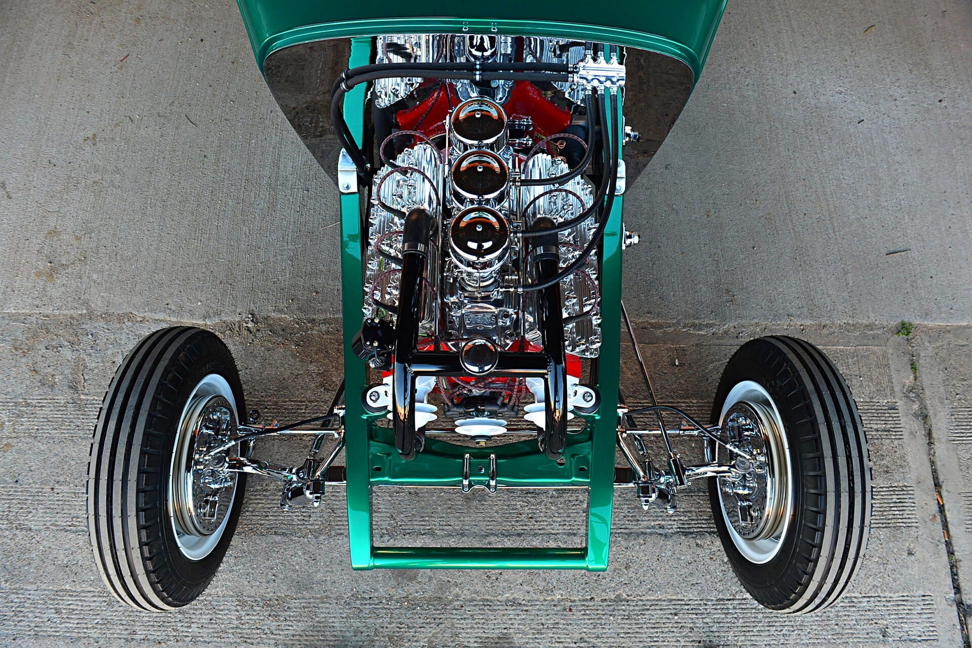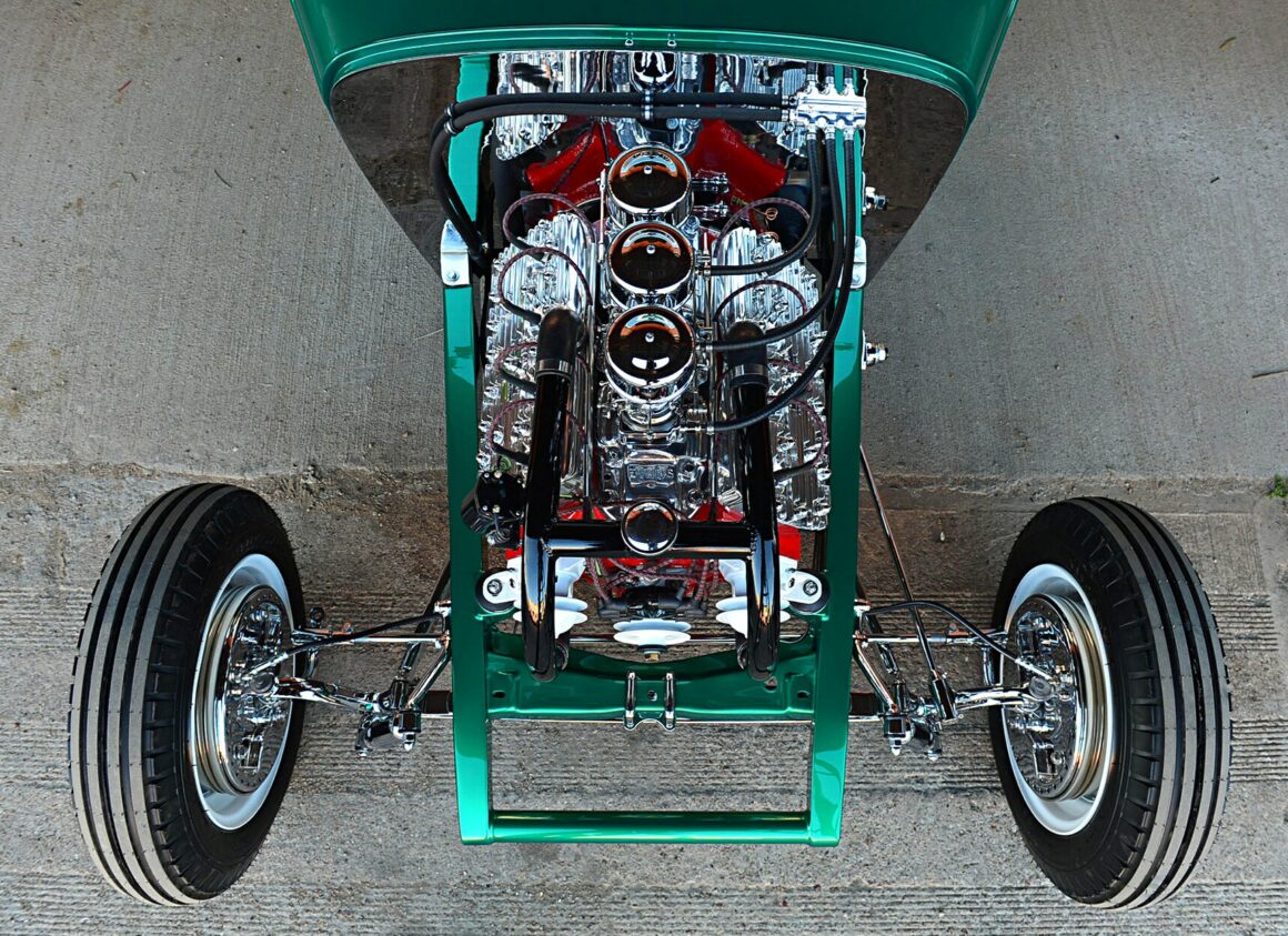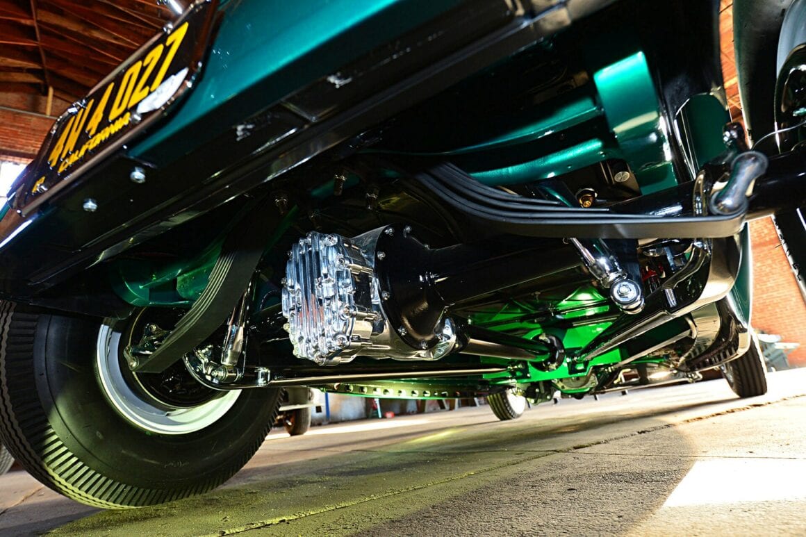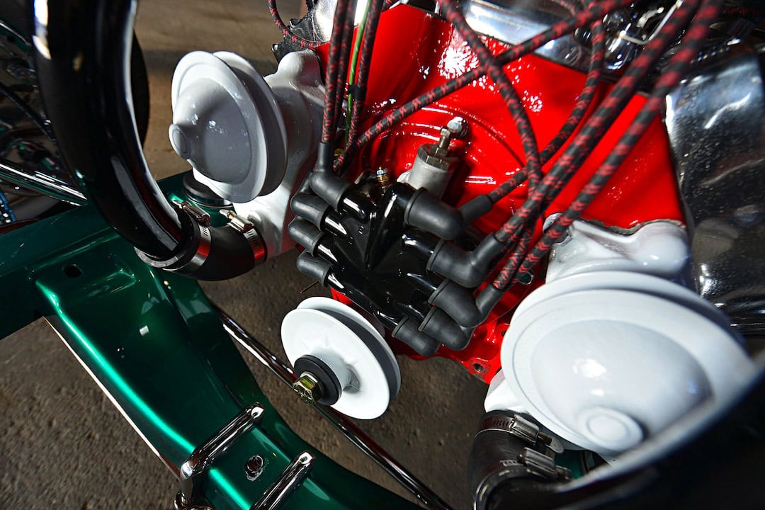 Des tubes de transfert noirs faisaient circuler l’eau d’une tête à l’autre, afin d’économiser le poids d’un radiateur pour les courses d’un quart de mile. Gene Winfield a fabriqué ces mêmes tubes dans les années 1940. Après avoir peint la voiture, Winfield a dit qu’il avait les tubes originaux accrochés au mur de son magasin. Deux semaines après que la voiture ait été peinte, “une grande boîte de Gene est arrivée”, a déclaré Arnette, et dedans il y avait ces tubes, de 1953. Gene les avait gardés toutes ces années. Thompson avait retiré les freins avant pour économiser du poids pour la course, mais pour des raisons de sécurité, Arnette a réinstallé des freins hydrauliques Ford 1940 avec des tambours Lincoln chromés et des plaques d’appui chromées percées de trous d’allègement.