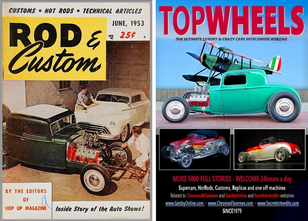 “Alors que je partais Clem m’a dit que je devais aller voir le H.A.M.B. si quelqu’un avait des informations”… Quelques jours plus tard, Eric Arnette a reçu une réponse sur le H.A.M.B. de la part d’un nommé Neil Jennings, un constructeur de Hot Rods d’Atascadero, en Californie. Jennings pensait que le ’32 ressemblait exactement à la voiture de couverture du premier numéro du mag”Rod & Custom” de 1953, qui auparavant se nommait Hot Up… Eric Arnette a trouvé une photo de la couverture du magazine en ligne. Il a été immédiatement frappé par les similitudes avec la voiture qu’il venait d’acheter. Les deux voitures étaient des coupés 5 fenêtres, les vitres de custode étant remplies pour donner l’apparence d’un coupé à trois fenêtres, ce qui n’était pas une pratique répandue.