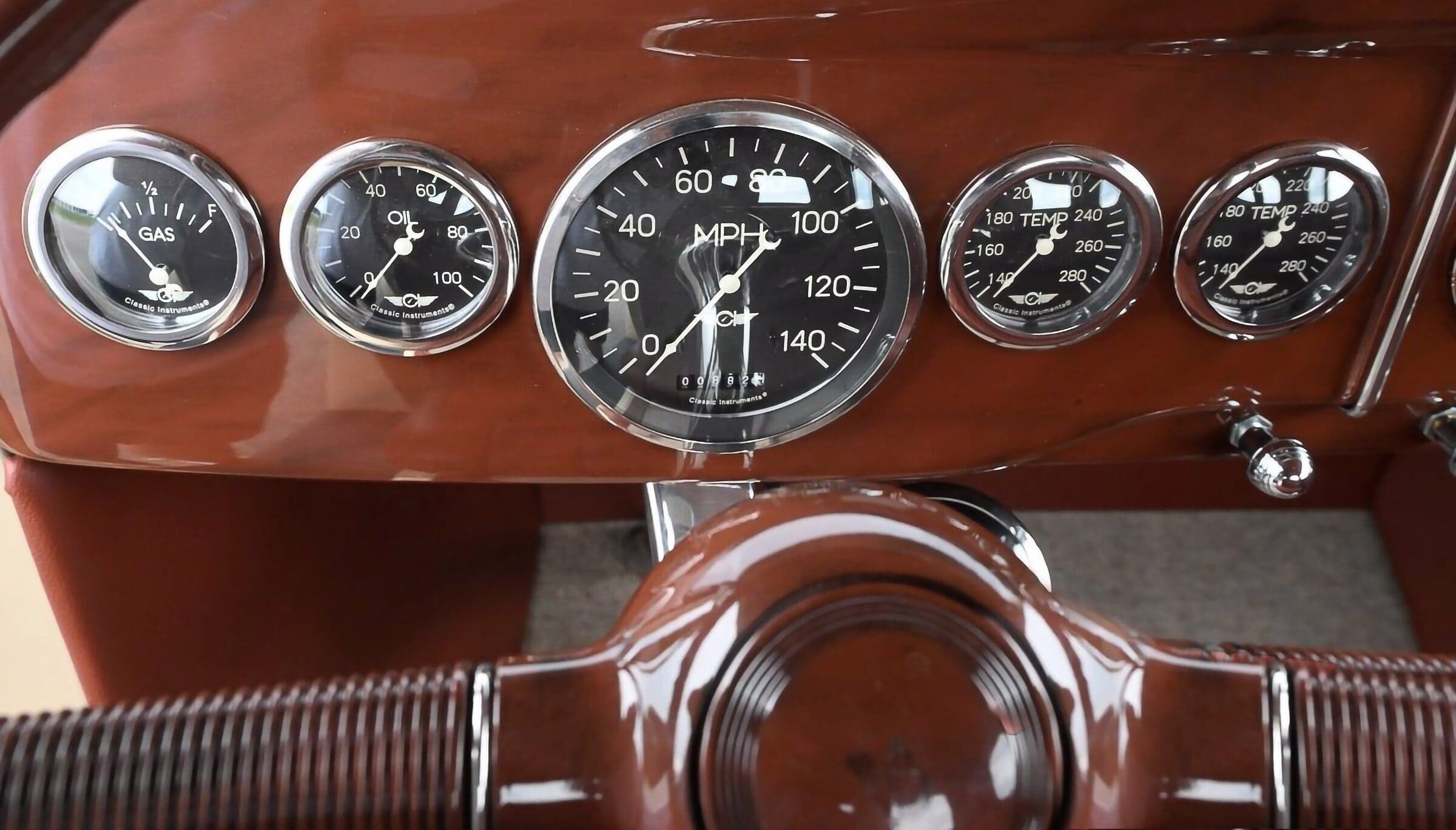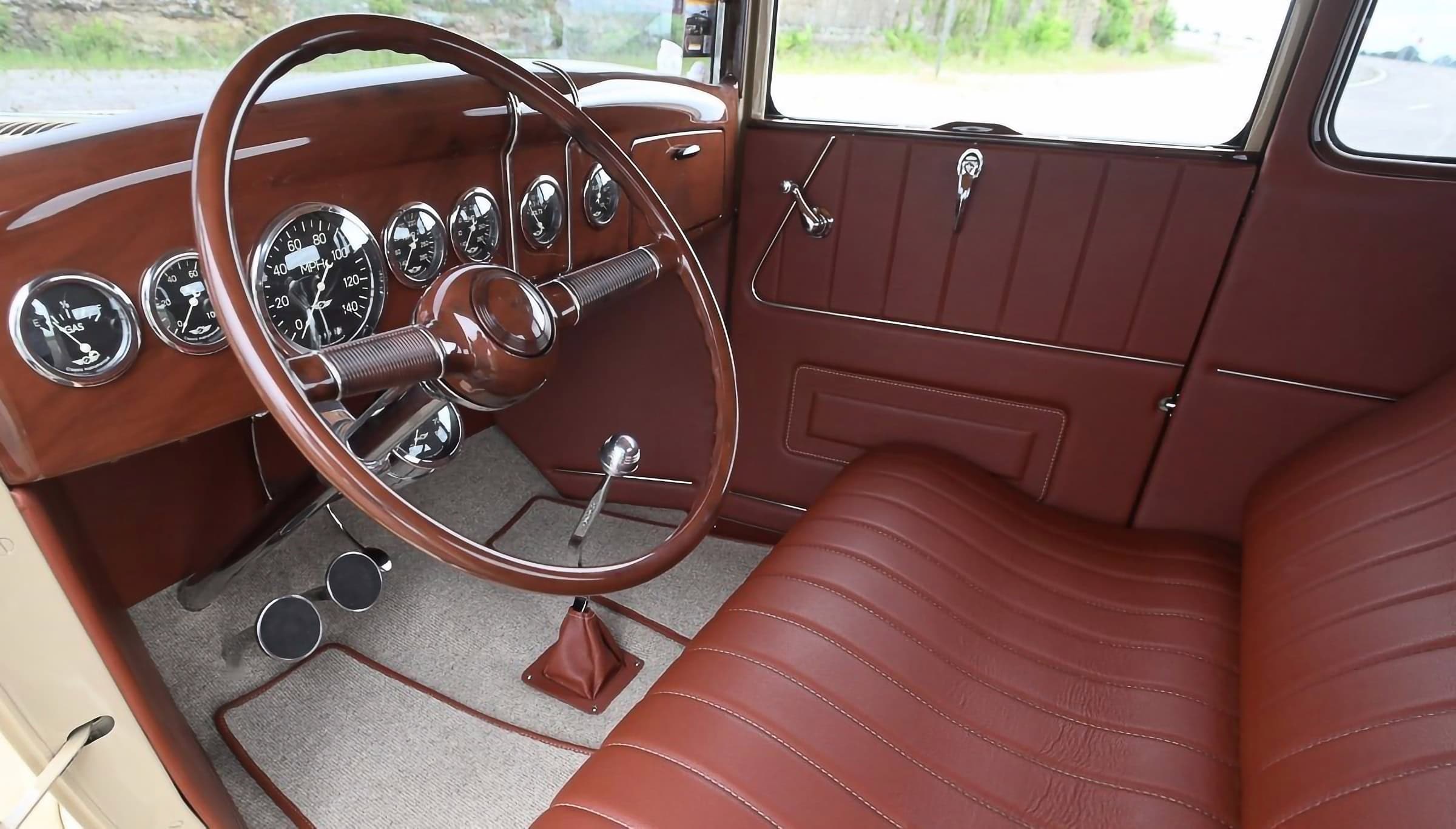 La peinture beige PPG mélangée sur mesure a été appliquée en interne chez Adams Hot Rod Shop. Comme la peinture, le rembourrage a été fait en interne chez le même garage Adams Hot Rod Shop. Il se compose de cuir marron cousu sur une banquette et de panneaux de portes et latéraux personnalisés, ainsi que d’une moquette à tissage carré coordonnée. Le tableau de bord Ford’36 est rempli d’instruments classiques et équipé d’une colonne Limeworks et d’un volant de style ’40. Bien sûr, la construction a peut-être pris plus de temps que prévu (gag !), mais le résultat parle de lui-même et sera quelque chose dont Pete et Nick pourront profiter pendant des décennies supplémentaires au 16 années déjà passées…