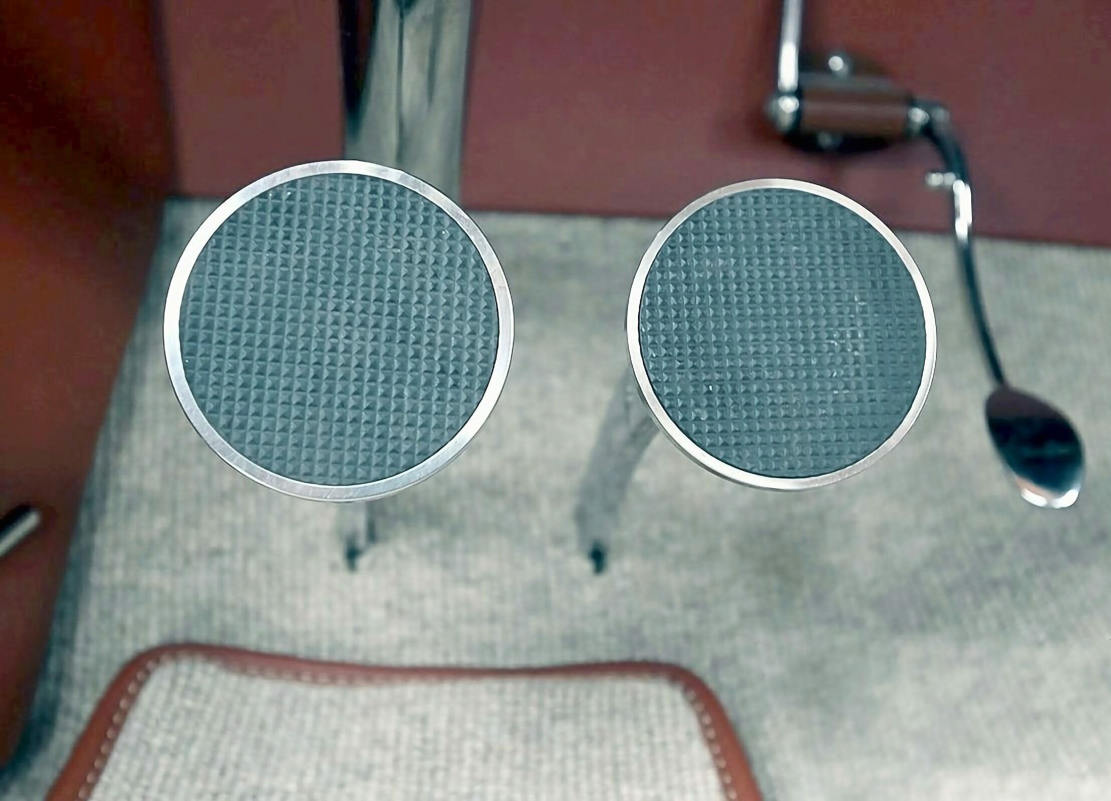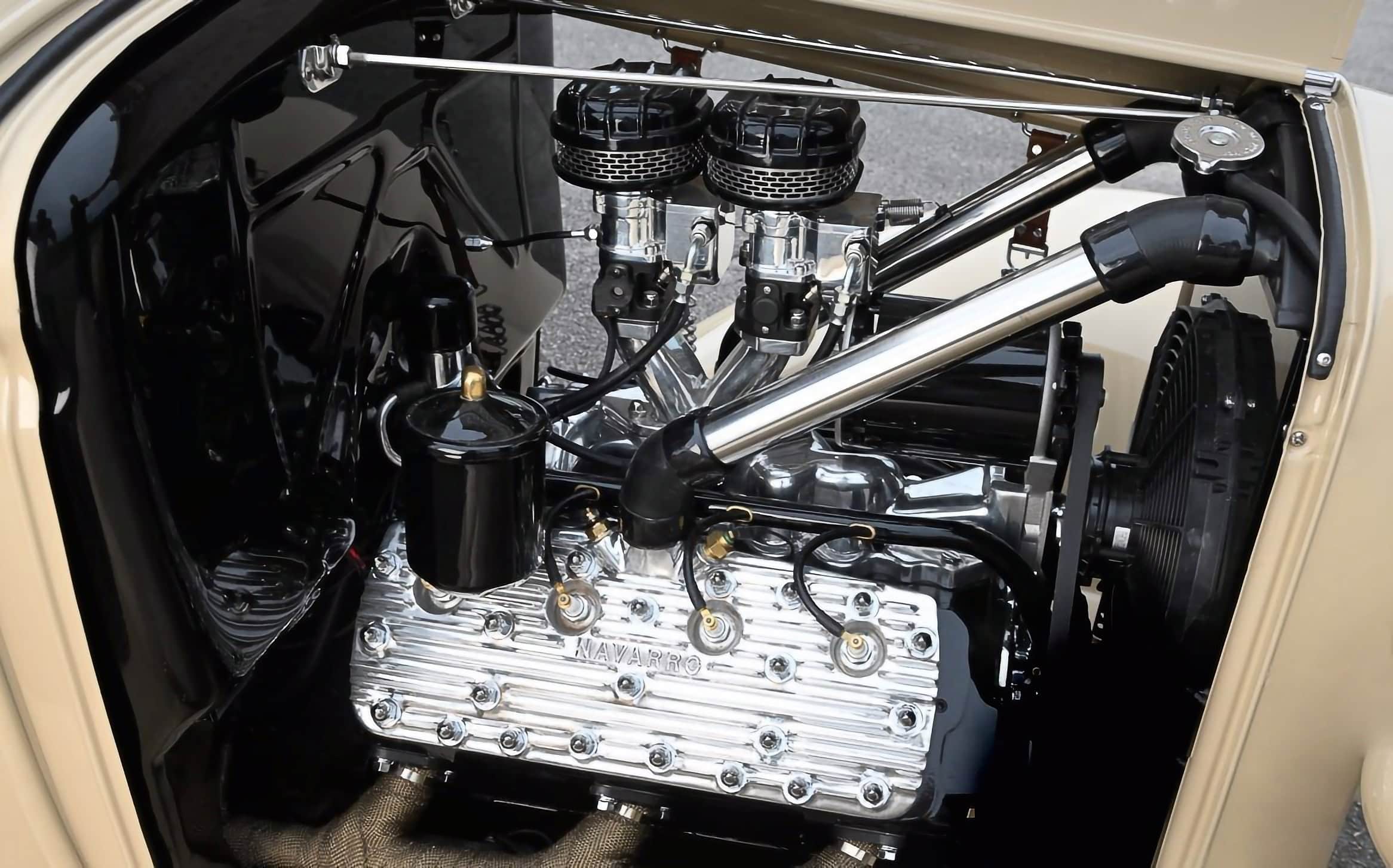 Ils fournissent un râteau “en caoutchouc”. Le Flathead de 274ci a été re construit par Tony Price à l’aide d’un bloc Ford français, d’un vilebrequin et de tiges Scat Stroker de 4 pouces ainsi que d’un arbre à cames Schneider avec soupapes Chevy et ressorts Isky. Il est surmonté de têtes Navarro polies, tandis qu’un collecteur Edelbrock Slingshot prend en charge deux unités Autotrend EFI coiffées de purificateurs d’air Nystrom. Une gâchette personnalisée et un distributeur “de crabe modifié” (sic !) allument l’étincelle, tandis que les en-têtes Red se connectent à un échappement personnalisé. La puissance est transmise par une boite T5 (cinq vitesses décalées par Hurst). Il y a plus de “mods métalliques” sur la carrosserie que vous ne le remarquez au départ…