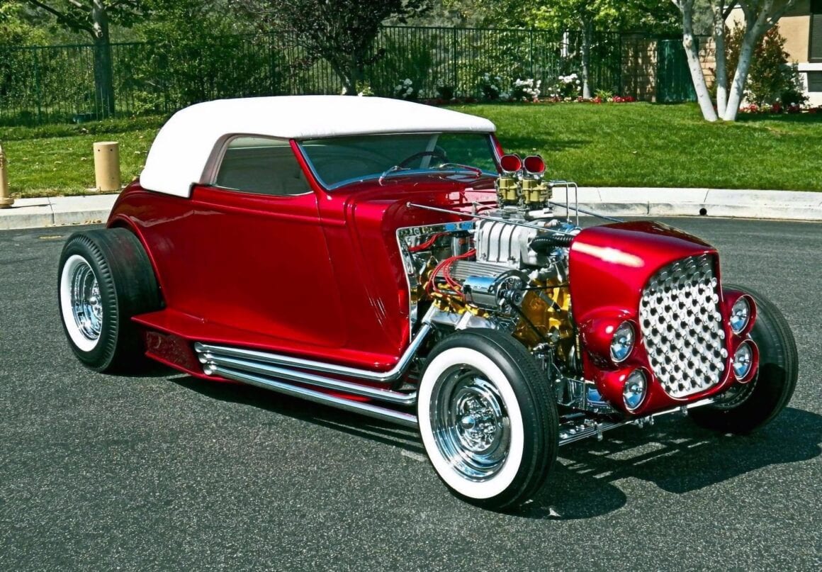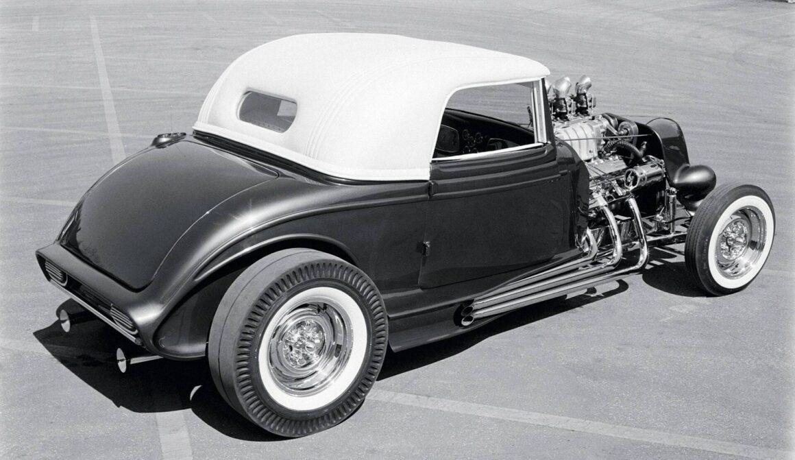 De plus, ils l’ont construite comme un Hot Rod frère du coupé DeLuxe 1932 de Clarence “Chili” Catallo, celui rendu célèbre par son apparition sur un album des Beach Boys… Il vient d’être restauré/reconstruit et apparait renommé “l’Hybris”… Un article vient de lui être consacré sur un article voisin… Dire qu’ils étaient amis ne fait qu’effleurer la surface : “Clarence et moi sommes allés à l’école ensemble quand nous avions 10 ans”, commente Don : “J’étais porteur de son cercueil quand il est mort”.… Don m’a raconté l’histoire de deux enfants aussi épais que des voleurs qui jouaient ensemble aussi intensément qu’ils s’affrontaient. Selon Don, tout était un jeu équitable : le sport, les filles… alors qu’ils approchaient de l’âge de conduire des voitures… ‘J’ai eu cette Ford 1934 vers 1955″, se souvient Don. Bien qu’il l’ait décrit comme strictement une carrosserie sur un châssis, celle-ci avait été profondément “canalisée”… Un récit revendique 8 pouces… Il a terminé ce cabriolet au nez de deux bleus, a festonné les côtés et l’a montré/utilisé de cette façon jusqu’à ce que “Chili” Catallo fasse monter les enchères en réalisant son coupé pour la première partie de sa légendaire métamorphose…