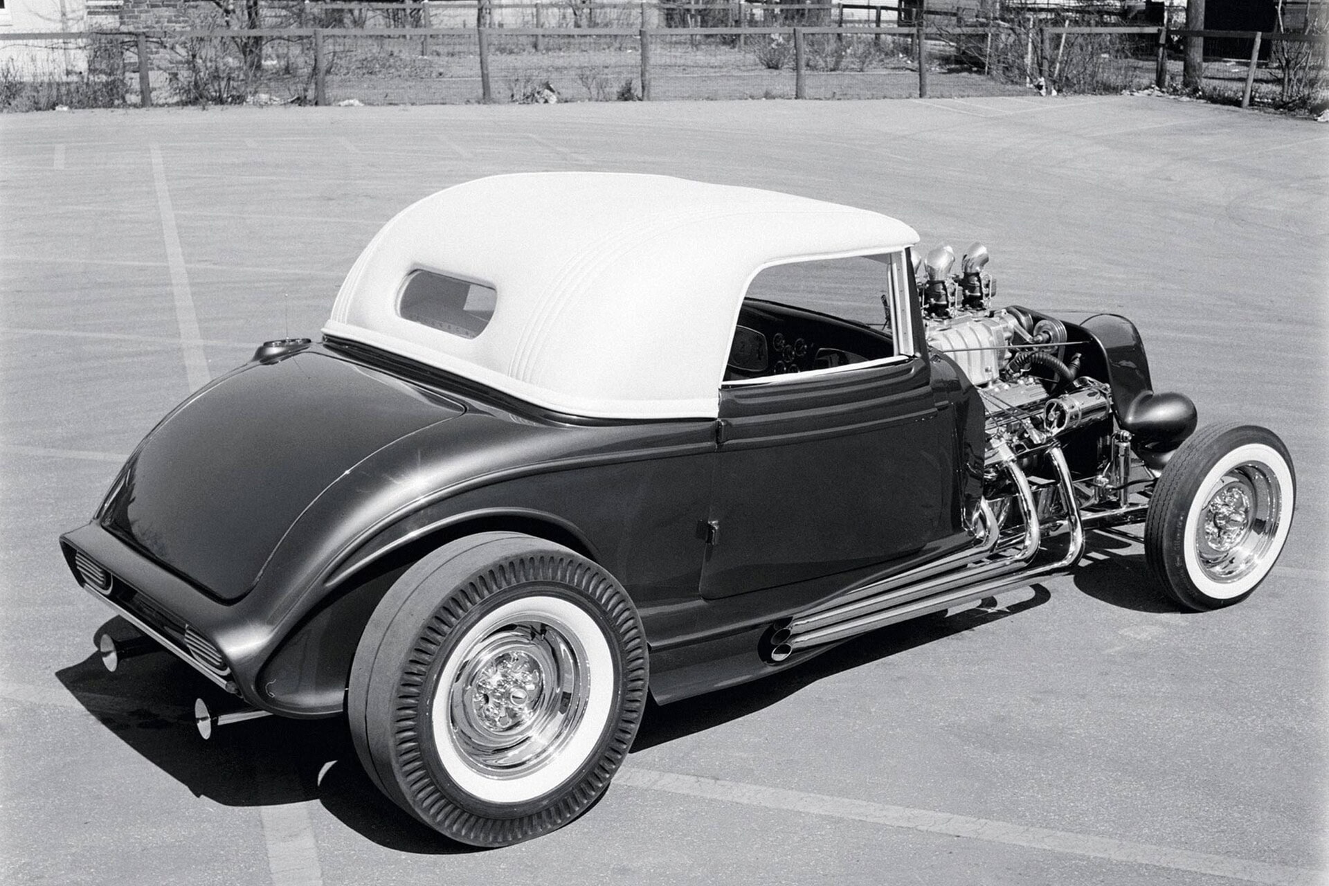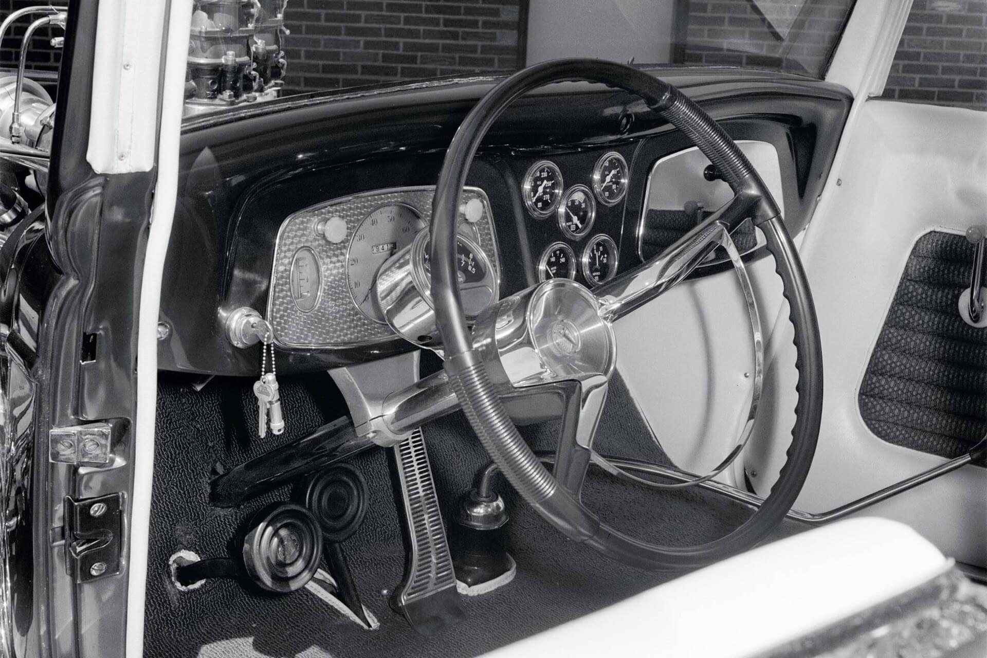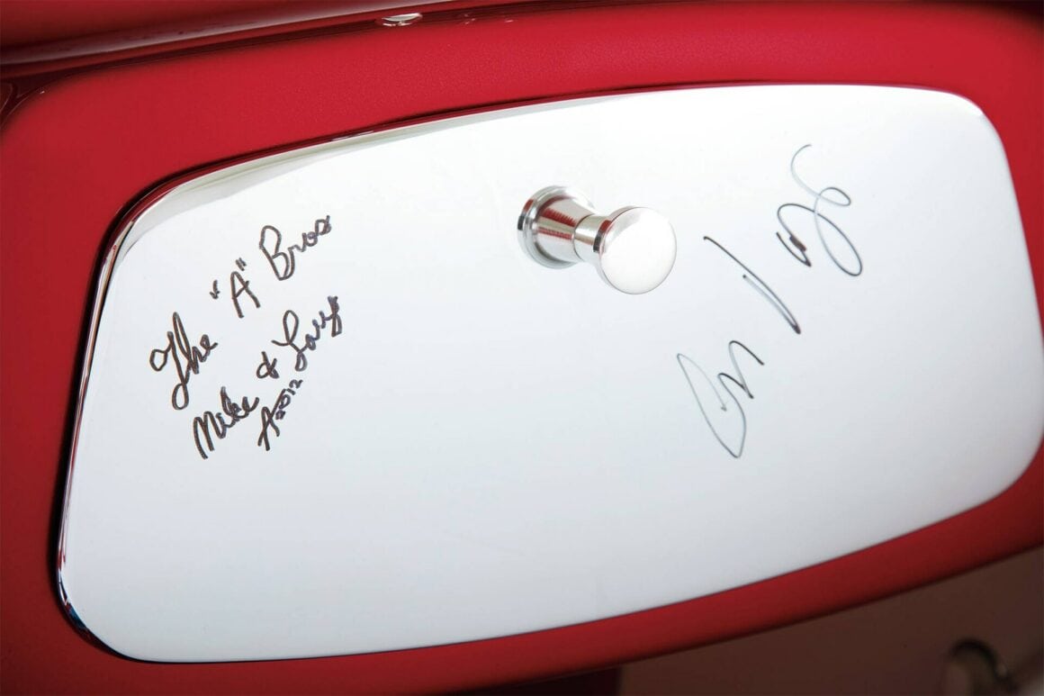 Au lieu de cela, ils ont découpé une carrosserie Speed33 d’American Speed Company, celle dont le dessus se replie sous un panneau tulipe rabattable. Incidemment, alors qu’il travaillait chez American Specialty Cars, Mike Alexander a été le pionnier de conceptions haut de gamme similaires pour le marché OEM. Charlie Martinez de Blast from the Past a soulevé les planchers avant pour canaliser légèrement la voiture, mais a laissé tomber le plancher immédiatement sous les sièges des Wise Guys. Pour dégager le cadre en gradins, la partie arrière du sol devait remonter de 7 à 8 pouces et a été recréé le recul de la cloison pare-feu et a été remplacé le tableau de bord de style 1933 par un de style 1934 produits par Steve’s Auto Restorations. Il a également utilisé un volant Pontiac 1959 sur une colonne de direction ididit Inc. Martinez a recréé les criques latérales à l’image de celles de la voiture de Don. Le couvercle et les feux arrière de la Pontiac Catalina de 1959 distinguaient également la voiture de Don. “Cela venait de Desert Valley Auto Parts en Arizona”, dit Borneman. Naturellement, ce panel n’est pas tombé tout de suite.