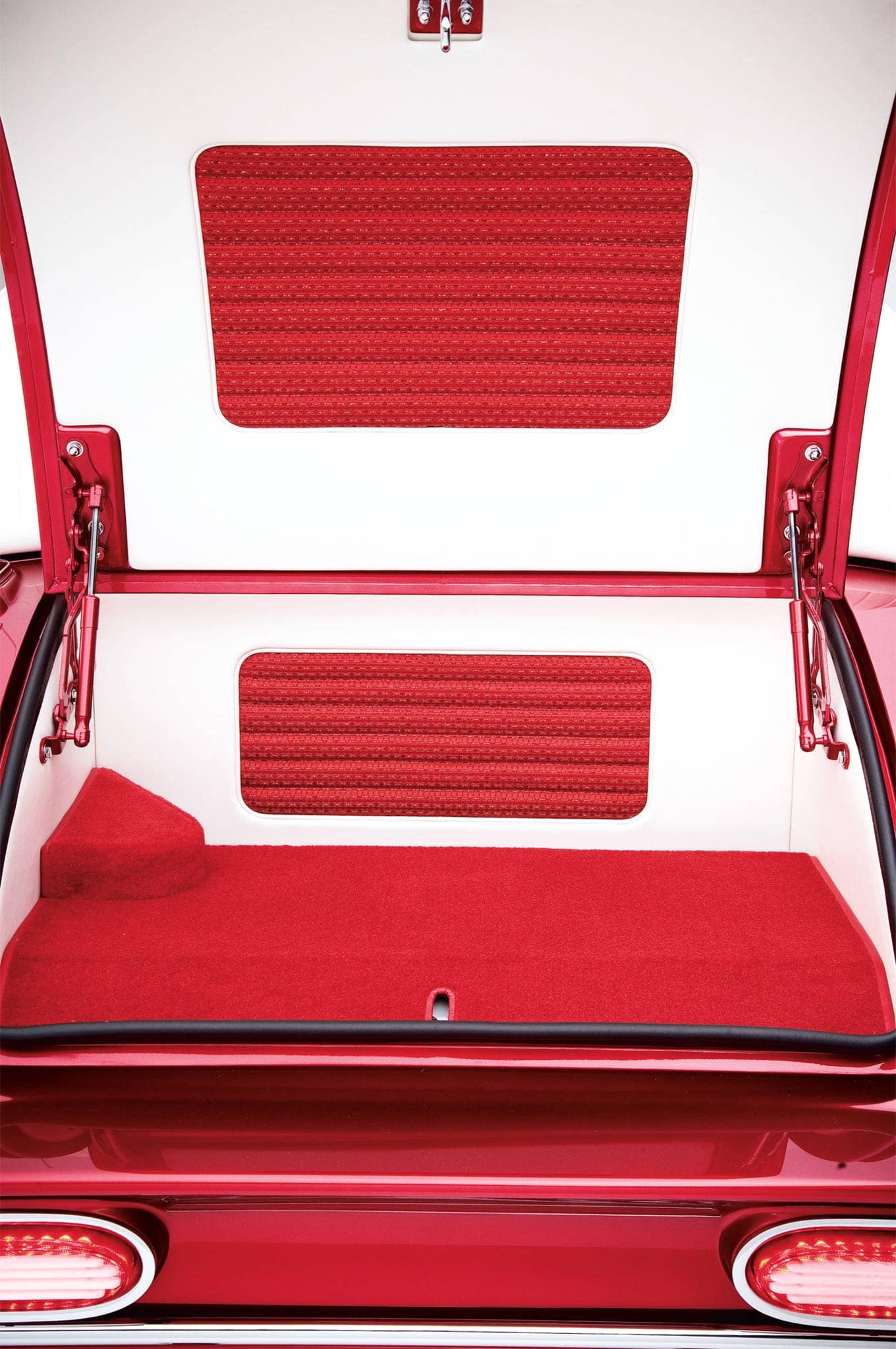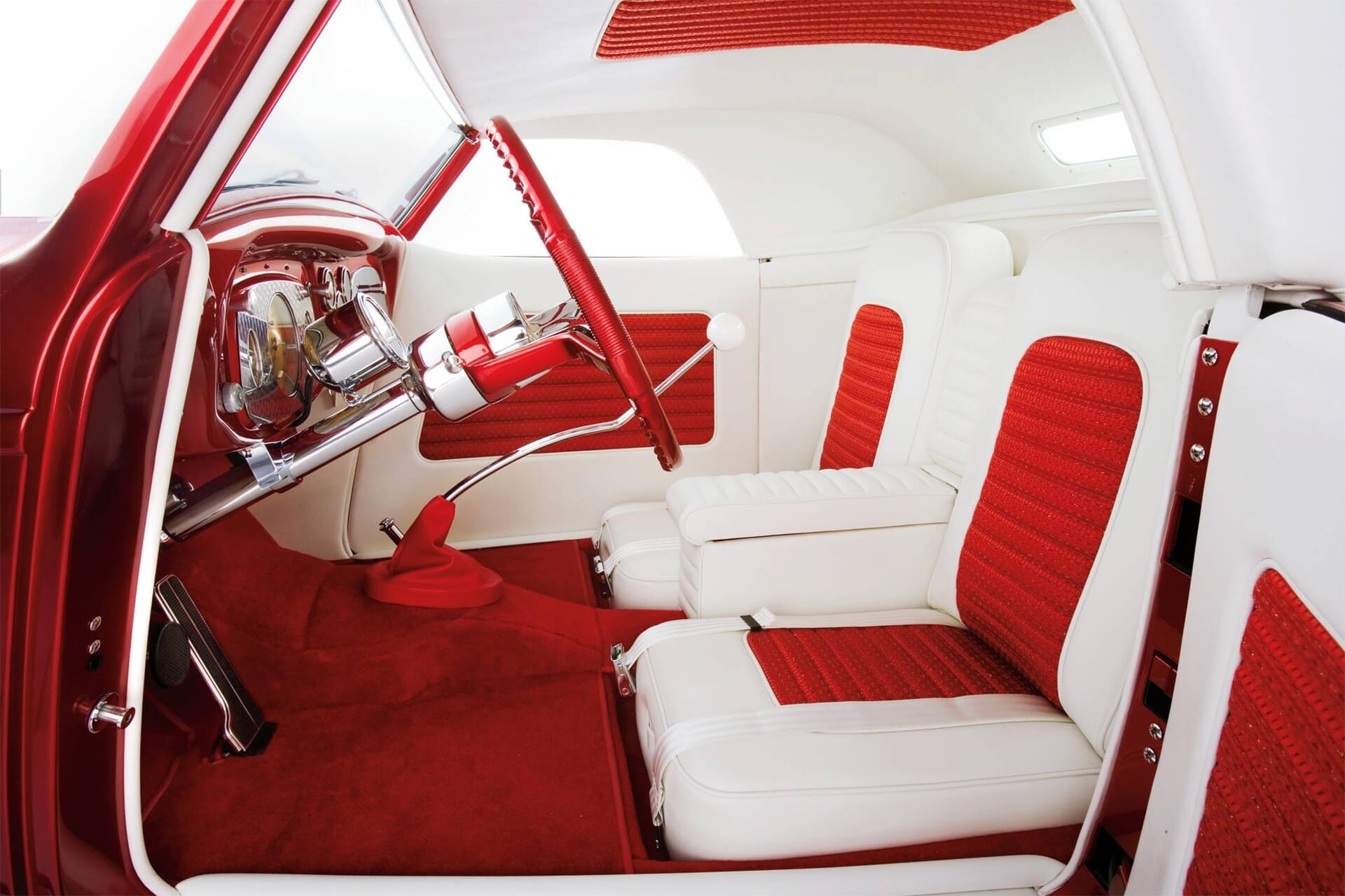 Suivant un thème les frères ont extrait la queue d’une Pontiac Catalina de 1959, un panneau rendu spécifique au modèle par des feux arrière plus étroits, et l’ont greffée sur le pan arrière de la carrosserie. C’était un rétrécissement important pour s’adapter à la carrosserie plus petite et des inserts de feux arrière en acrylique ont masqué ses origines. Les frères ont encadré le nez dans des tubes d’acier et l’ont recouvert de tôles d’acier fraîchement laminées. Quatre baquets de phares, décalés comme une Imperial du début des années ’60 et inclinés comme les phares d’une Lincoln de la fin des années “50, flanquaient ce nez… “Il a fait sa propre grille” précise Alexander : “Il n’avait pas tout à fait l’argent, mais encore une fois, nous n’avons jamais facturé autant, nous étions de terribles hommes d’affaires. Il nous a donc demandé d’y mettre un filet et il l’a rempli de boutons de tiroir”. Le cabriolet de Don bénéficiait d’une technique assez nouvelle pour l’époque : la peinture bonbon. Les frères ont appliqué une base dorée sur laquelle ils ont embué plusieurs couches de rouge translucide… “Quand nous l’avons eu, nous avons juste construit un toit Carson à partir des montants A”, révèle Alexander. “Si je me souviens bien, ça ne s’est pas détaché”.